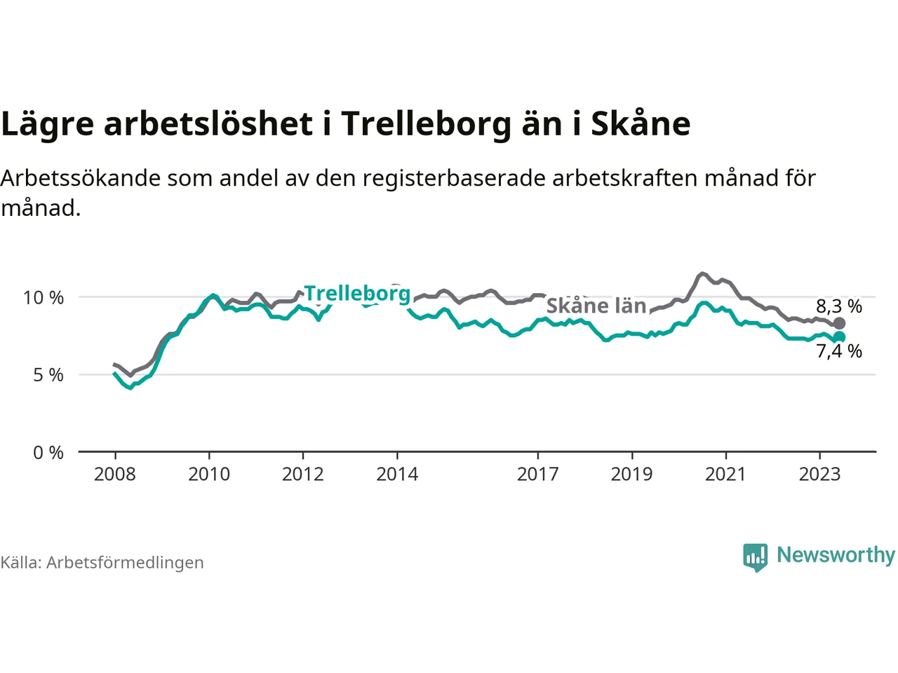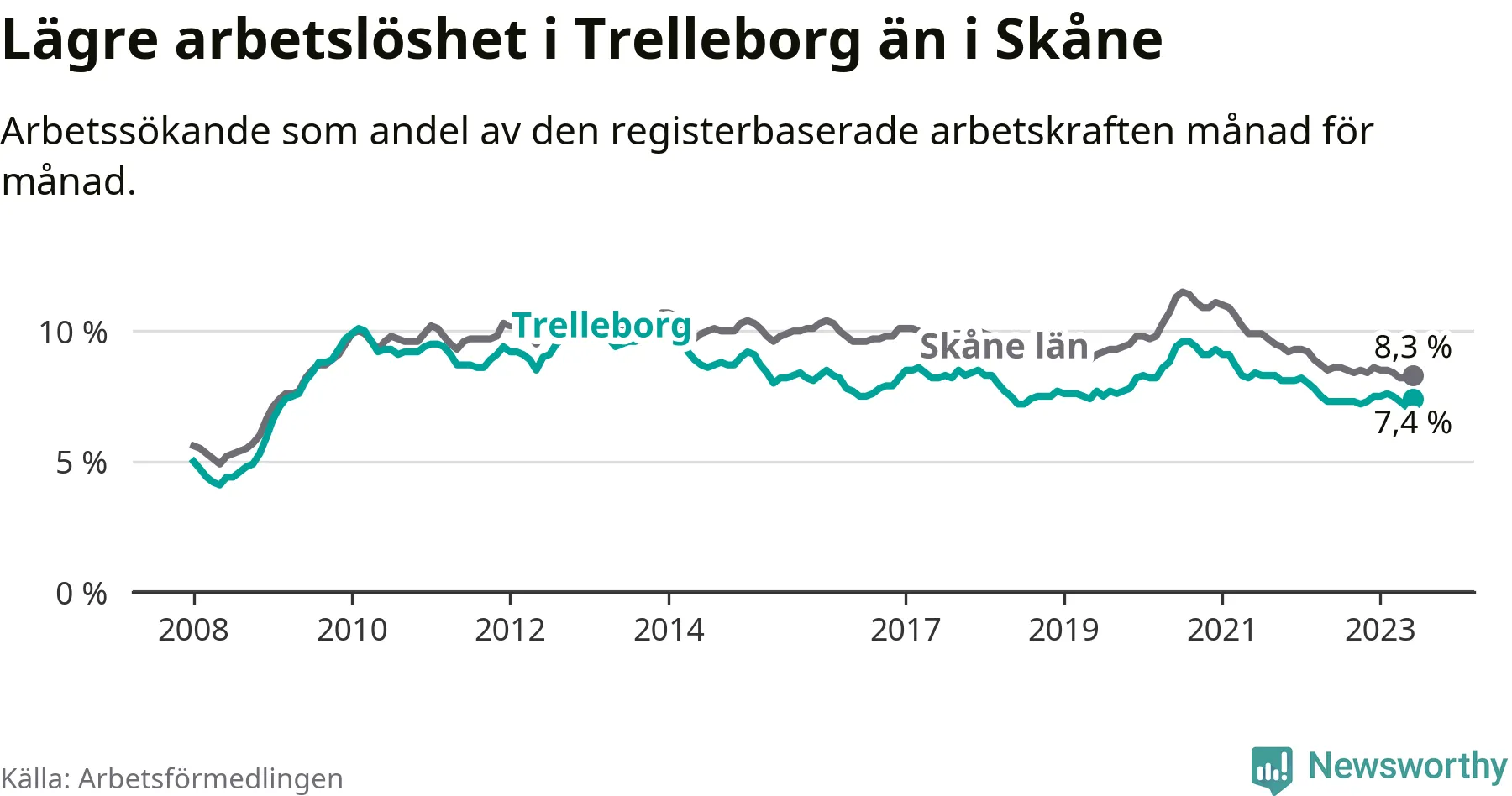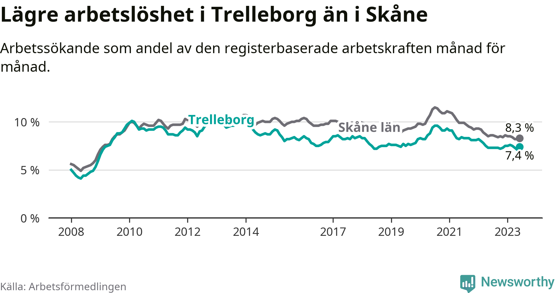 Graf: Arbetslöshet i Trelleborgs kommun och Skåne län