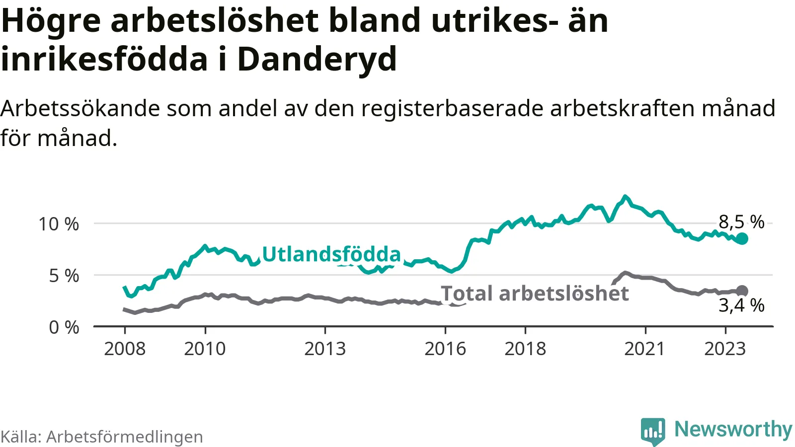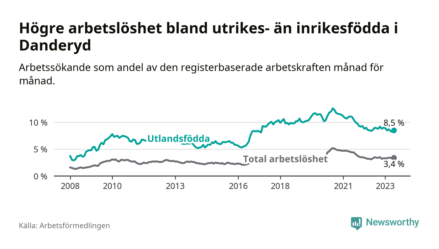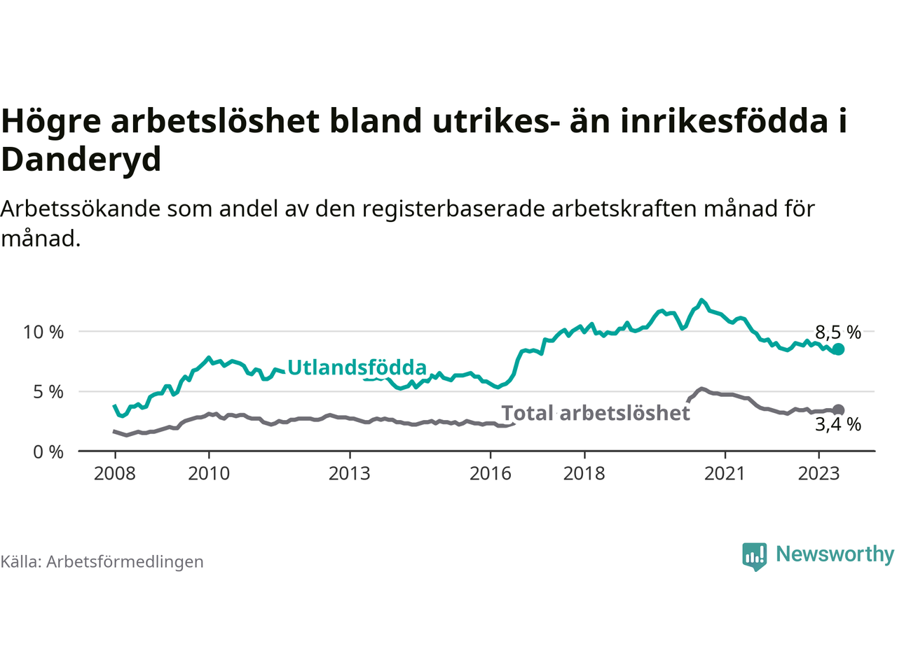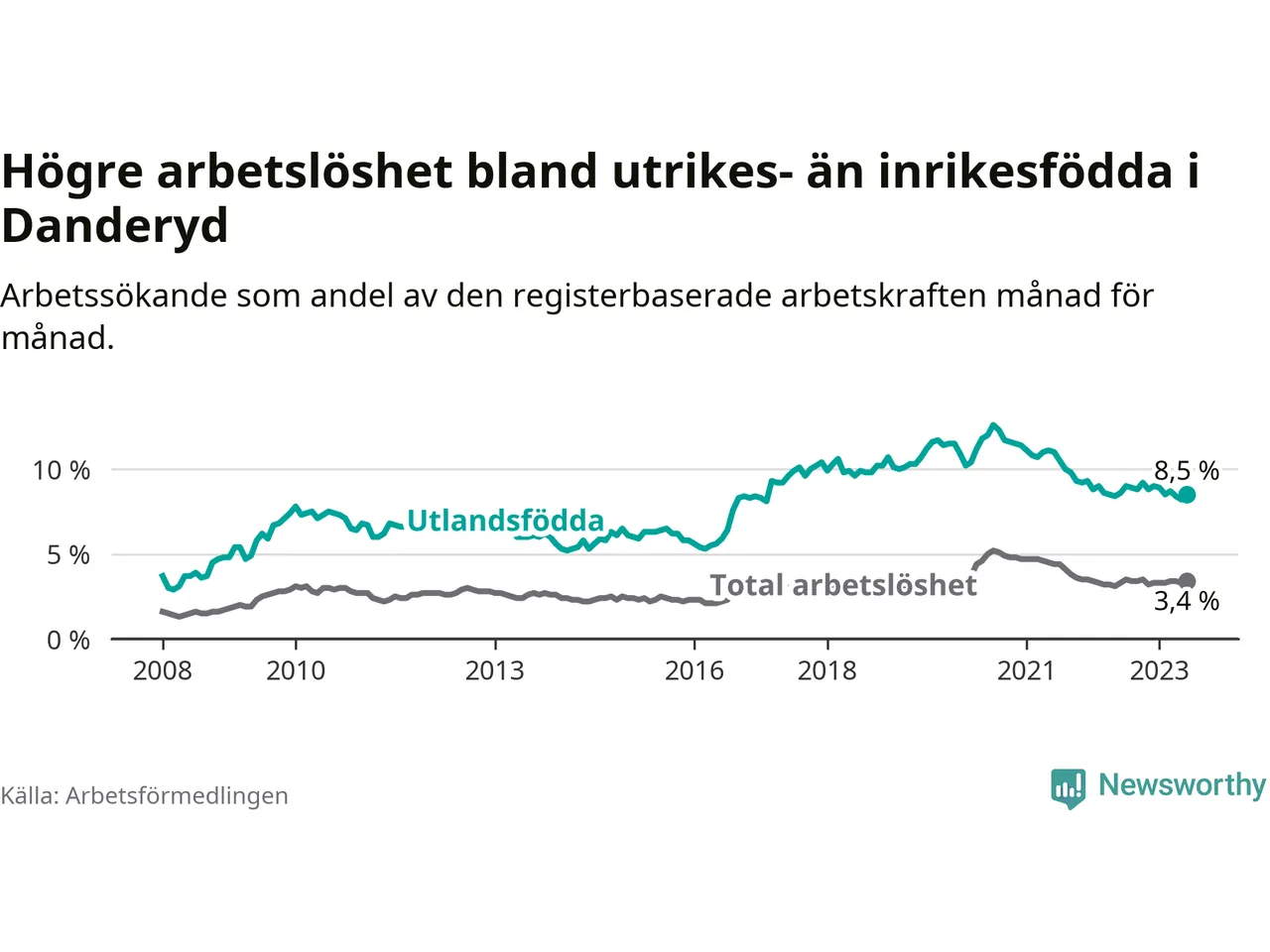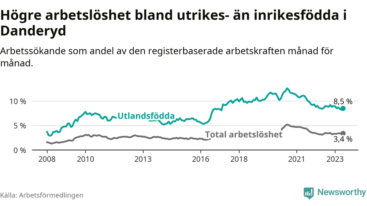 | Bland utlandsfödda | 8,5 % | −0,1 % ▼ | 11,9 % | −1,0 % ▼ | 15,0 % | −1,5 % ▼ |