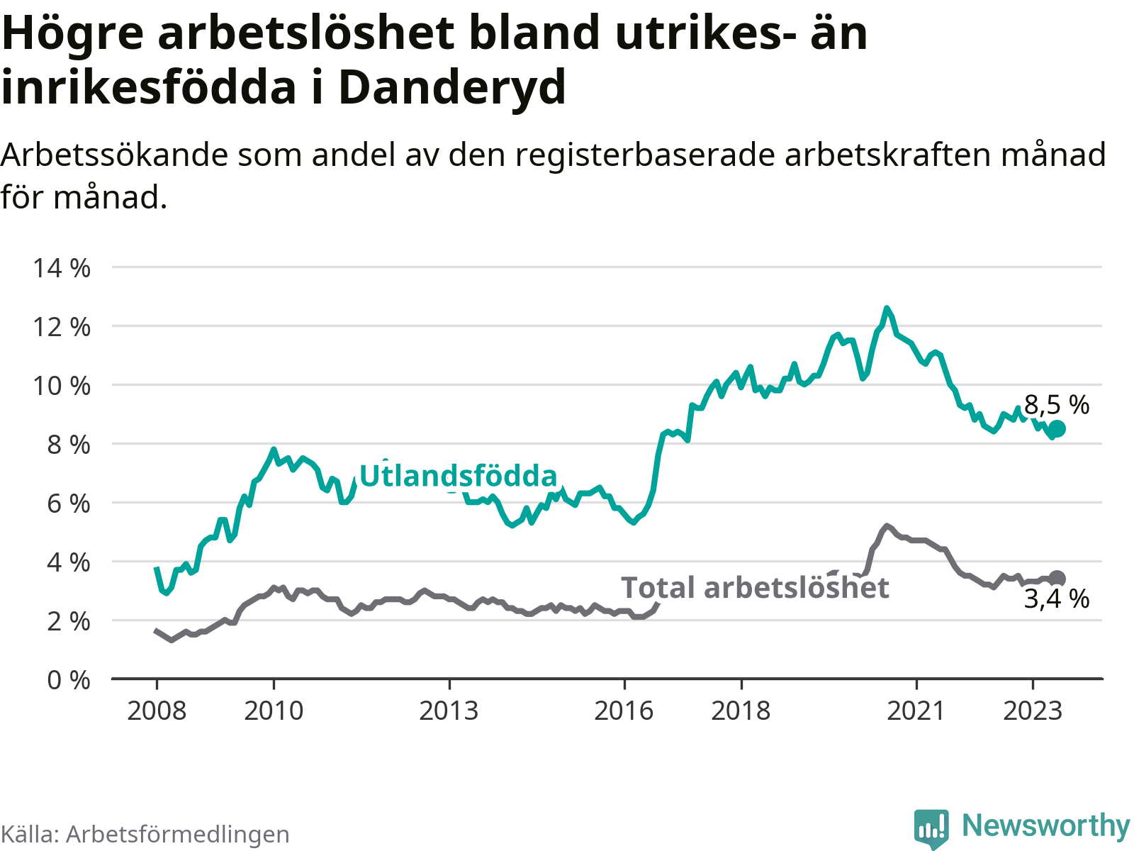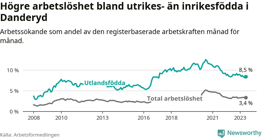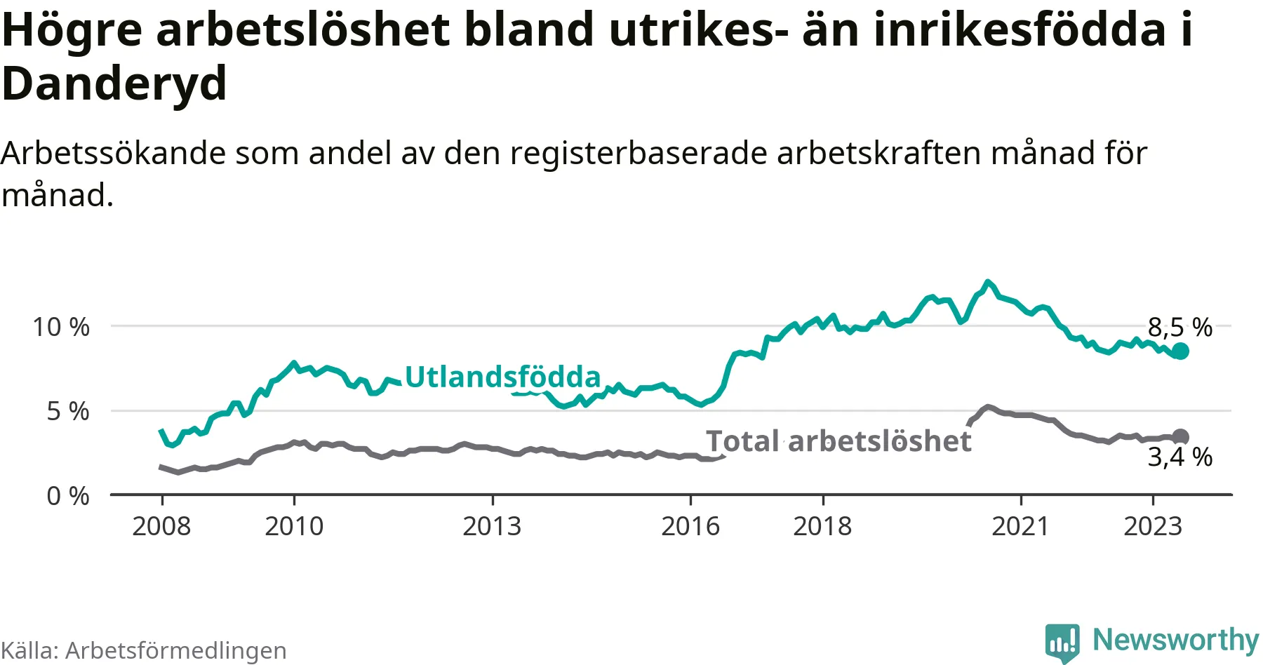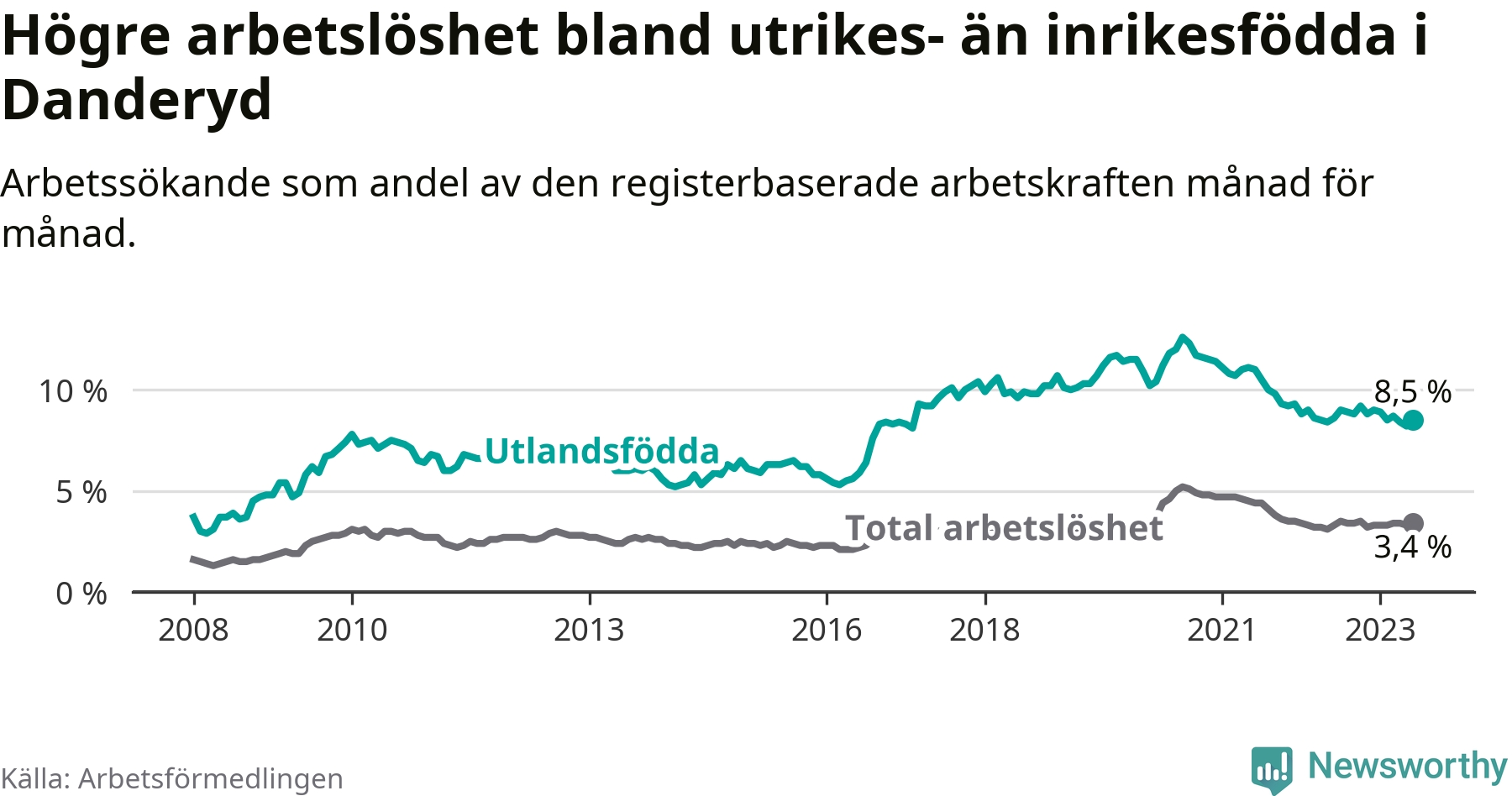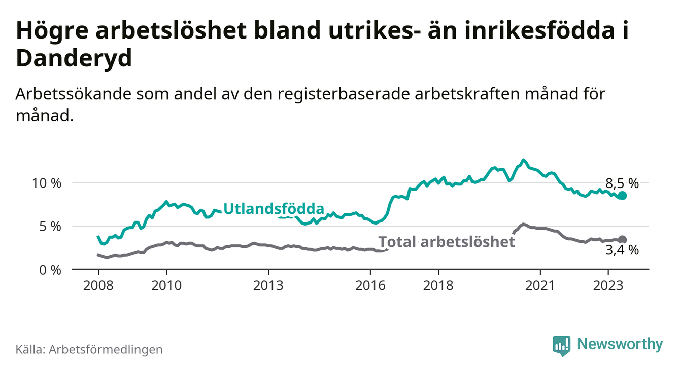 | Bland utlandsfödda | 8,5 % | −0,1 % ▼ | 11,9 % | −1,0 % ▼ | 15,0 % | −1,5 % ▼ |