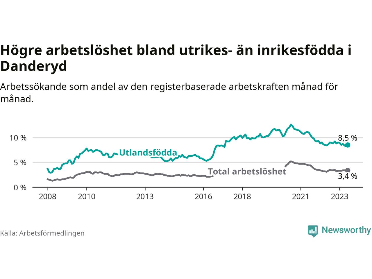 Arbetslösheten bland utlandsfödda var 8,5 procent i Danderyd under juni månad, motsvarande 246 av 2 894 personer. Det är 0,1 procentenheter färre än vid samma tidpunkt i fjol (+7 om man räknar personer).