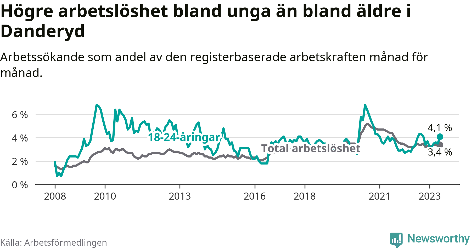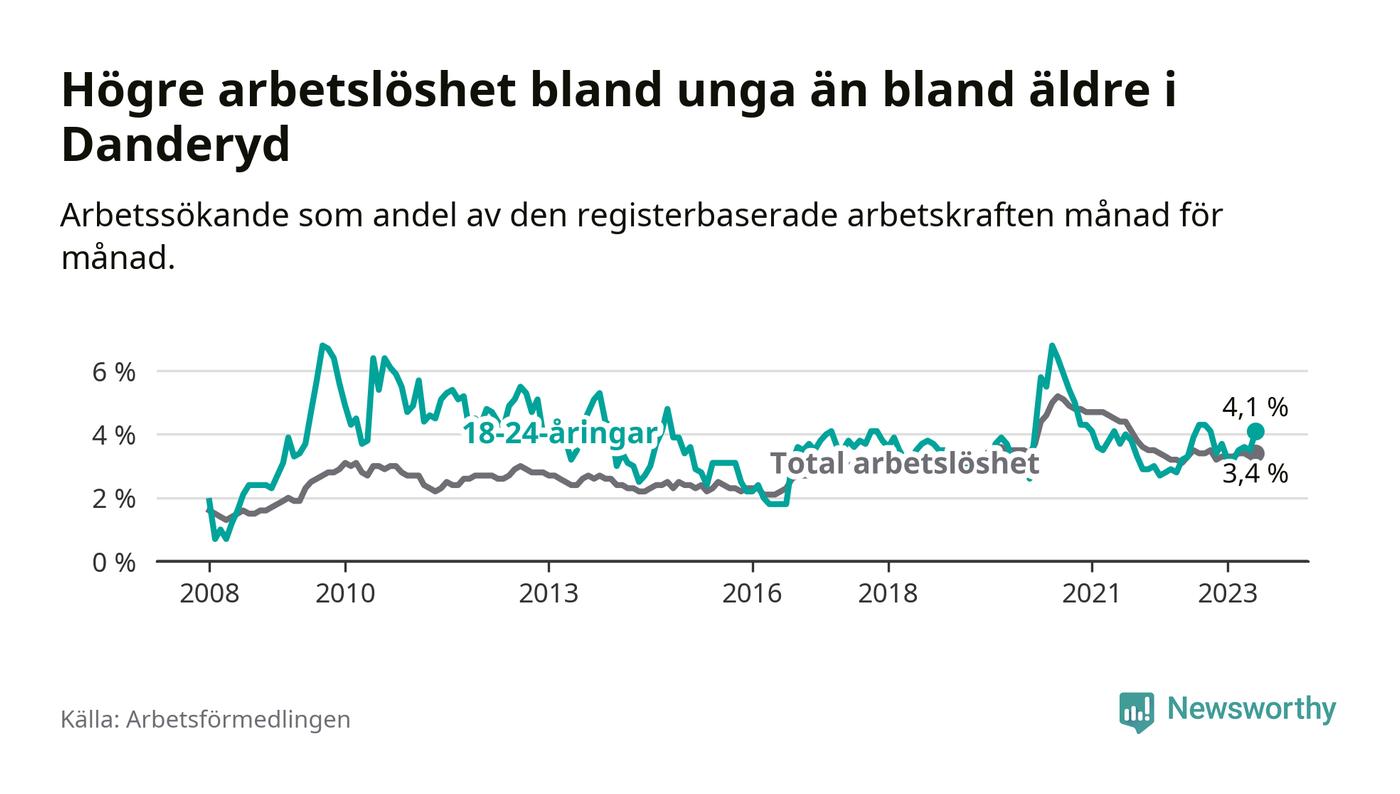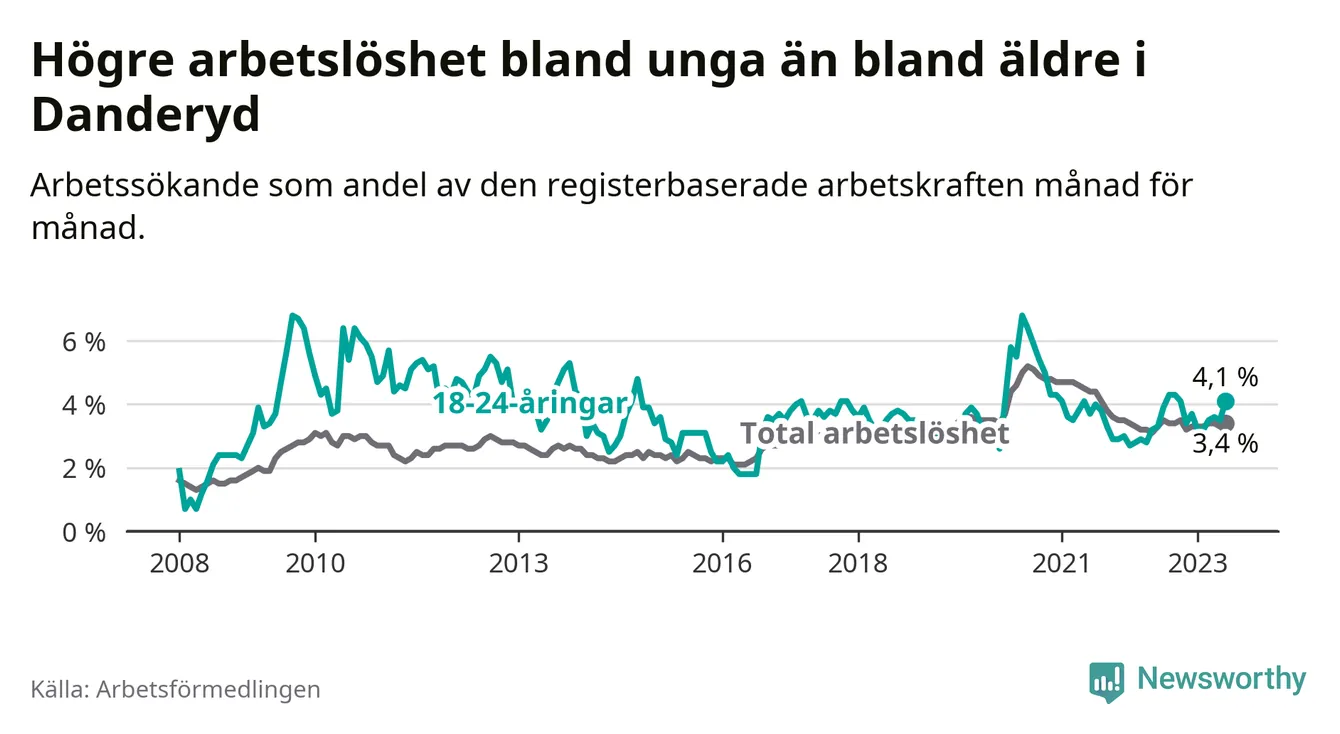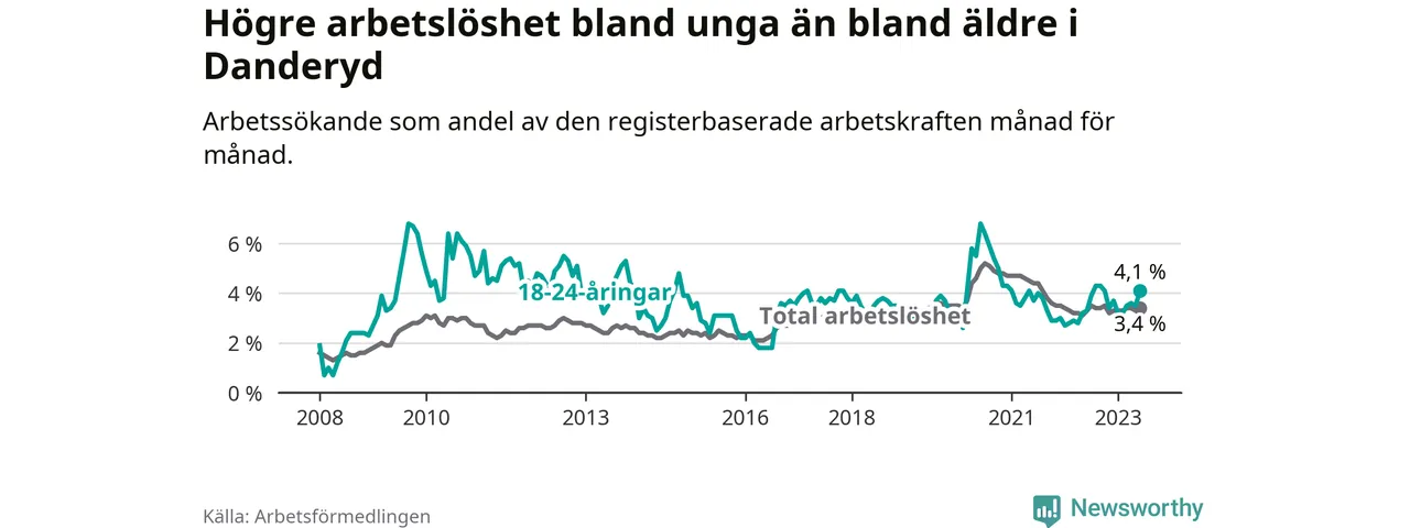 I och med den senaste månadens uppgång har de ungas arbetslöshet i Danderyd stigit elva månader i följd (upp från 3,9 procent i juli 2022 till 4,1 procent nu).