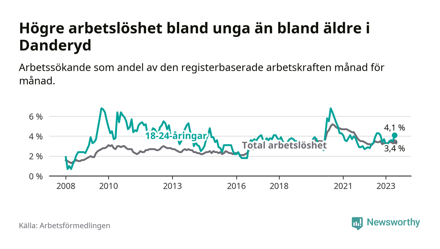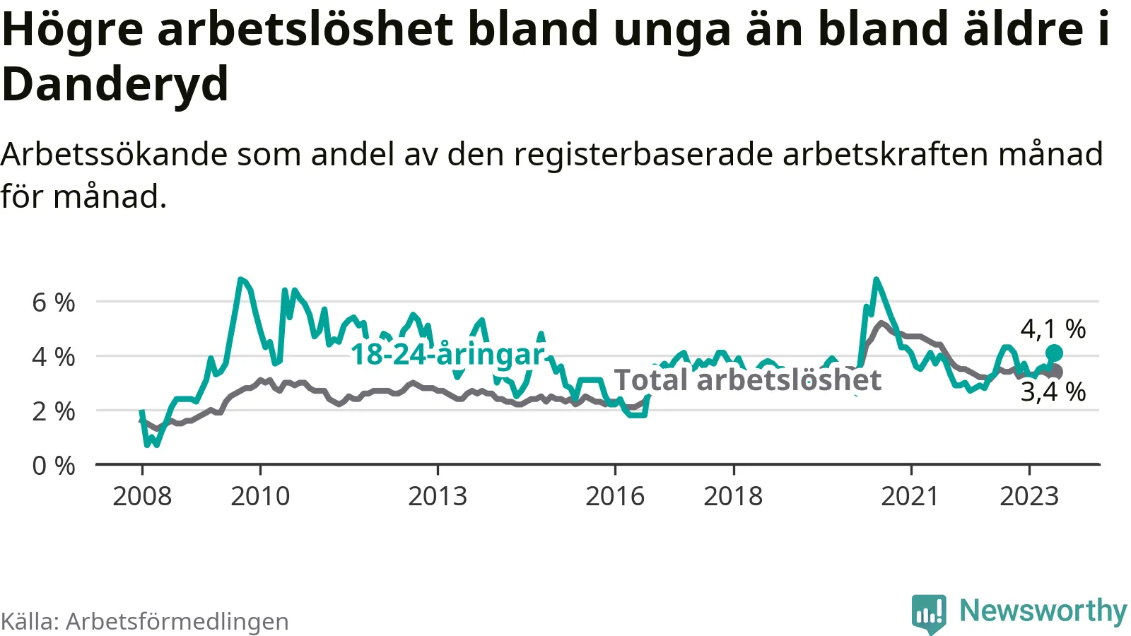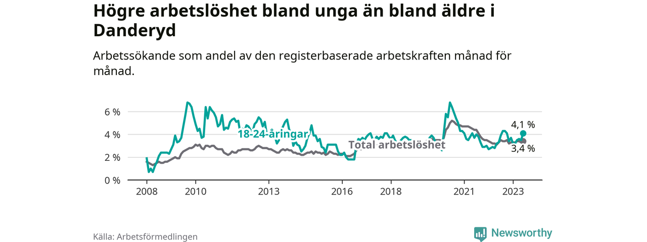 I och med den senaste månadens uppgång har de ungas arbetslöshet i Danderyd stigit elva månader i följd (upp från 3,9 procent i juli 2022 till 4,1 procent nu).
