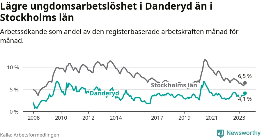 Precis som den totala arbetslösheten ligger ungdomsarbetslösheten i Danderyd lägre än i Stockholms län som helhet. Skillnaden mellan kommunen och länet är 2,4 procentenheter.