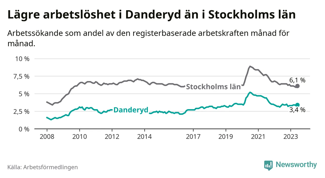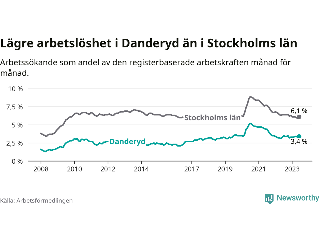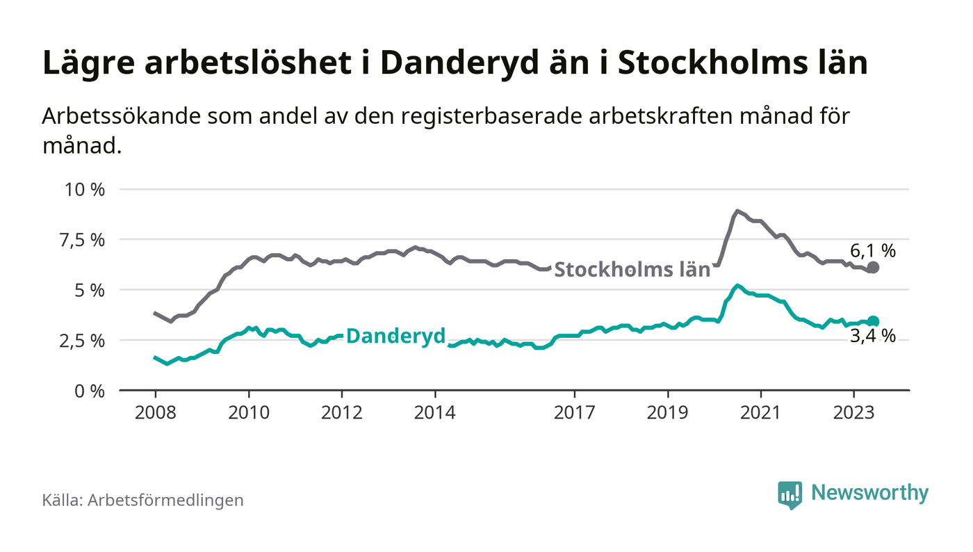 Även om arbetslösheten i Danderyd alltså ökar, så ligger den fortfarande under snittet i hela Stockholms län (3,4 procent i kommunen, jämfört med 6,1 procent i hela länet). Vaxholm har den lägsta arbetslösheten i länet (3,1 procent), medan Botkyrka har den högsta (10,3 procent). För att Danderyd skulle komma ner i samma arbetslöshetsnivå som Vaxholm skulle 44 personer behöva sysselsättas.
