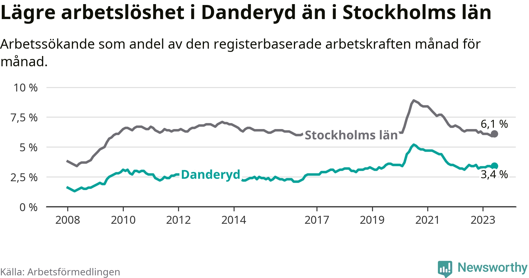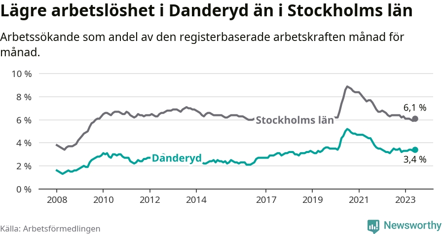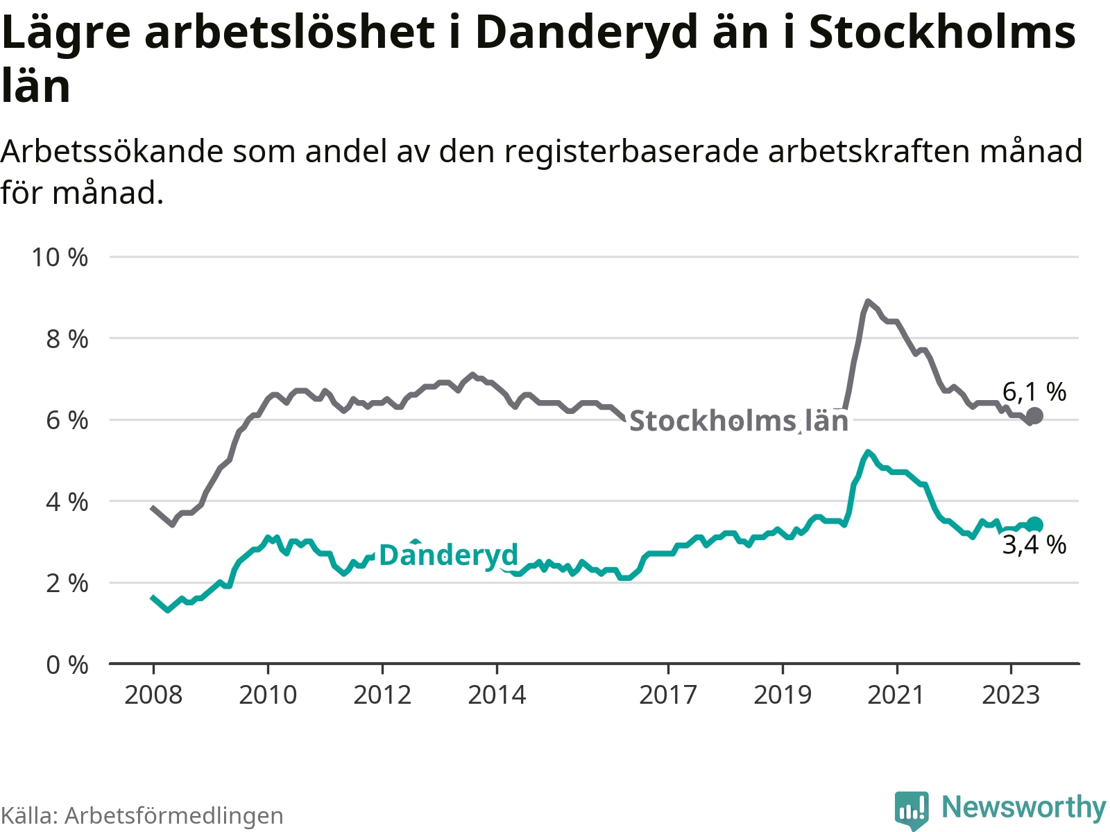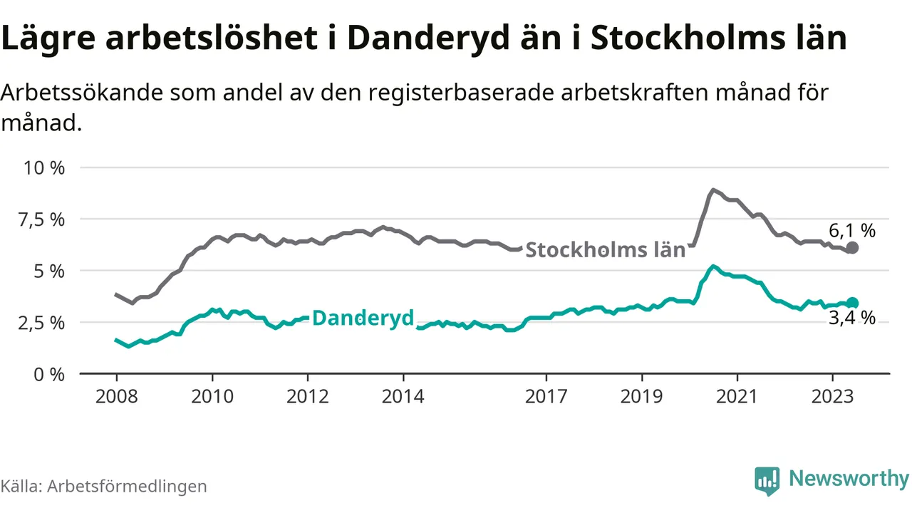Även om arbetslösheten i Danderyd alltså ökar, så ligger den fortfarande under snittet i hela Stockholms län (3,4 procent i kommunen, jämfört med 6,1 procent i hela länet). Vaxholm har den lägsta arbetslösheten i länet (3,1 procent), medan Botkyrka har den högsta (10,3 procent). För att Danderyd skulle komma ner i samma arbetslöshetsnivå som Vaxholm skulle 44 personer behöva sysselsättas.