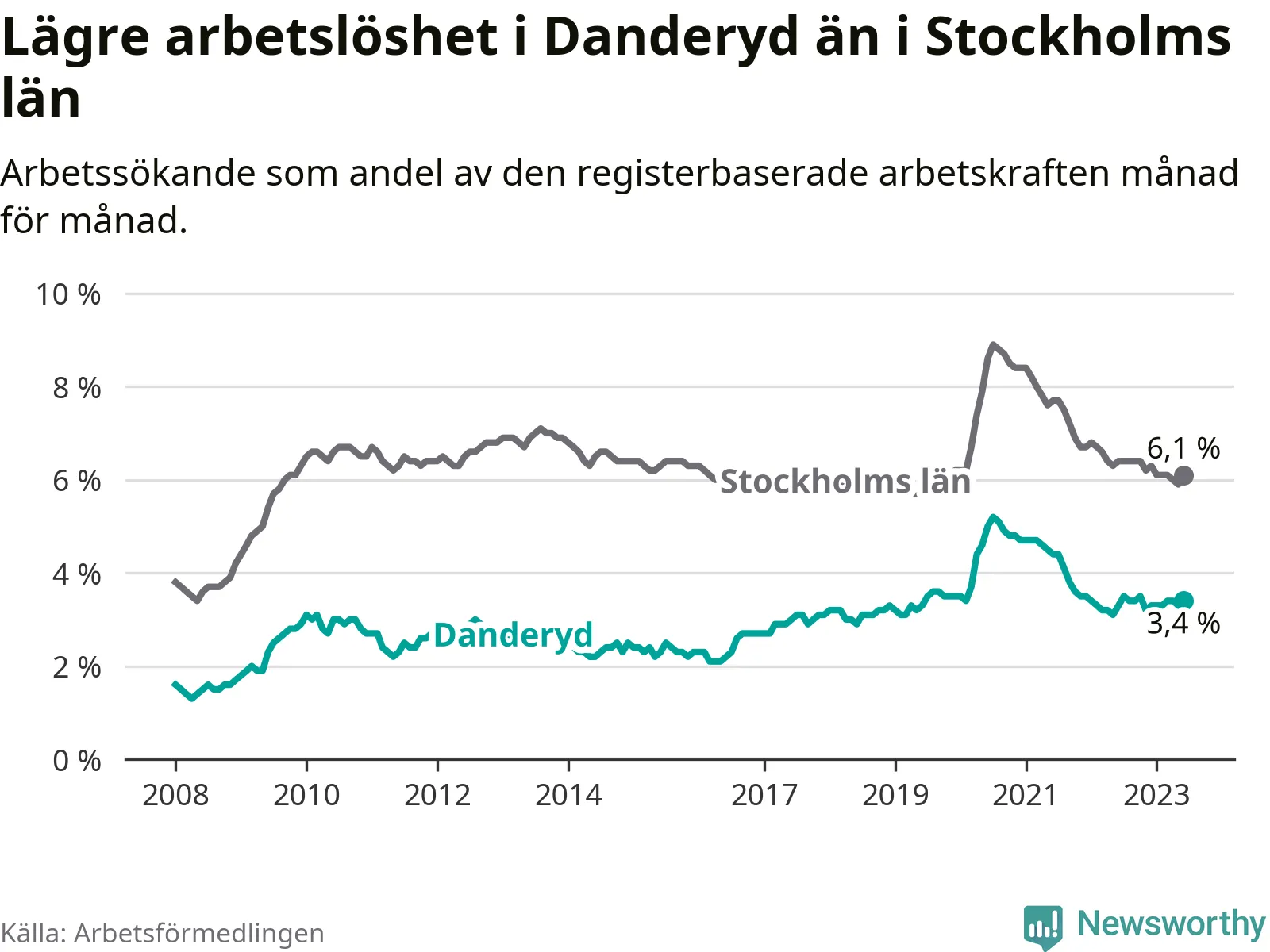 Danderyd går därmed mot strömmen i förhållande till andra kommuner i Stockholms län. I de flesta andra kommuner i länet går arbetslösheten nedåt. Störst är minskningen i Södertälje, där arbetslösheten sjunker med 1,2 procentenheter. I tabellen längre ner ser du utvecklingen i samtliga kommuner i länet.