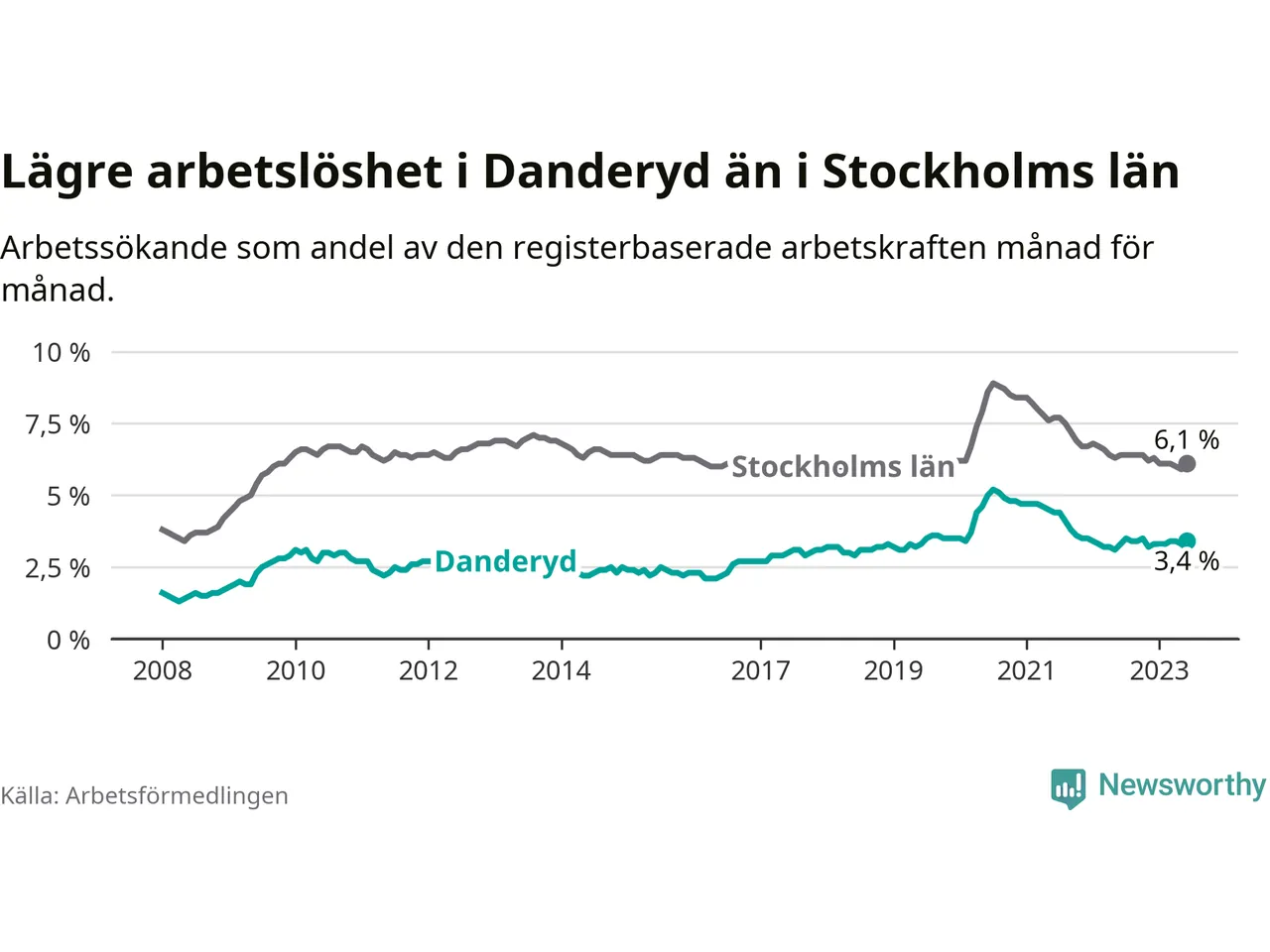 Under juni månad rapporterade Danderyds kommun en total arbetslöshet på 3,4 procent. Det är en ökning jämfört med samma tidpunkt i fjol (+0,1 procentenheter). I Stockholms län däremot sjunker arbetslösheten .