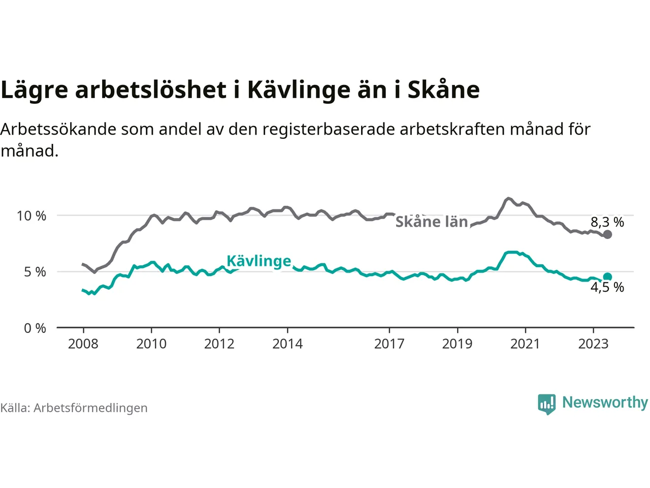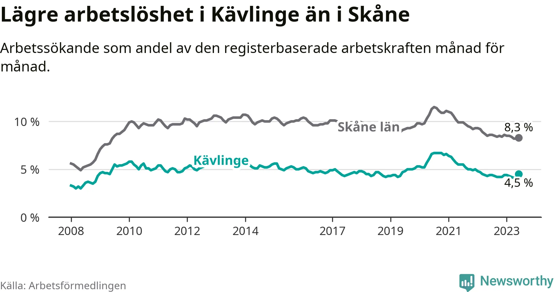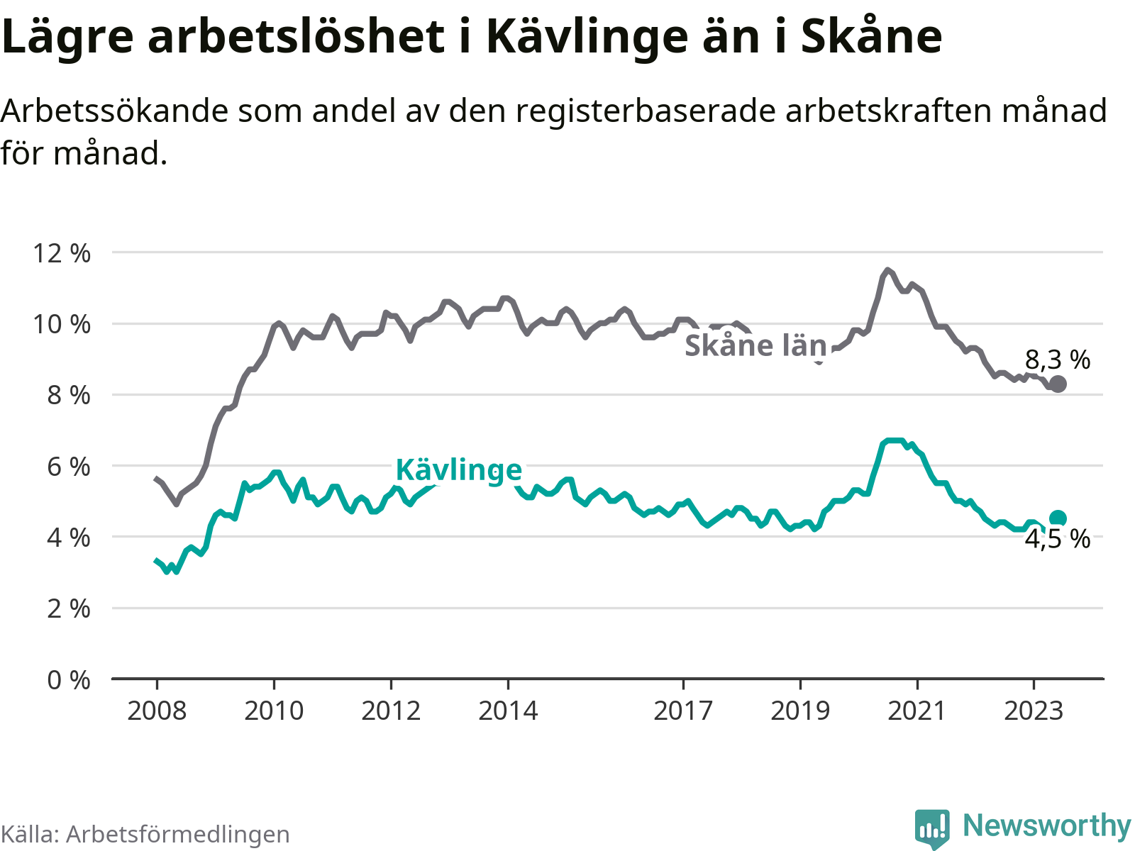 I de flesta andra kommuner i länet går arbetslösheten nedåt. Störst är minskningen i Eslöv, där arbetslösheten sjunker med 1,1 procentenheter. I tabellen längre ner ser du utvecklingen i samtliga kommuner i länet.