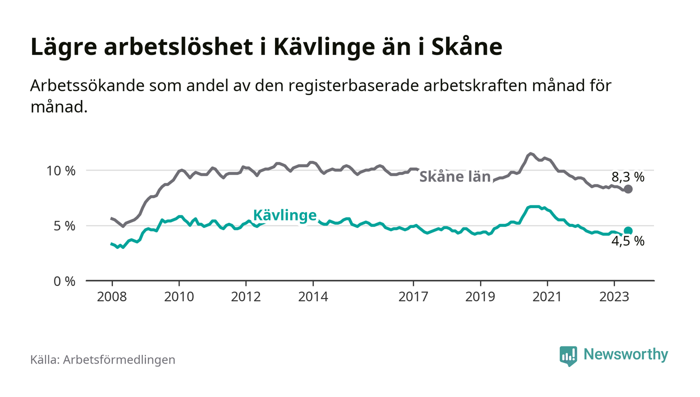 Även om arbetslösheten i Kävlinge alltså ökar, så ligger den fortfarande under snittet i hela Skåne län (4,5 procent i kommunen, jämfört med 8,3 procent i hela länet). Vellinge har den lägsta arbetslösheten i länet (3,2 procent), medan Perstorp har den högsta (12,3 procent). För att Kävlinge skulle komma ner i samma arbetslöshetsnivå som Vellinge skulle 207 personer behöva sysselsättas.