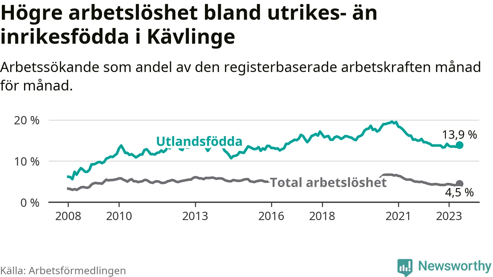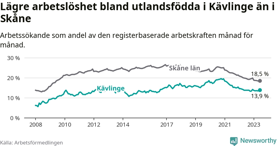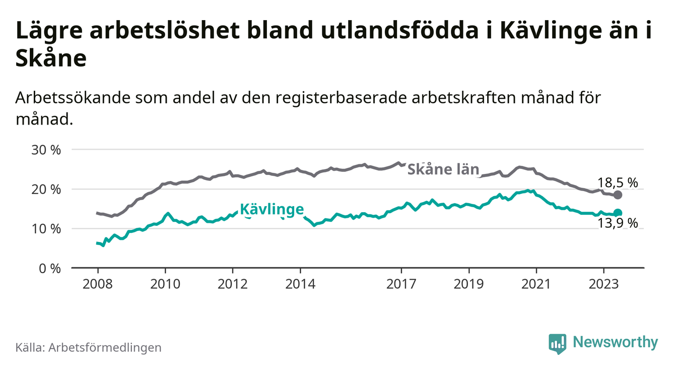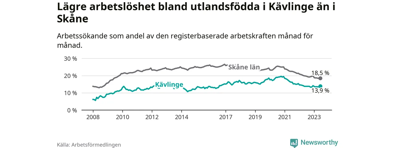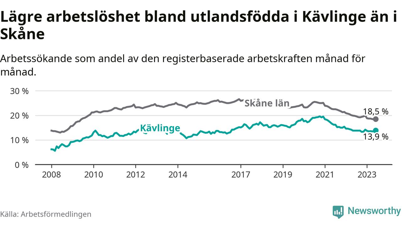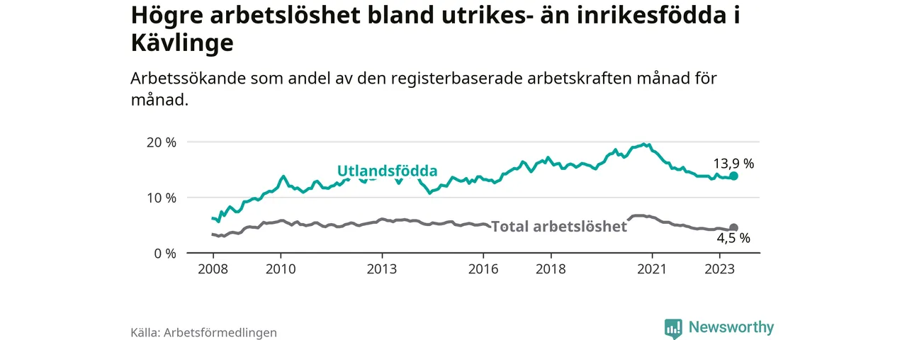 Arbetslösheten bland utlandsfödda var 13,9 procent i Kävlinge under juni månad, motsvarande 288 av 2 072 personer. Det är 0,1 procentenheter fler än vid samma tidpunkt i fjol (+23 om man räknar personer). Den senaste månadens uppgång innebär ett trendbrott. Under de 26 föregående månaderna hade arbetslösheten bland utlandsfödda varit lägre än motsvarande tidpunkt året innan.