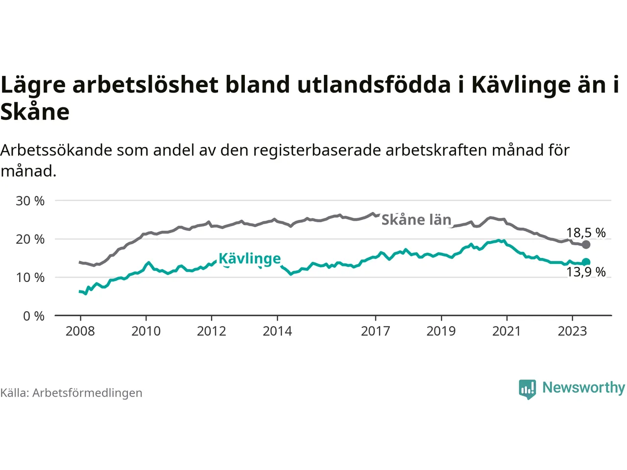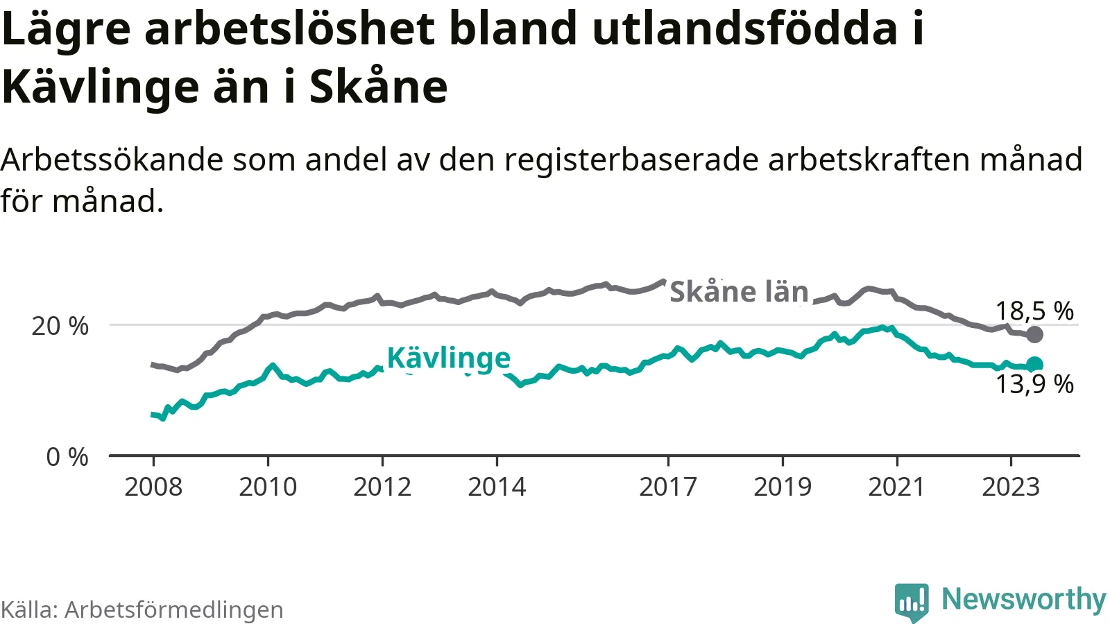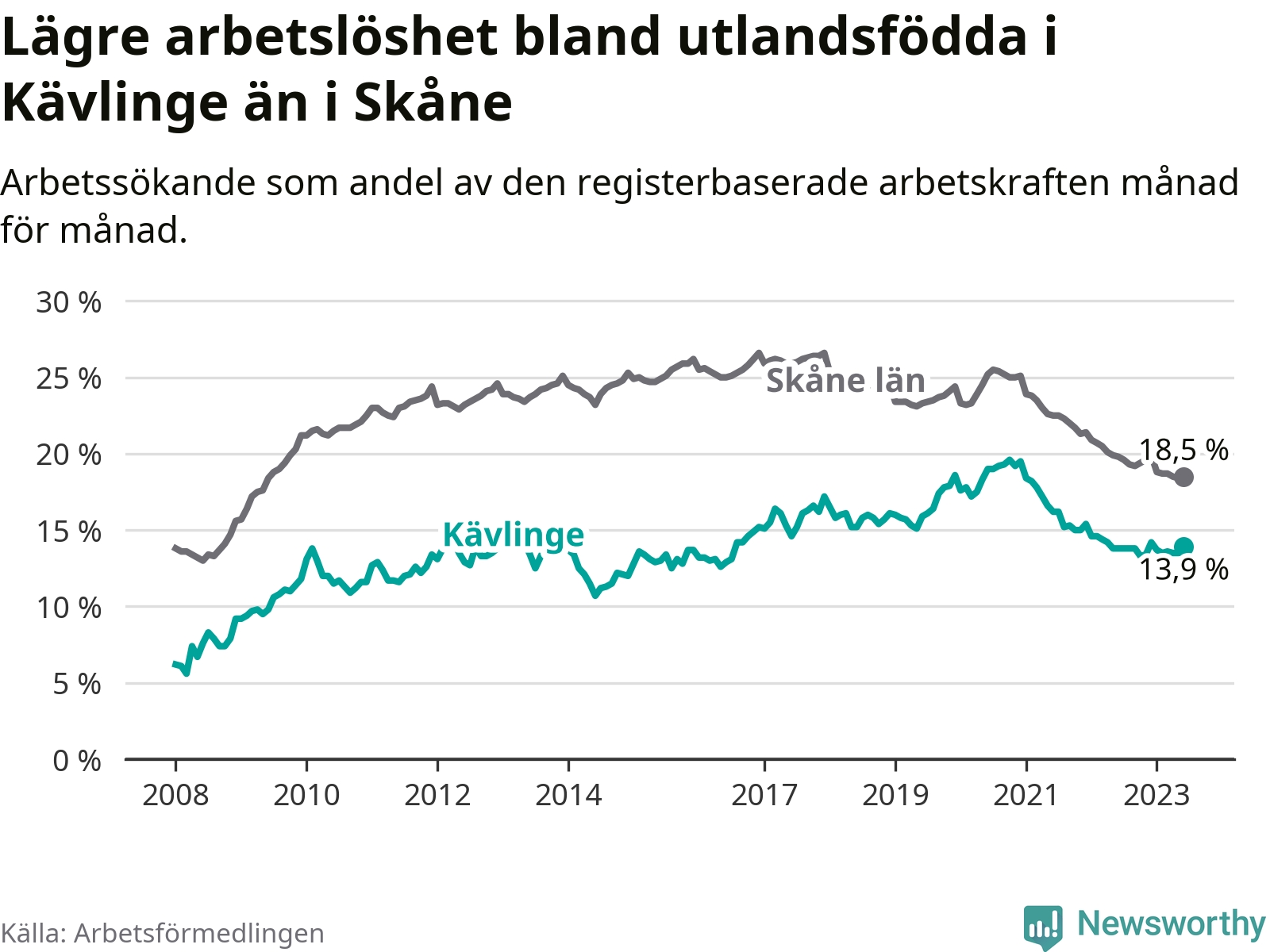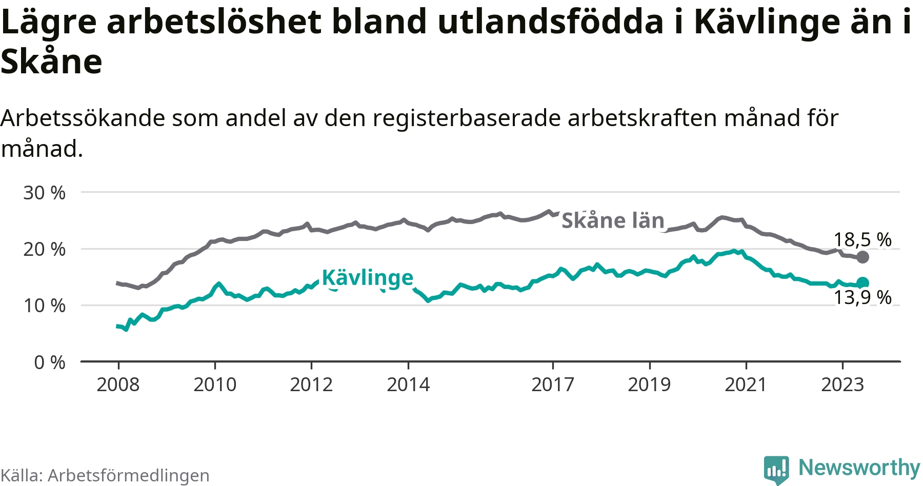 Arbetslösheten bland utlandsfödda var 13,9 procent i Kävlinge under juni månad, motsvarande 288 av 2 072 personer. Det är 0,1 procentenheter fler än vid samma tidpunkt i fjol (+23 om man räknar personer). Den senaste månadens uppgång innebär ett trendbrott. Under de 26 föregående månaderna hade arbetslösheten bland utlandsfödda varit lägre än motsvarande tidpunkt året innan.