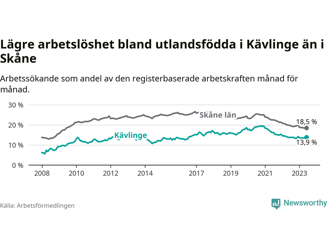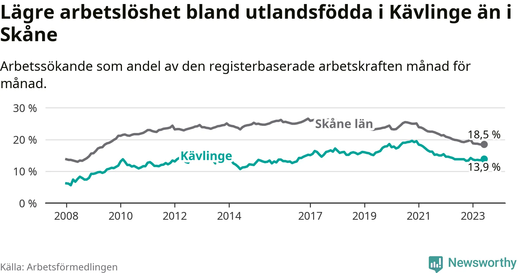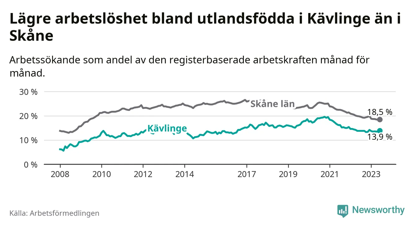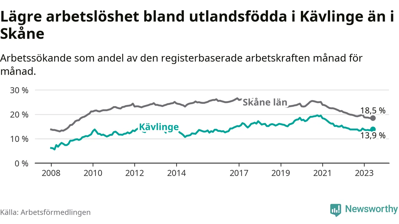 Medan arbetslösheten bland utlandsfödda alltså ökar i Kävlinge så minskar den i Skåne. Jämfört med juni förra året har andelen arbetslösa utlandsfödda i länet minskat med 1,3 procentenheter (till 18,5 procent). Trots den senaste uppgången har Kävlinge med andra ord fortfarande lägre arbetslöshet bland utlandsfödda än Skåne.