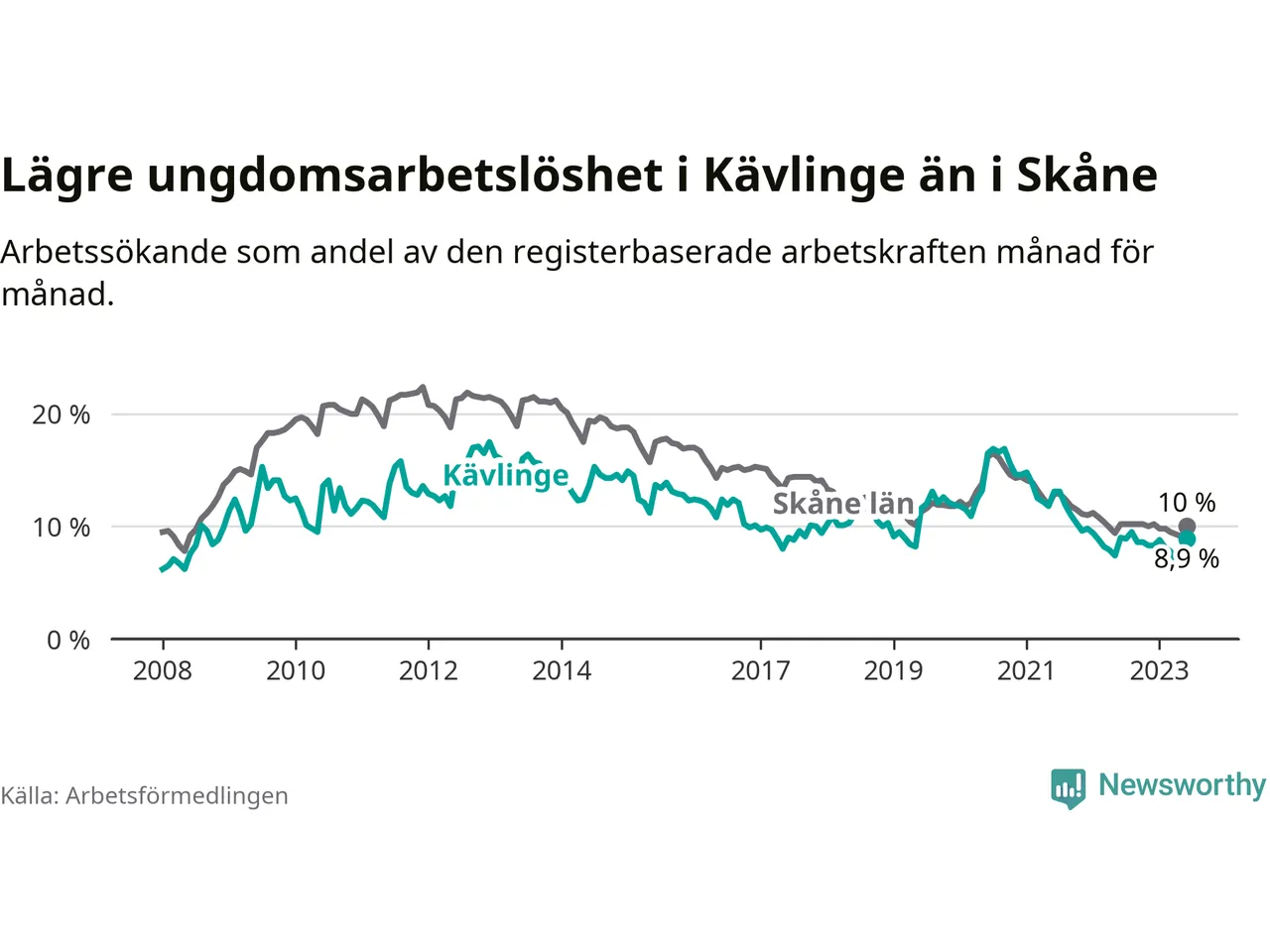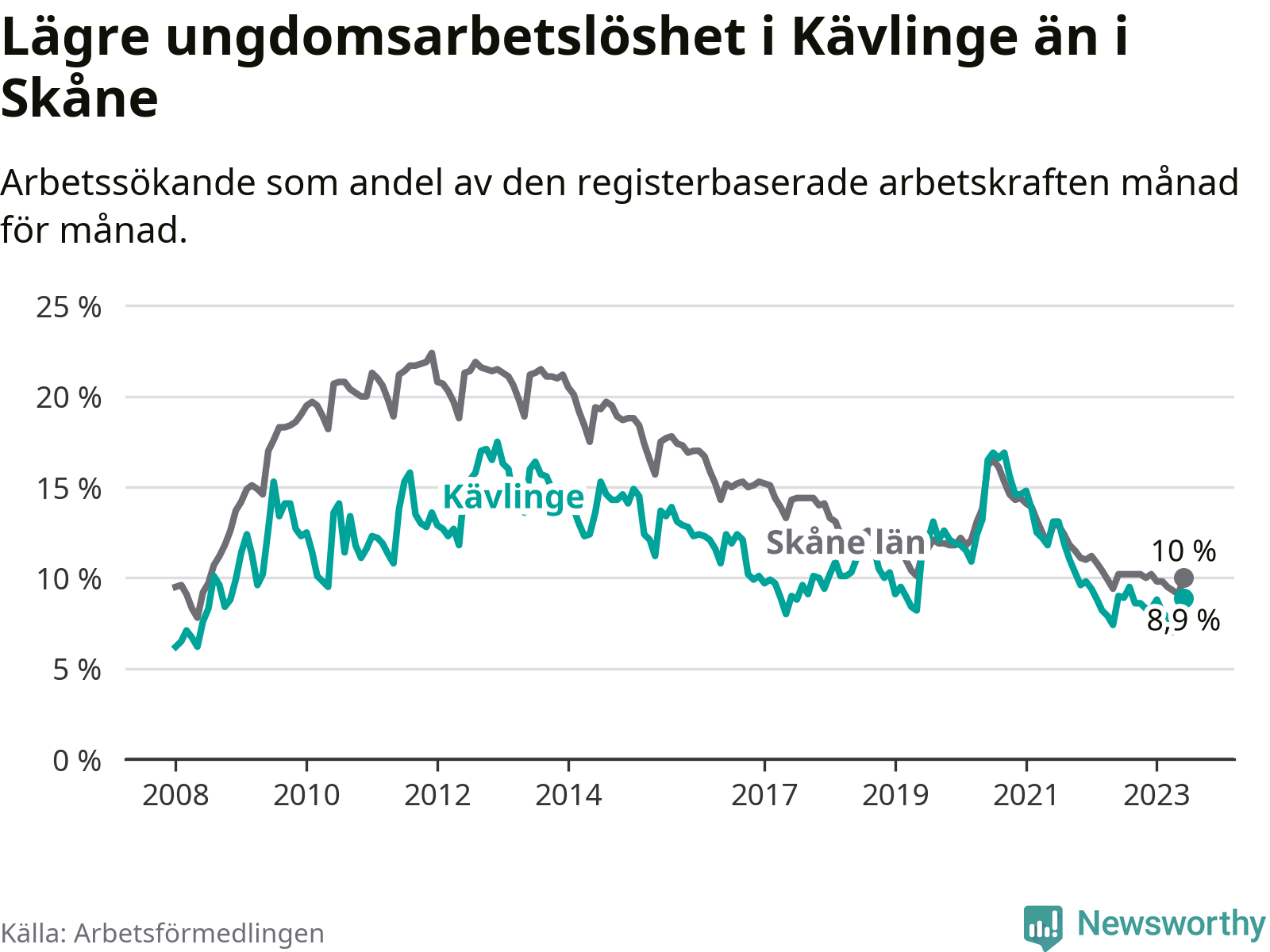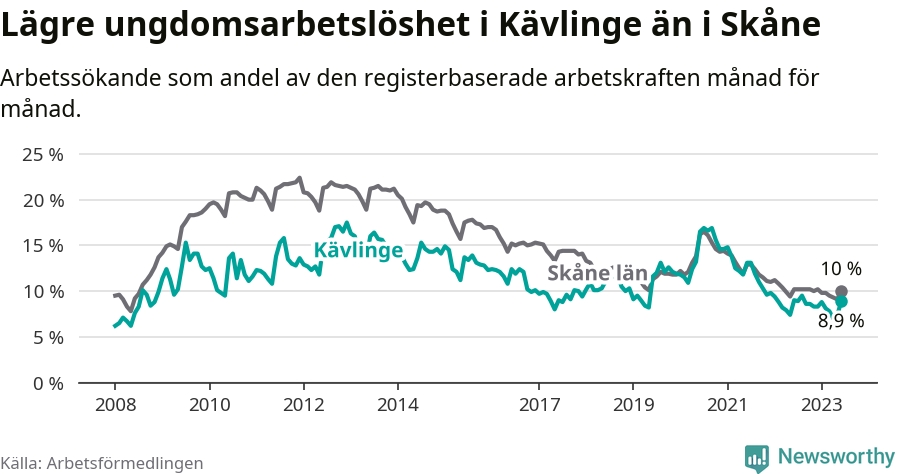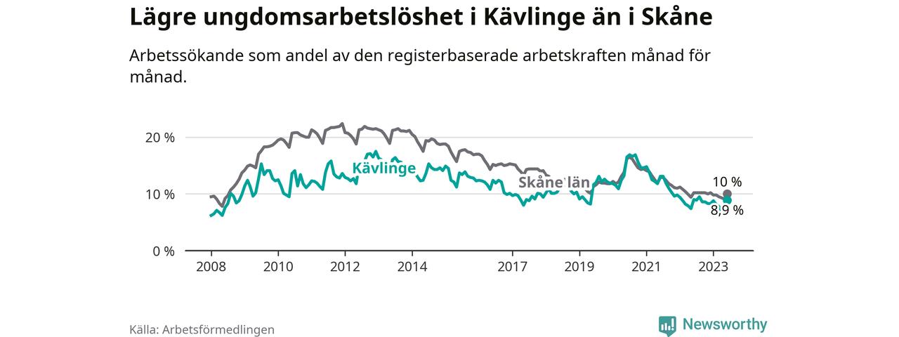 Precis som den totala arbetslösheten ligger ungdomsarbetslösheten i Kävlinge lägre än i Skåne som helhet. Skillnaden mellan kommunen och länet är 1,1 procentenheter.