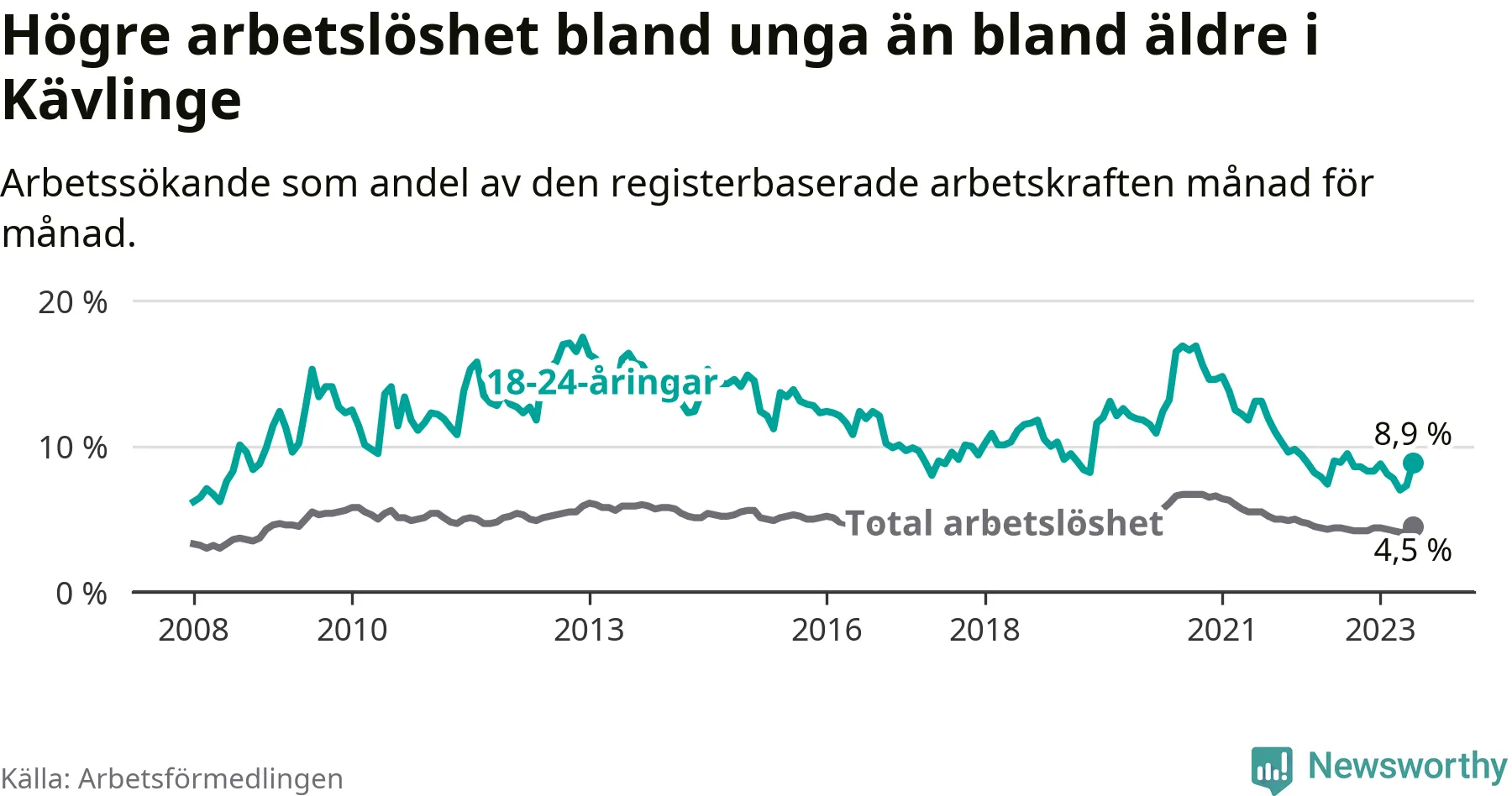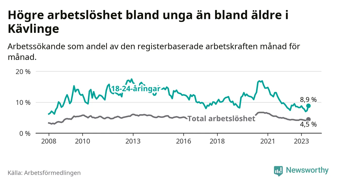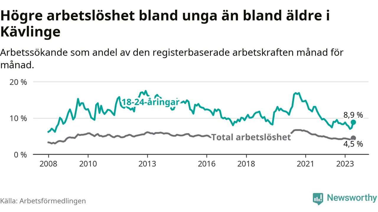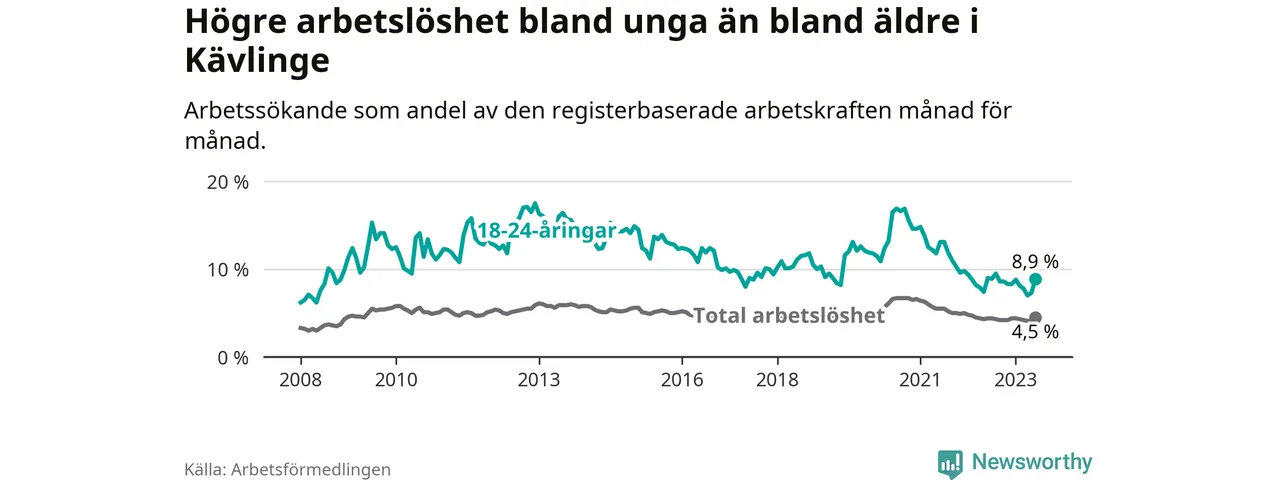 Till skillnad från den totala arbetslösheten sjunker arbetslösheten bland unga (−0,1 procentenheter). I juni var 8,9 procent av 18–24-åringarna inskrivna som arbetssökande (motsvarande 114 personer). Mäter vi antalet inskrivna ser vi en ökning med sex personer på ett års sikt.