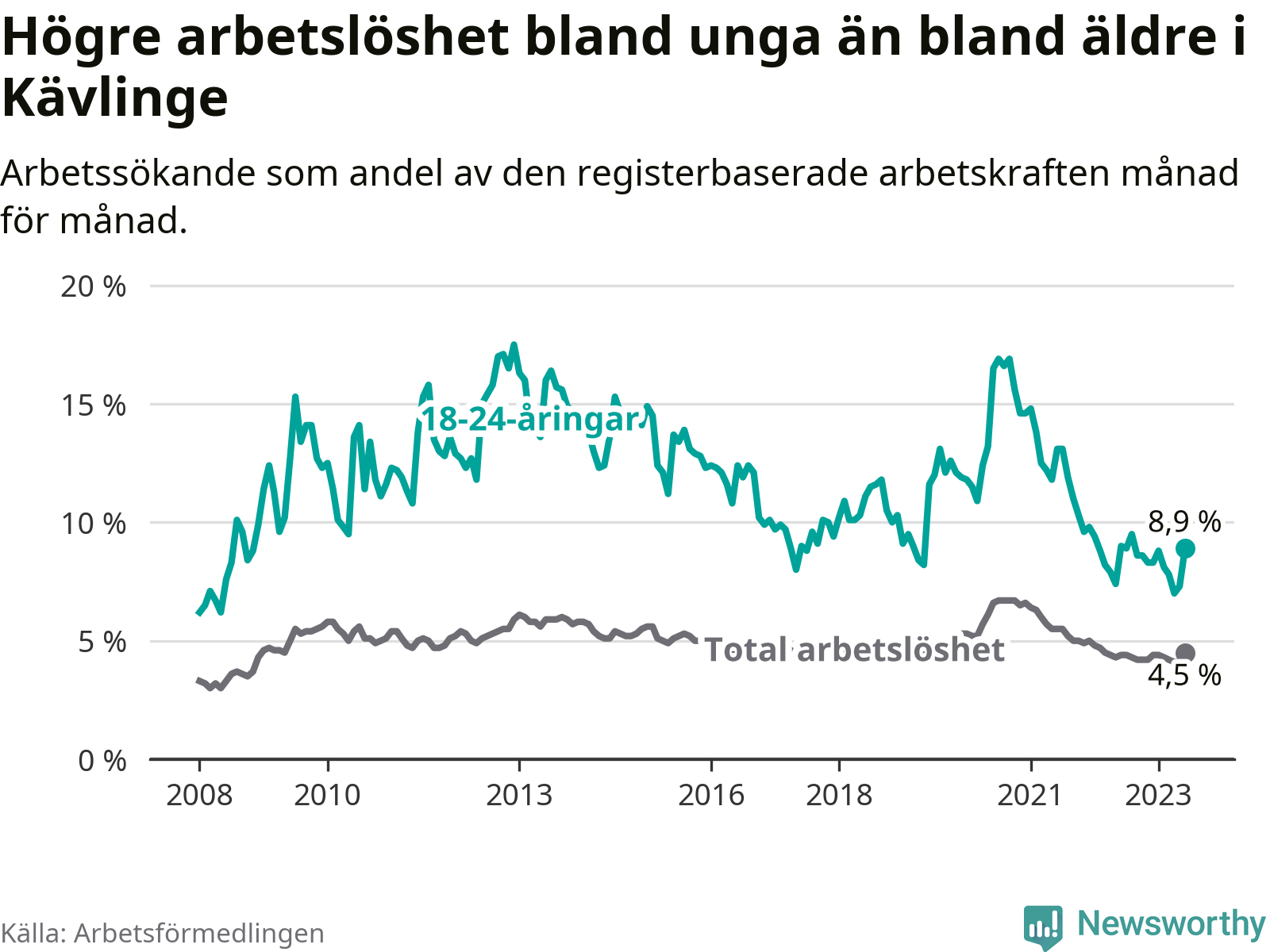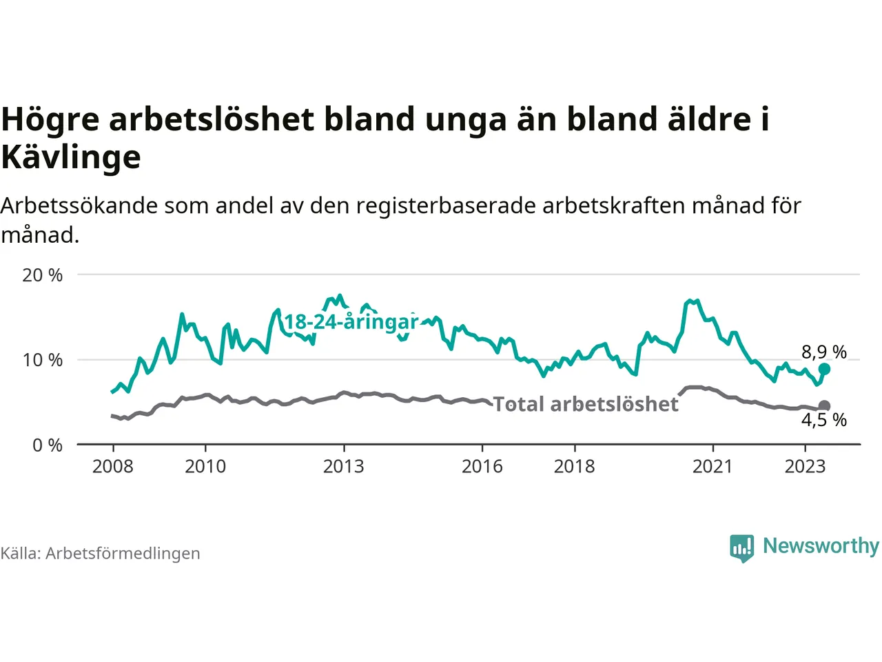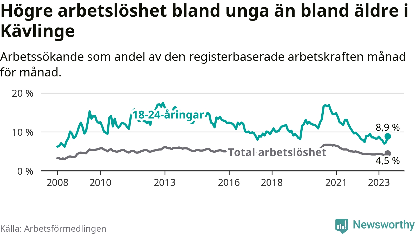 Till skillnad från den totala arbetslösheten sjunker arbetslösheten bland unga (−0,1 procentenheter). I juni var 8,9 procent av 18–24-åringarna inskrivna som arbetssökande (motsvarande 114 personer). Mäter vi antalet inskrivna ser vi en ökning med sex personer på ett års sikt.