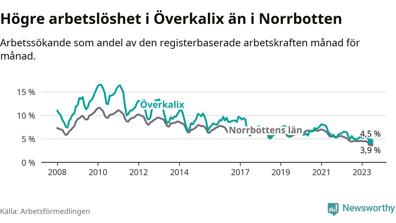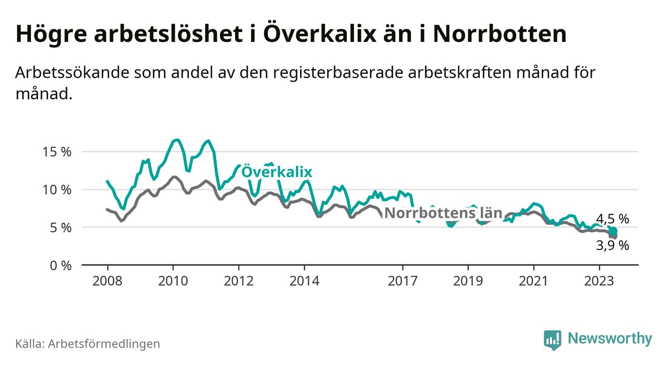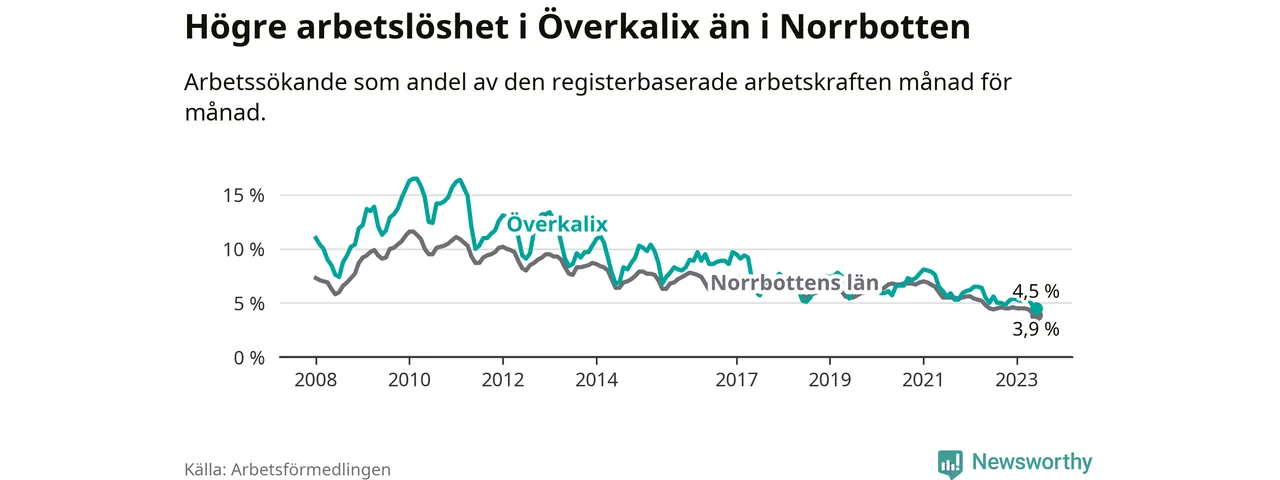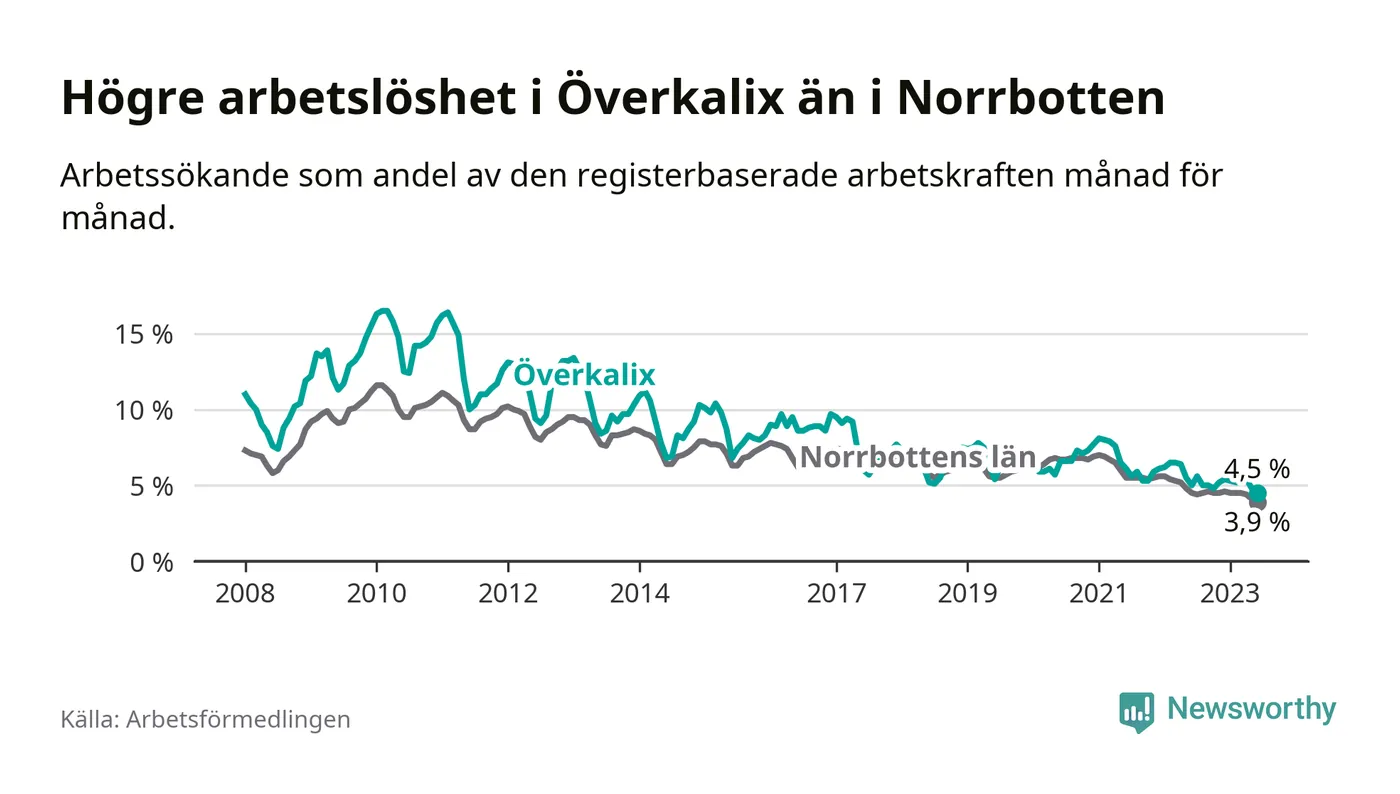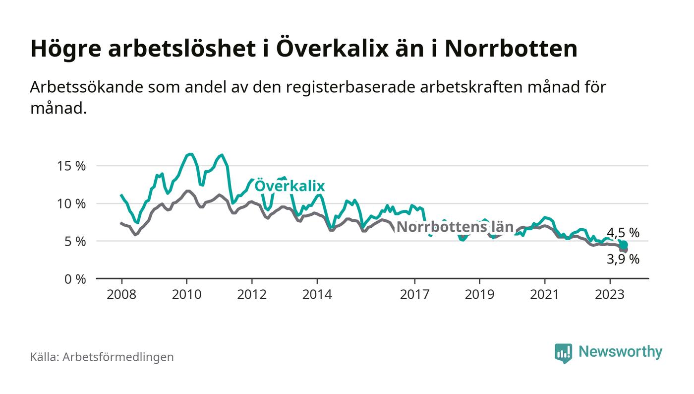 Det är elfte månaden i följd som arbetslösheten i Överkalix är lägre än den var under samma tidpunkt året innan. Sedan juli 2022 har arbetslösheten gått ner från 5,6 till 4,5 procent. Den nuvarande arbetslöshetsnivån är därmed den lägsta sedan januari 2008.