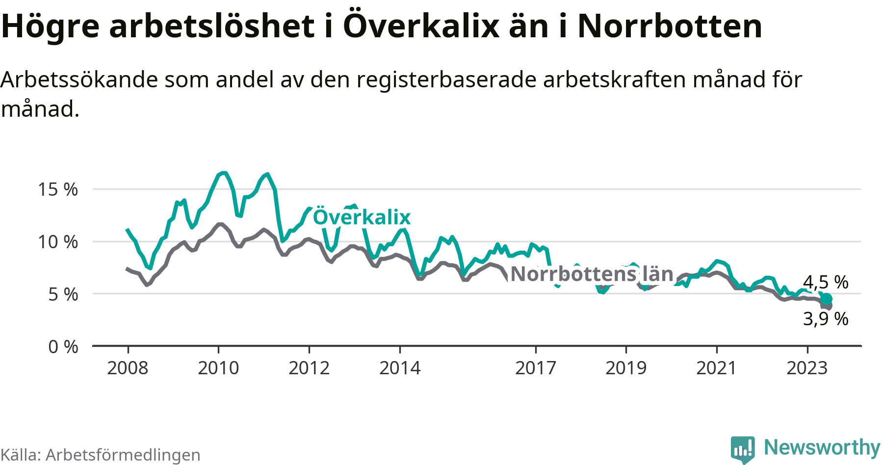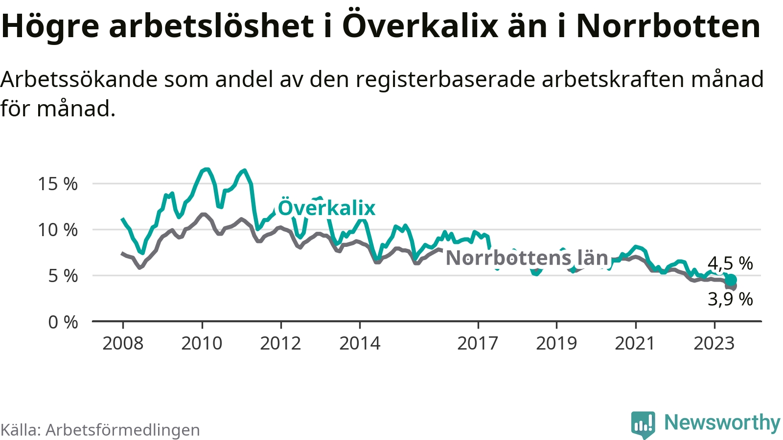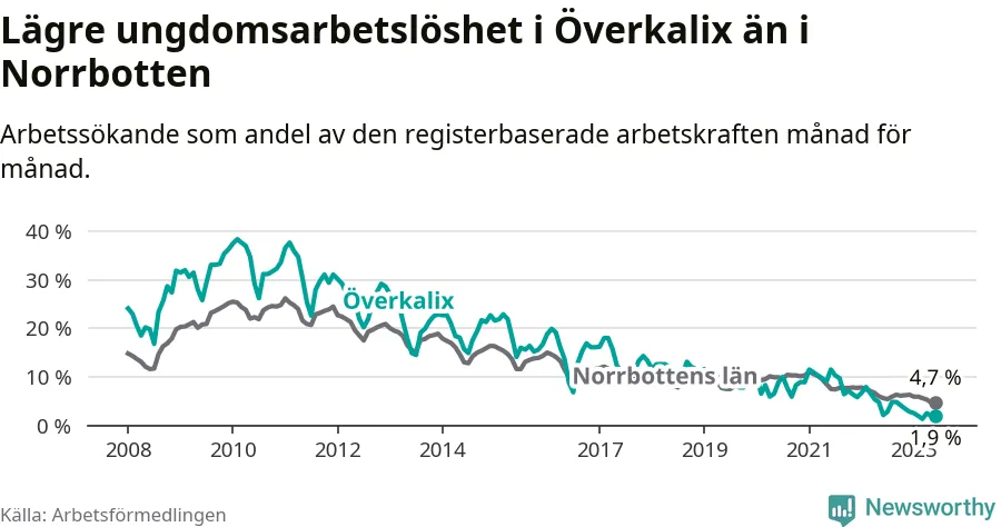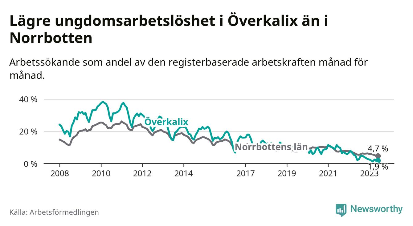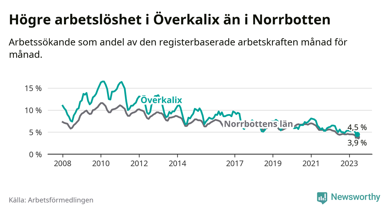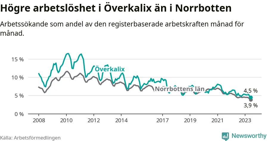Det är elfte månaden i följd som arbetslösheten i Överkalix är lägre än den var under samma tidpunkt året innan. Sedan juli 2022 har arbetslösheten gått ner från 5,6 till 4,5 procent. Den nuvarande arbetslöshetsnivån är därmed den lägsta sedan januari 2008.