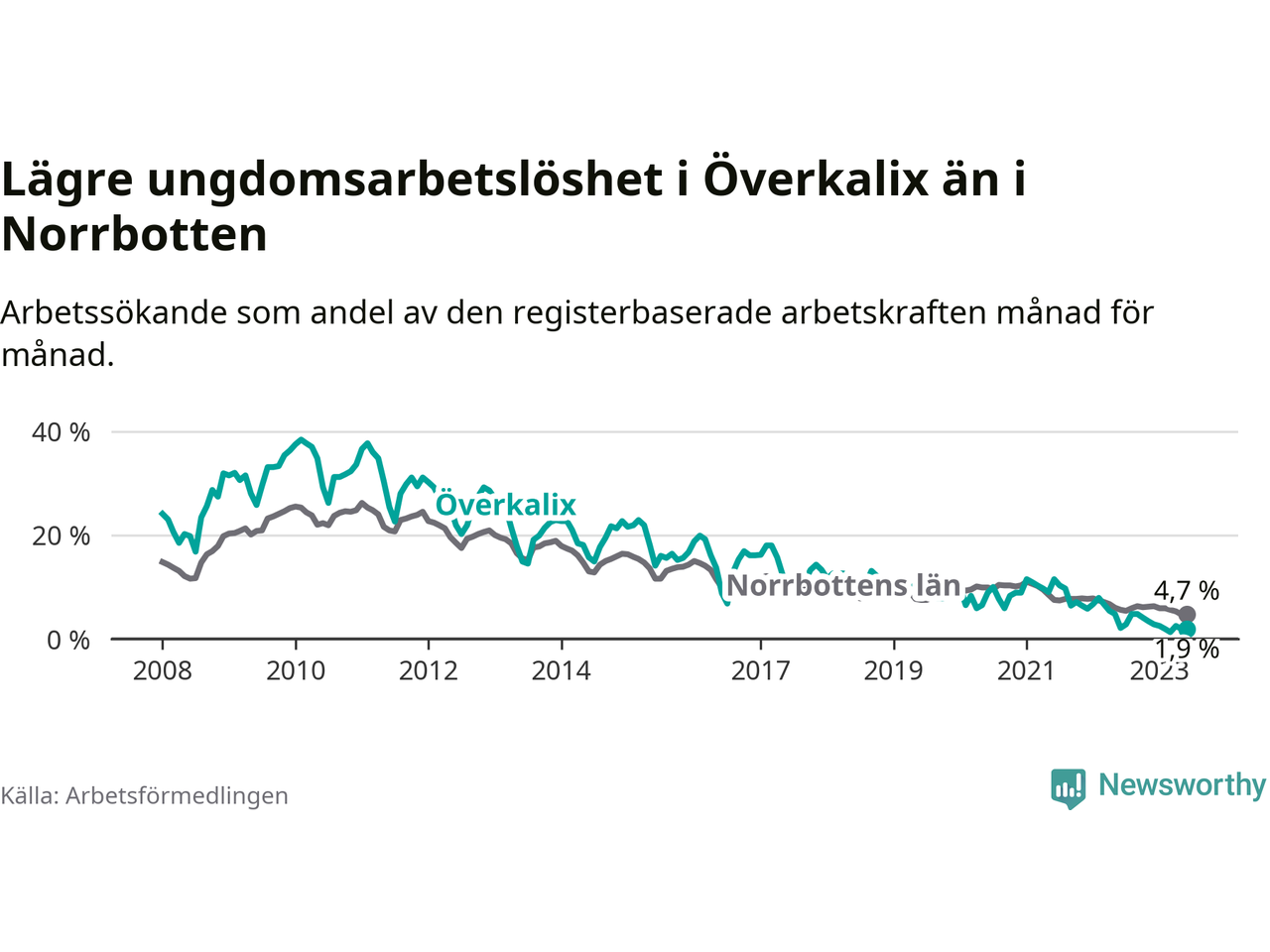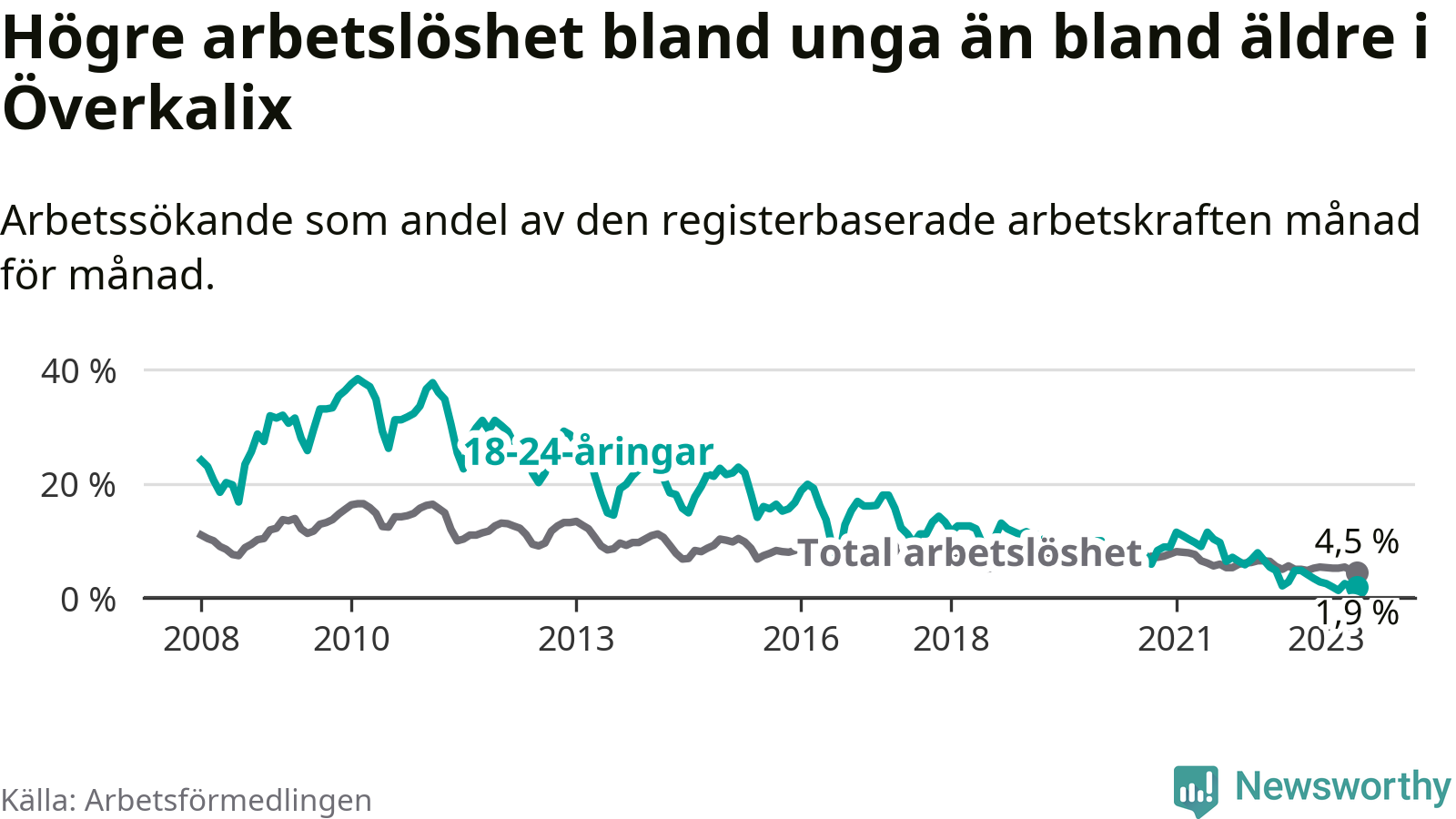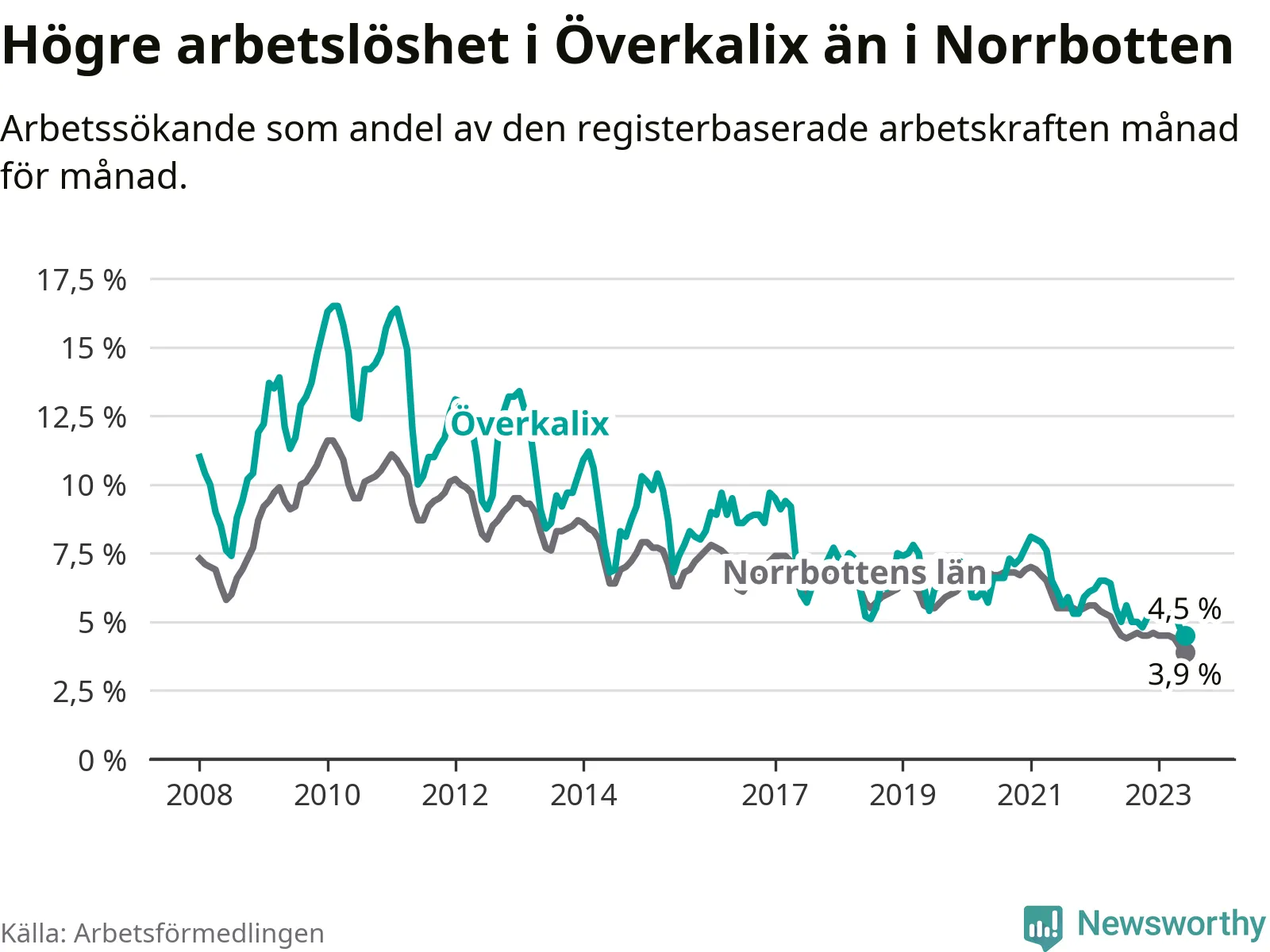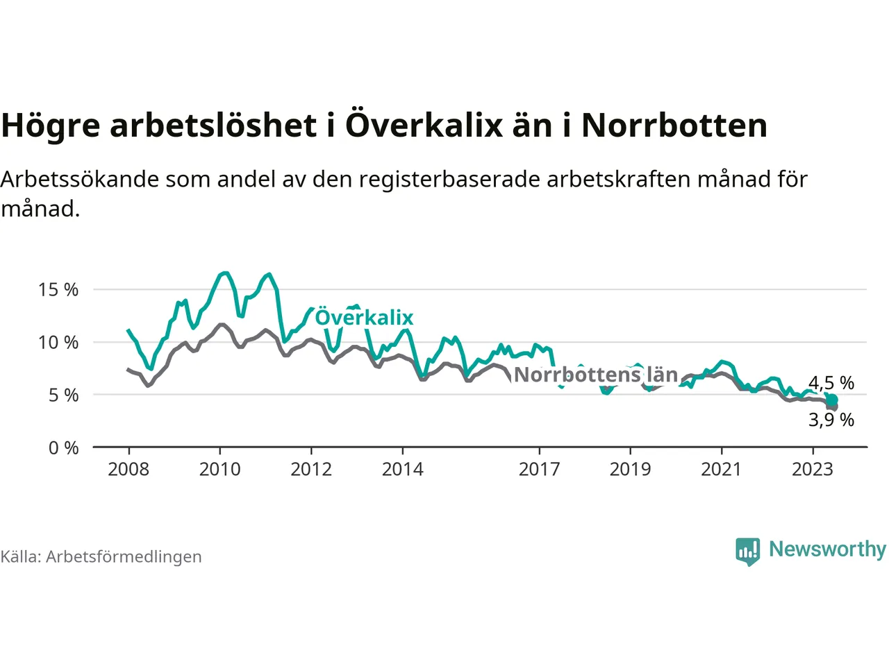 Det är elfte månaden i följd som arbetslösheten i Överkalix är lägre än den var under samma tidpunkt året innan. Sedan juli 2022 har arbetslösheten gått ner från 5,6 till 4,5 procent. Den nuvarande arbetslöshetsnivån är därmed den lägsta sedan januari 2008.