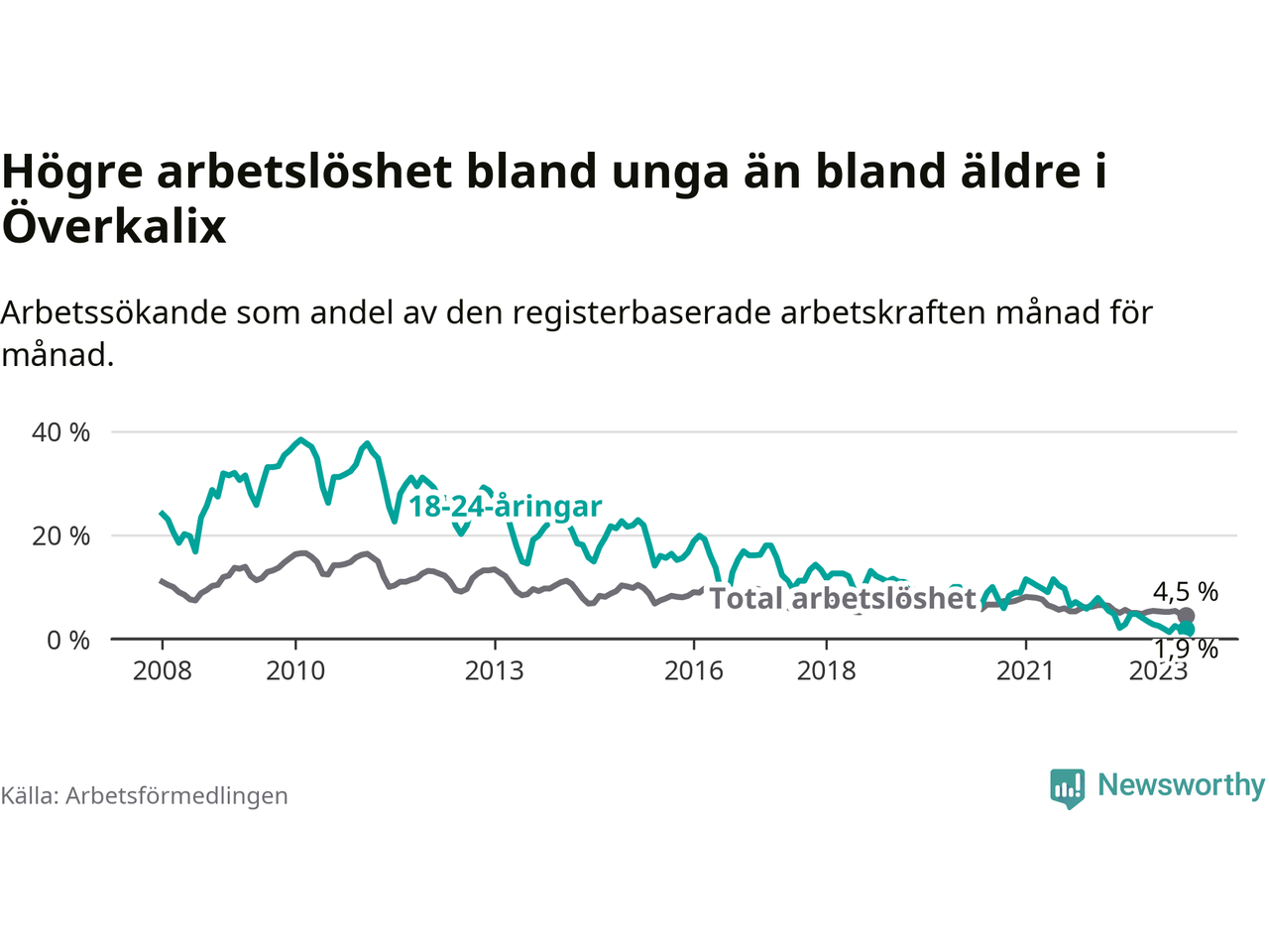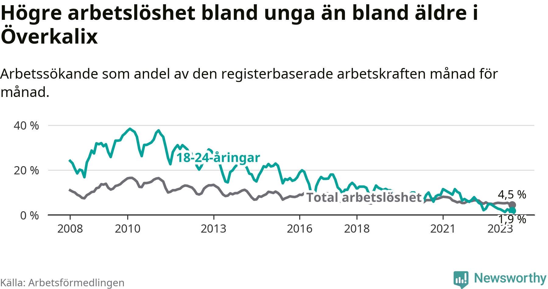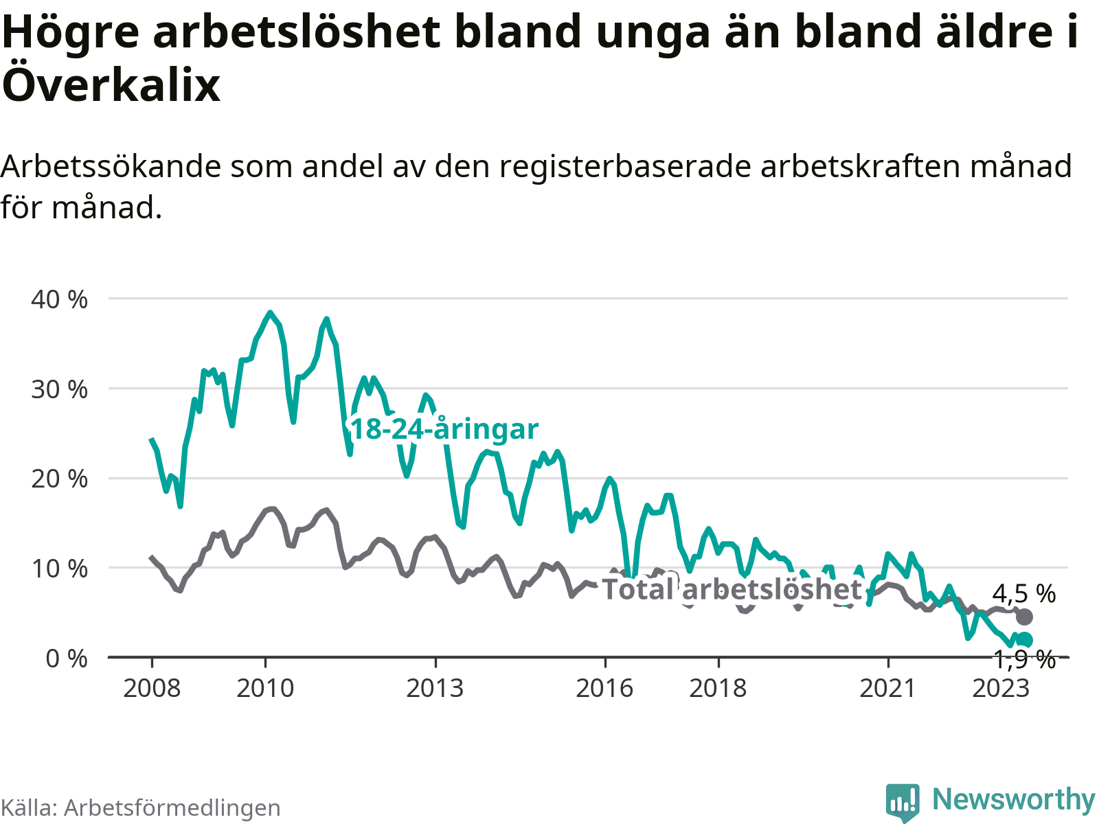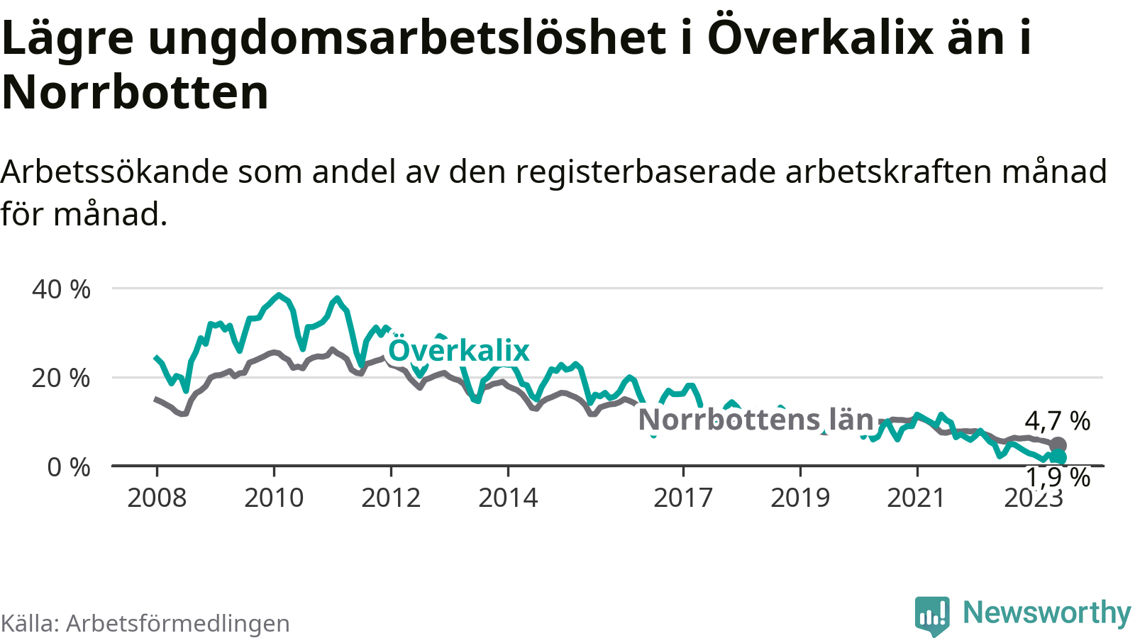 Det är elfte månaden i följd som arbetslösheten i Överkalix är lägre än den var under samma tidpunkt året innan. Sedan juli 2022 har arbetslösheten gått ner från 5,6 till 4,5 procent. Den nuvarande arbetslöshetsnivån är därmed den lägsta sedan januari 2008.