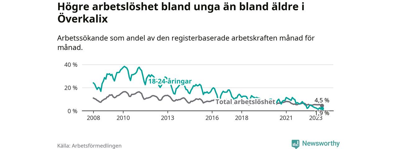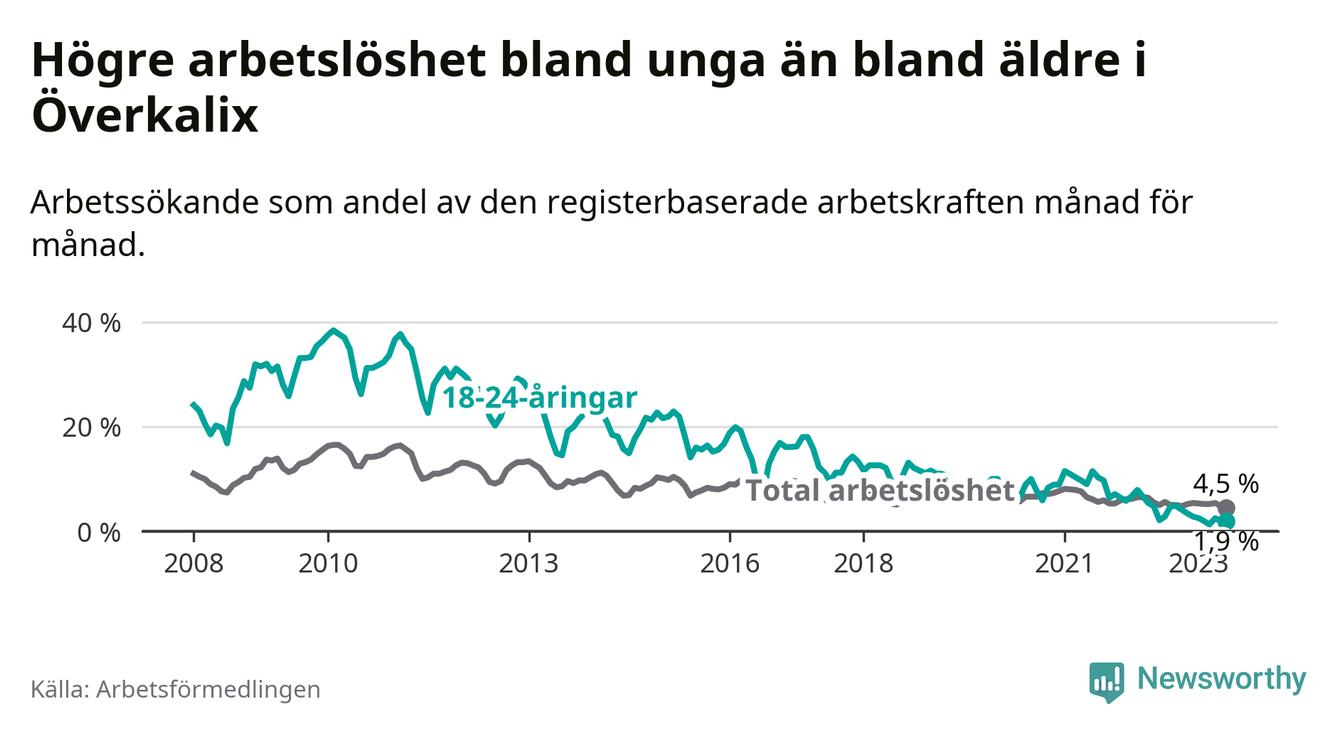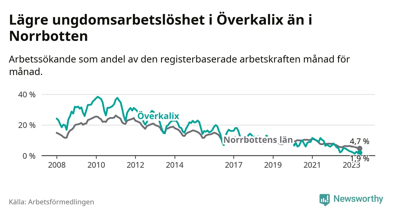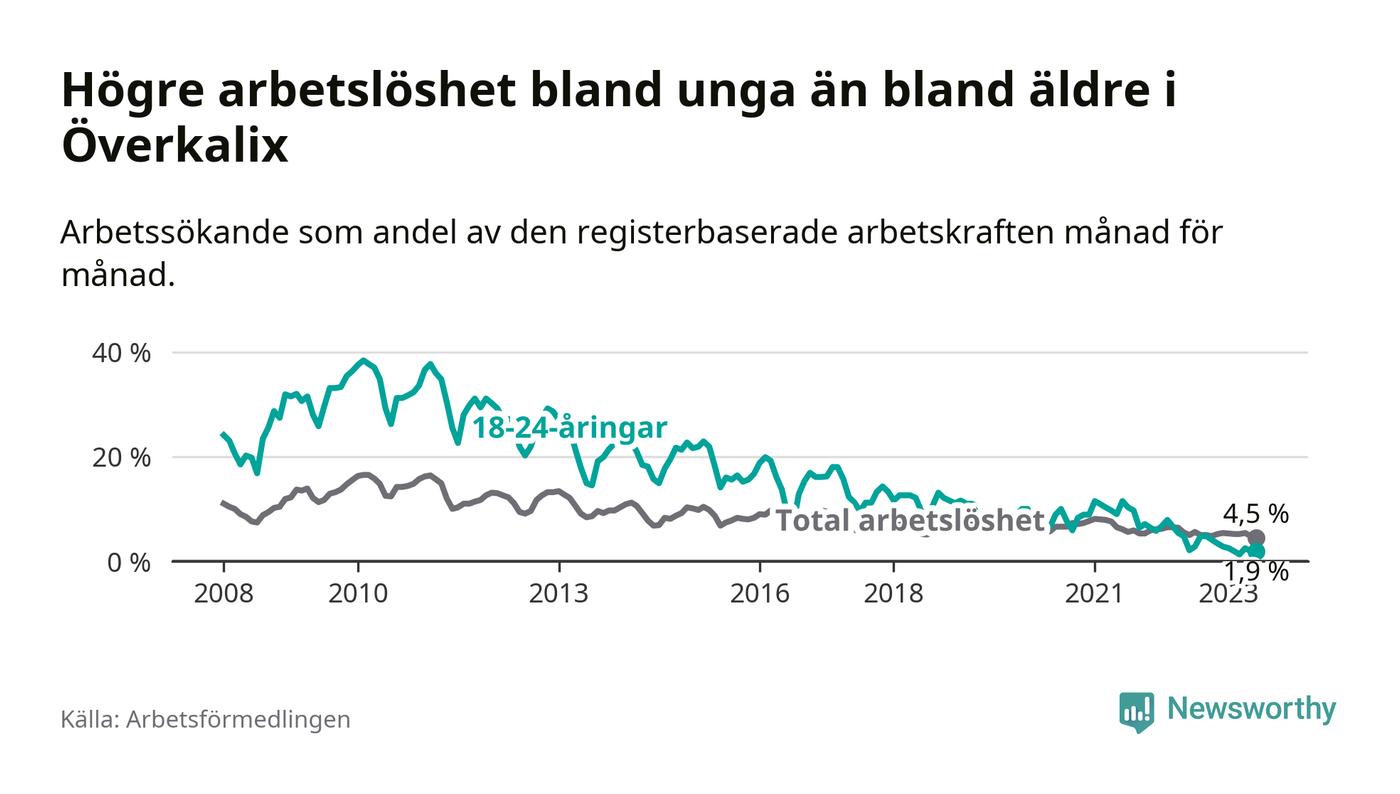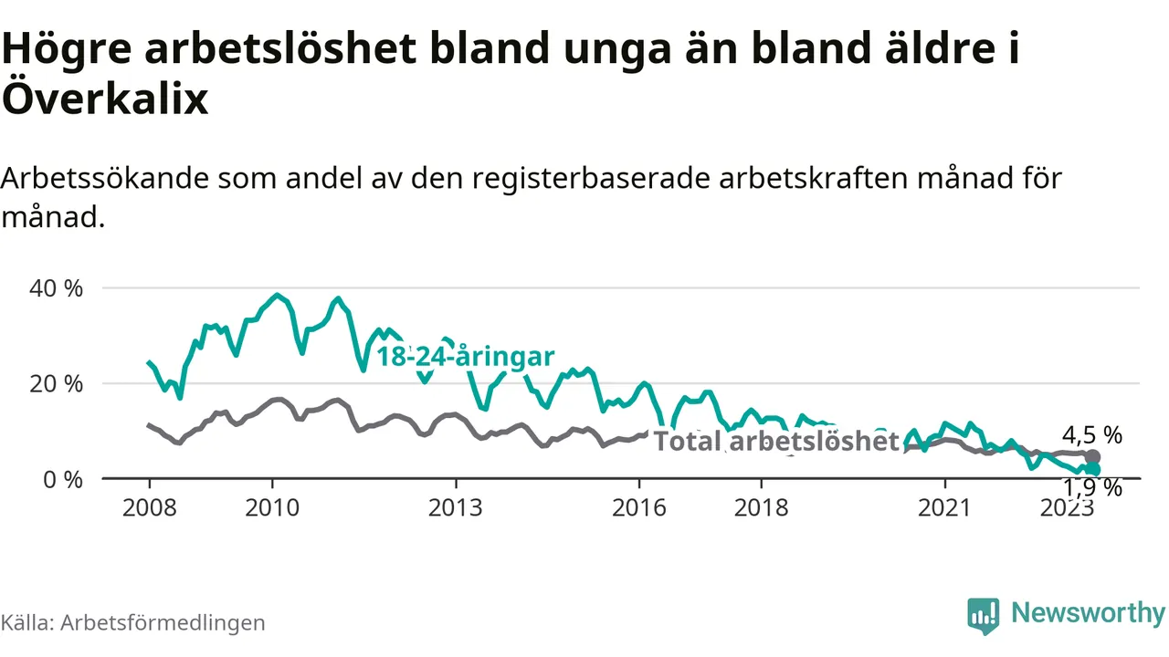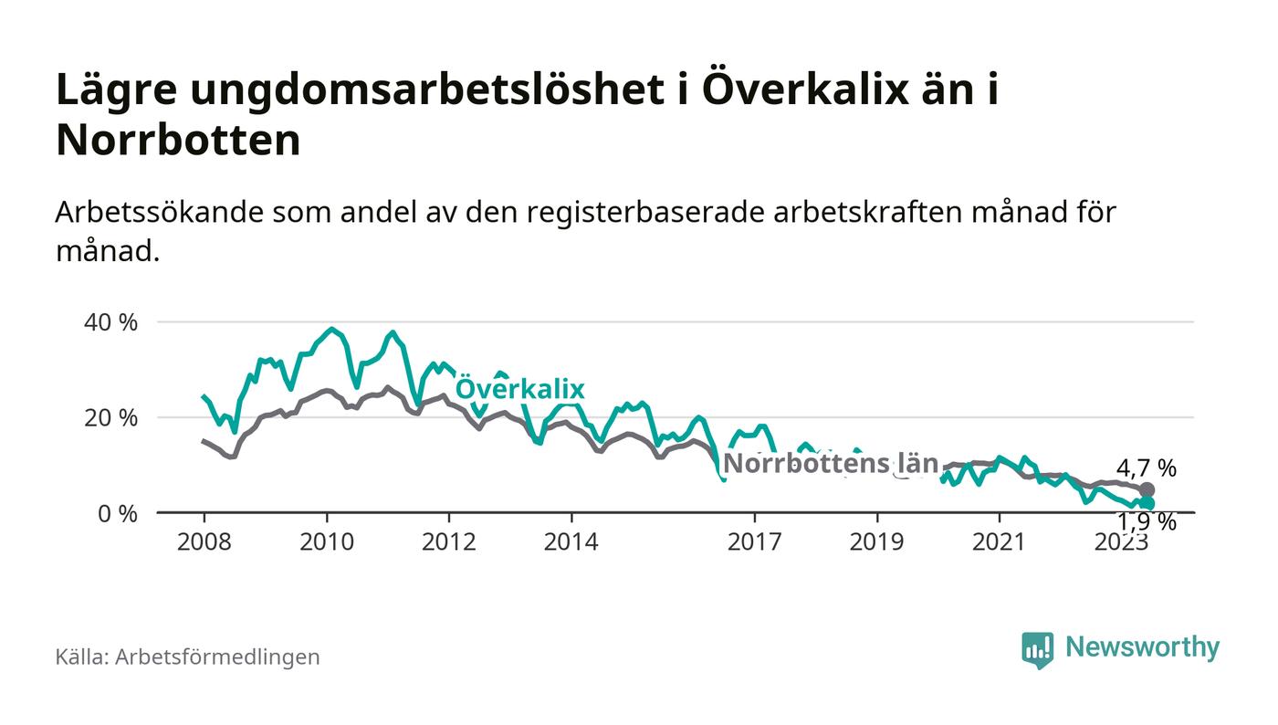 Medan Överkalix har högre total arbetslöshet än Norrbotten, ligger ungdomsarbetslösheten 2,8 procentenheter lägre i Överkalix.