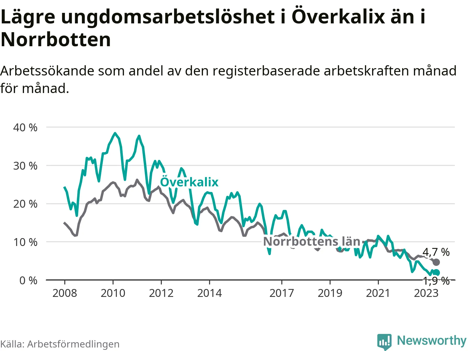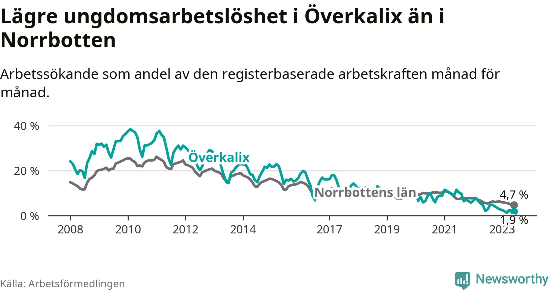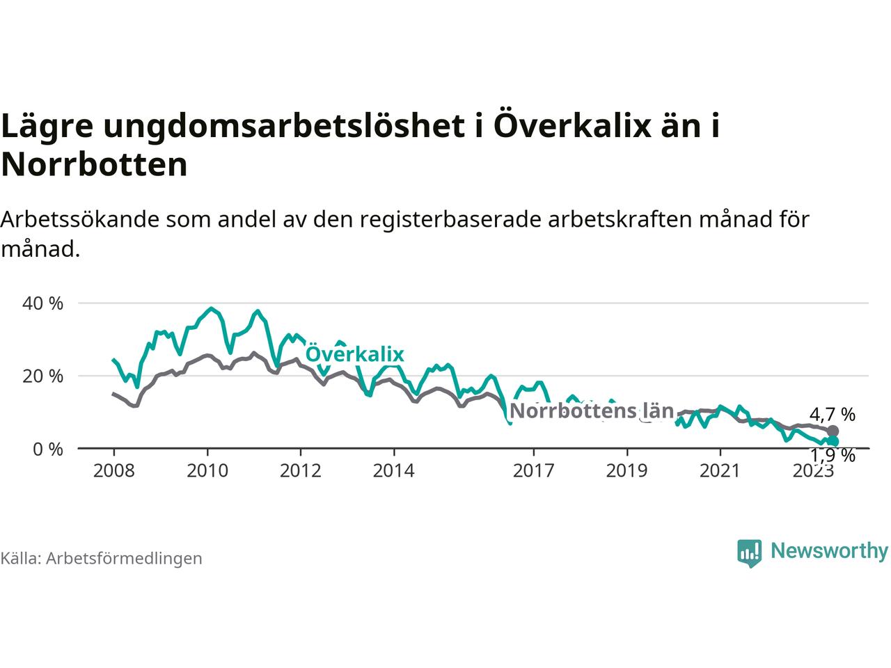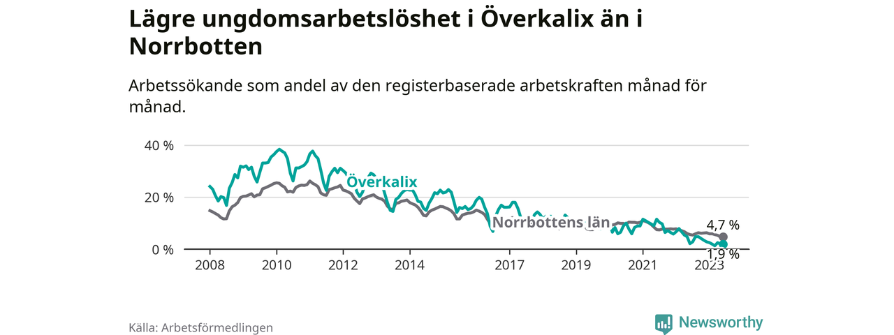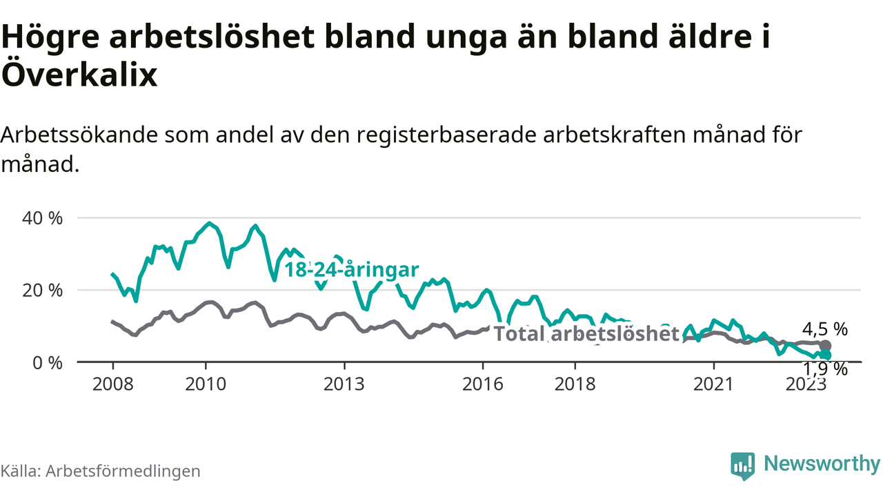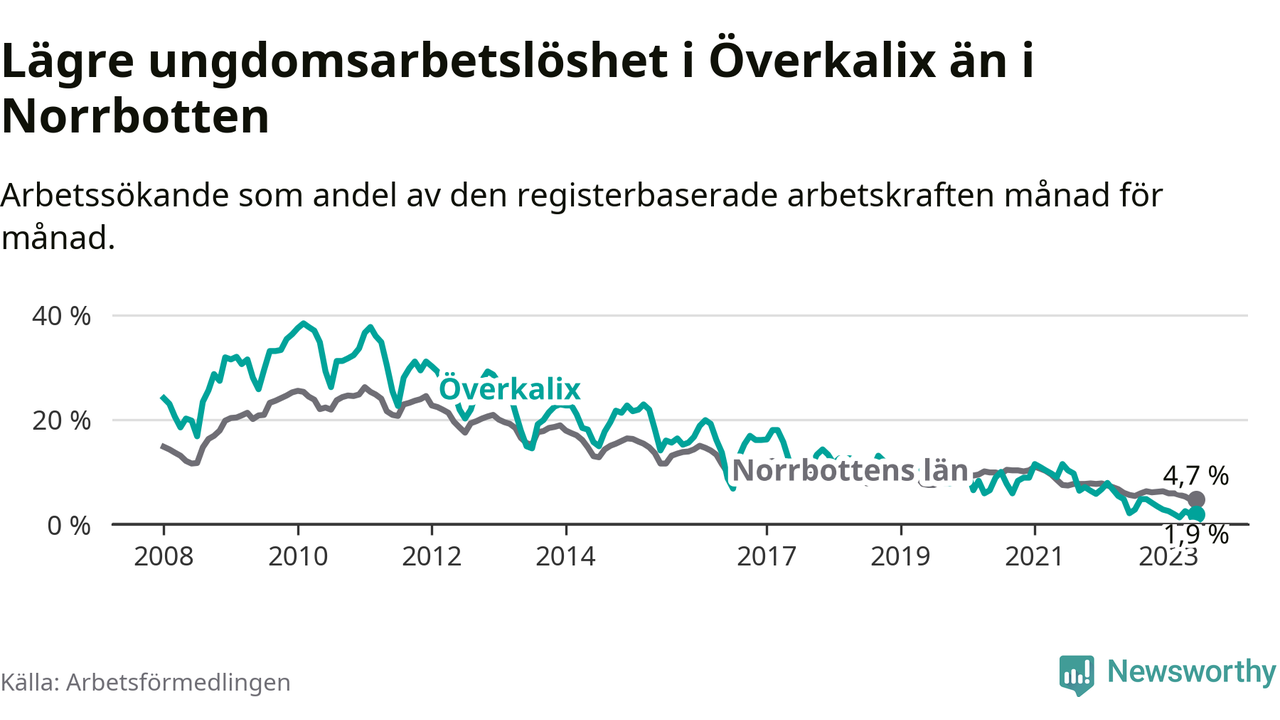 Medan Överkalix har högre total arbetslöshet än Norrbotten, ligger ungdomsarbetslösheten 2,8 procentenheter lägre i Överkalix.
