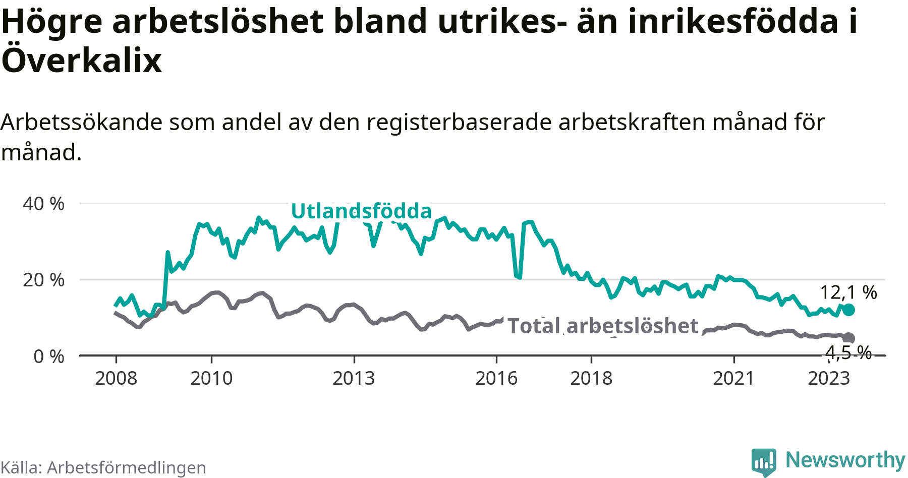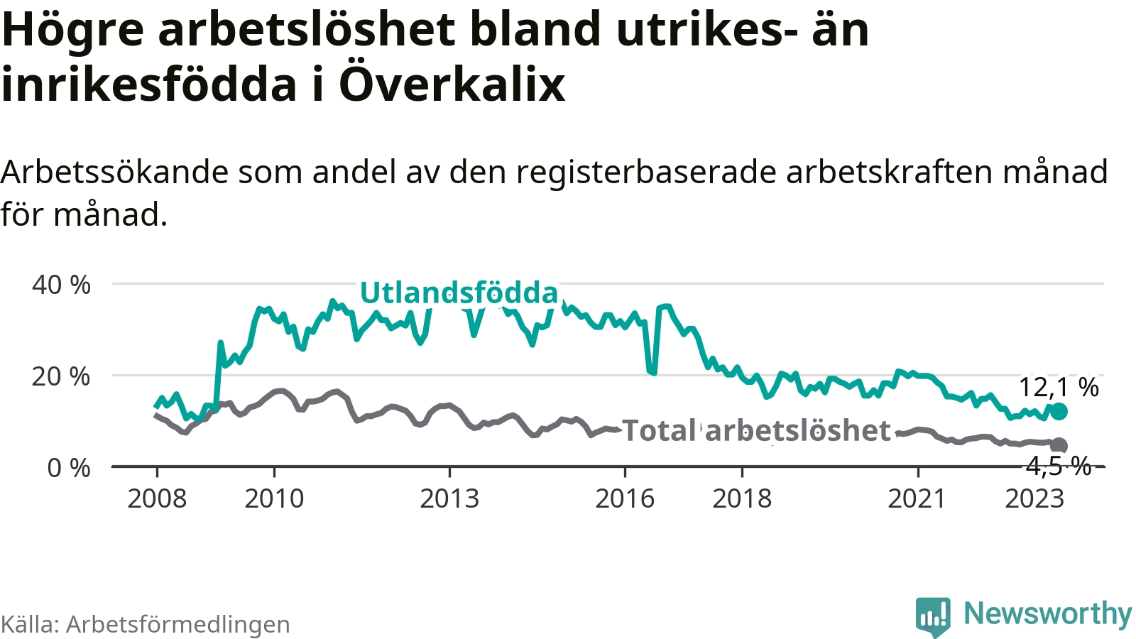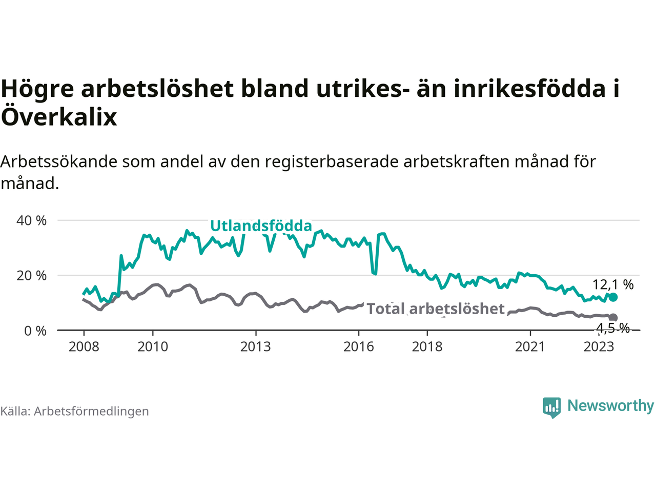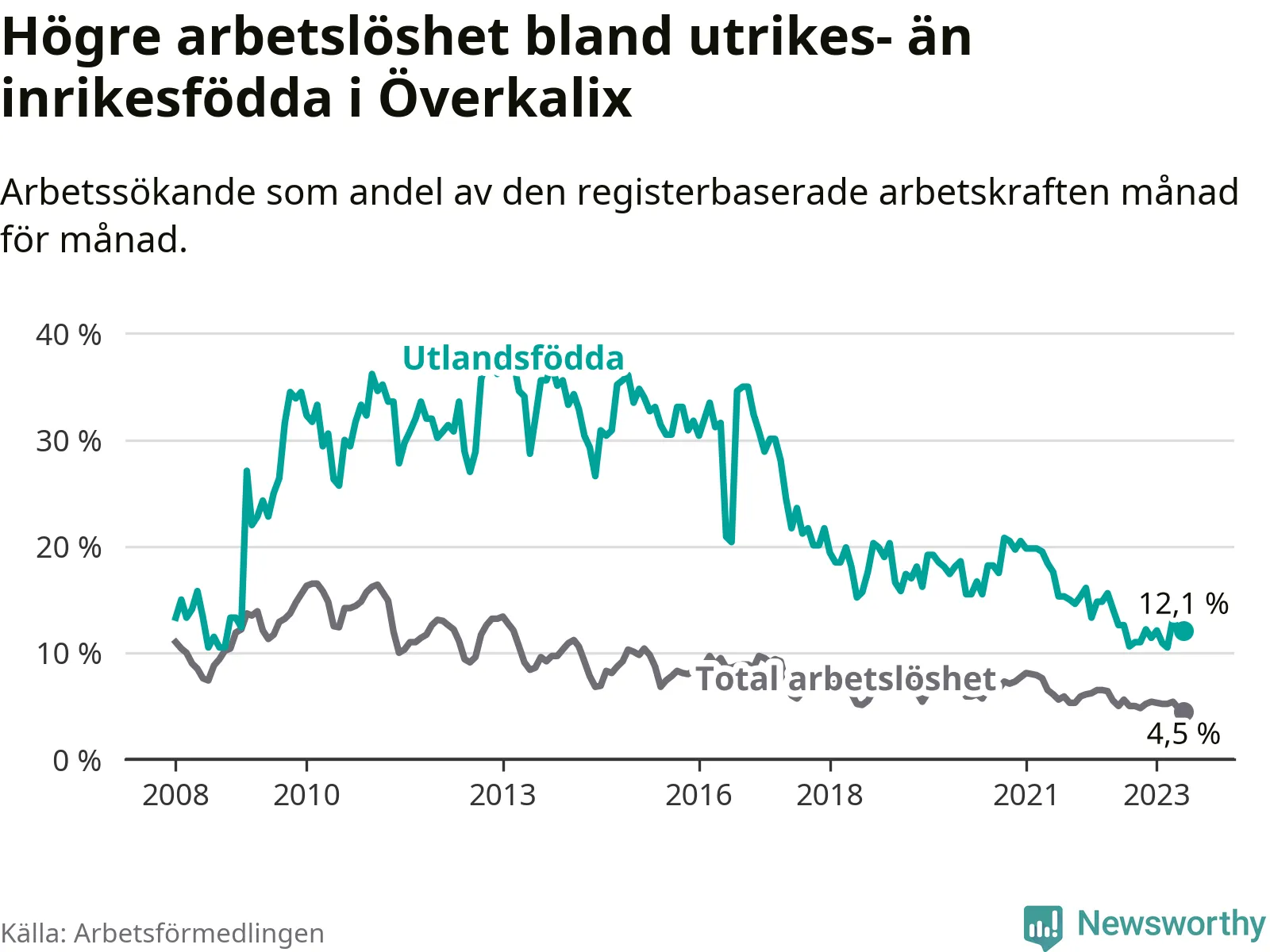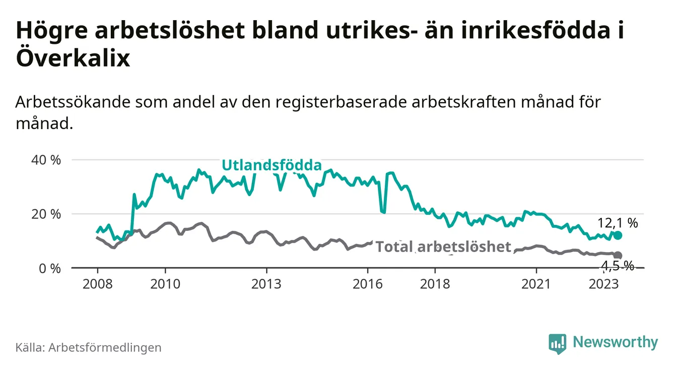 | Bland utlandsfödda | 12,1 % | −0,5 % ▼ | 10,2 % | −1,5 % ▼ | 15,0 % | −1,5 % ▼ |
