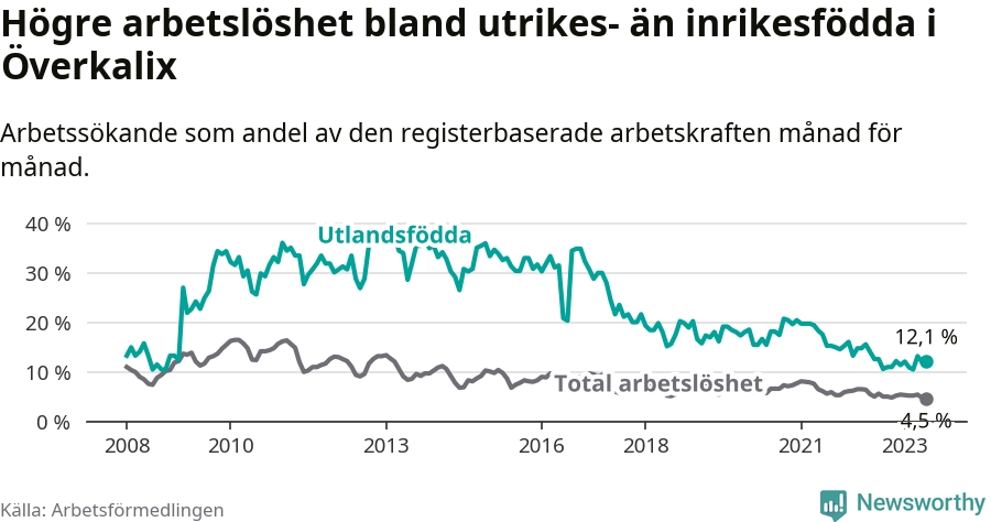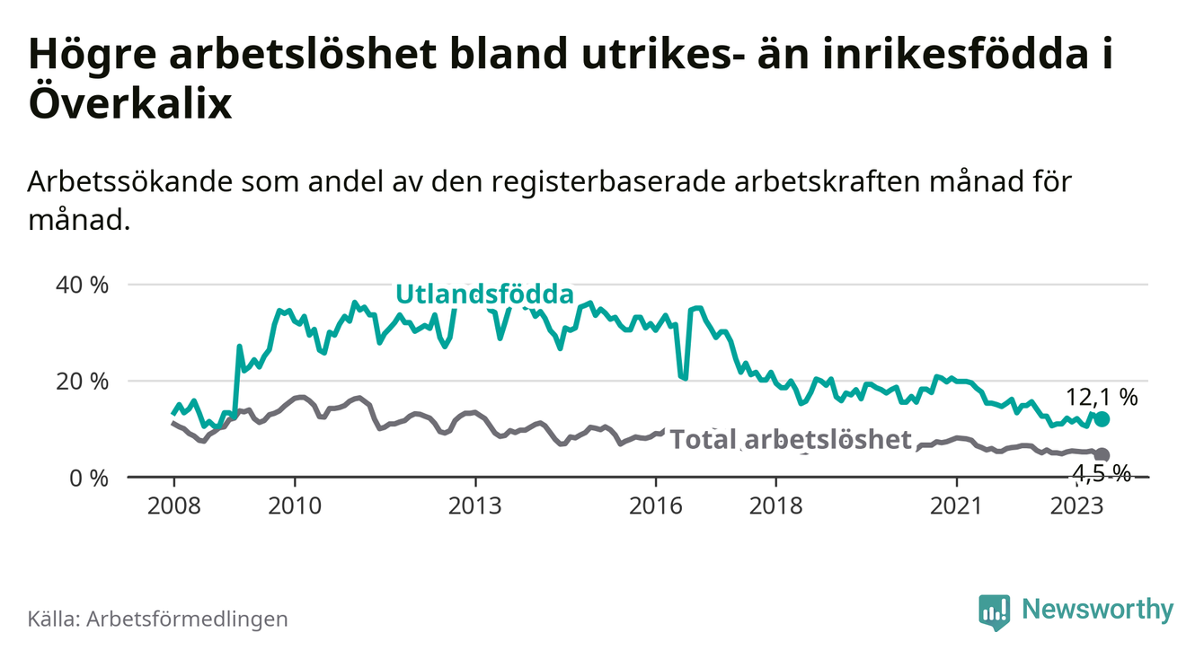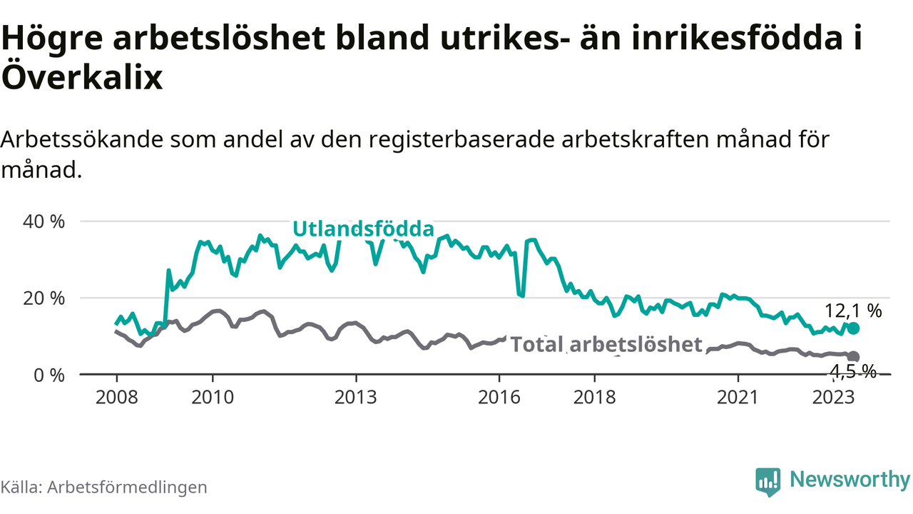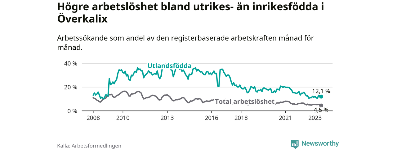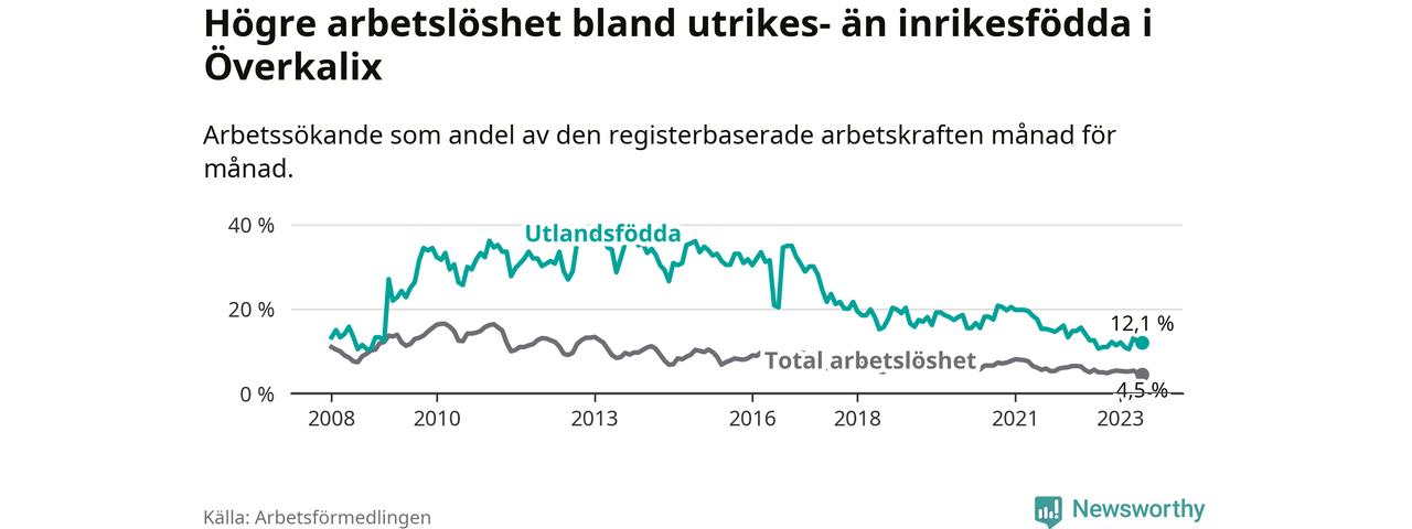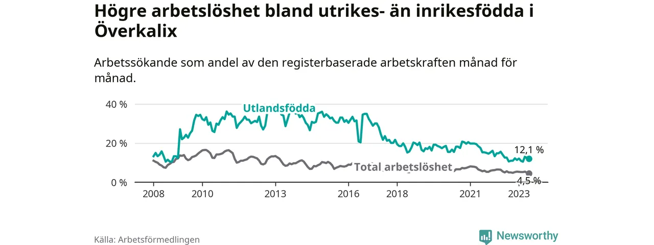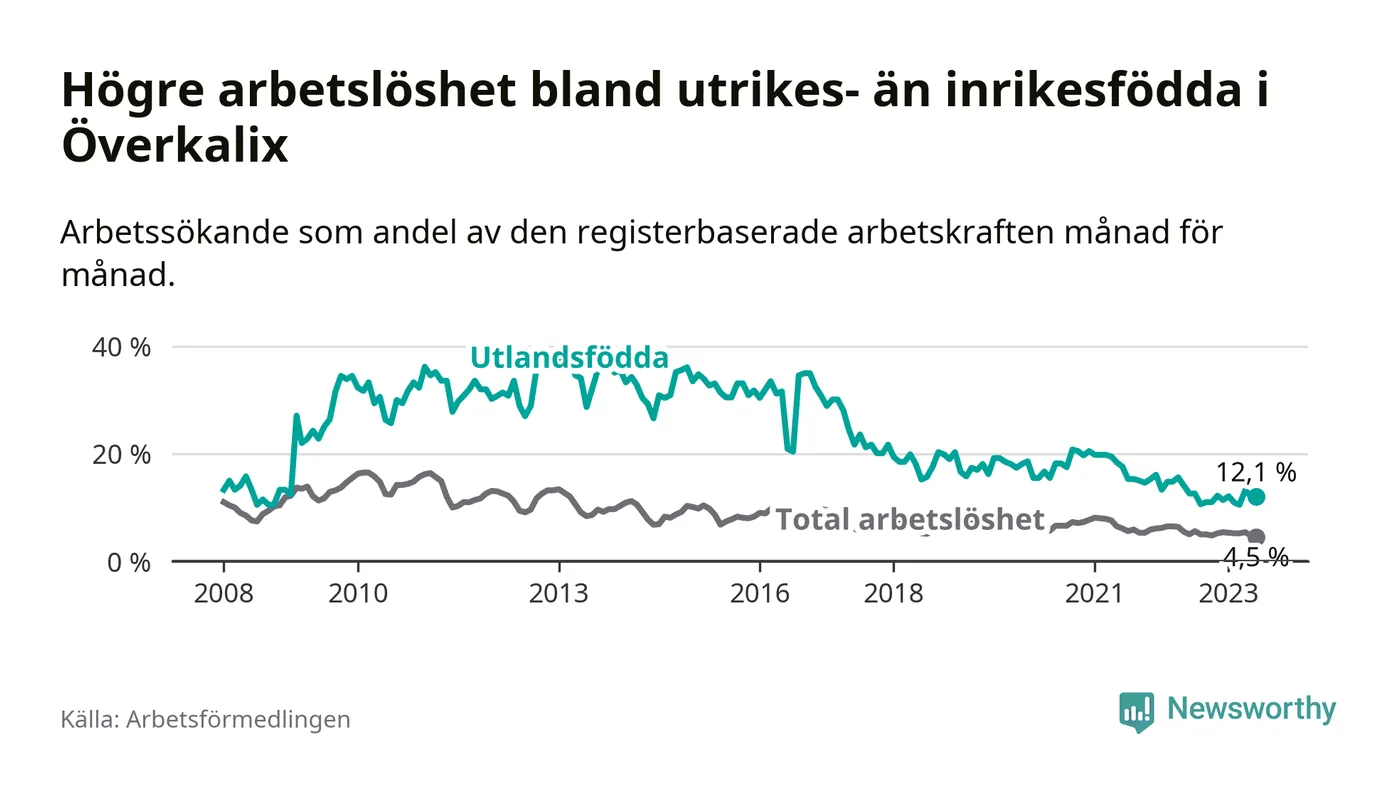 Skillnaden i arbetslöshet mellan utrikesfödda och hela befolkningen är 7,6 procentenheter i Överkalix. Det är ungefär samma skillnad som för ett år sedan.