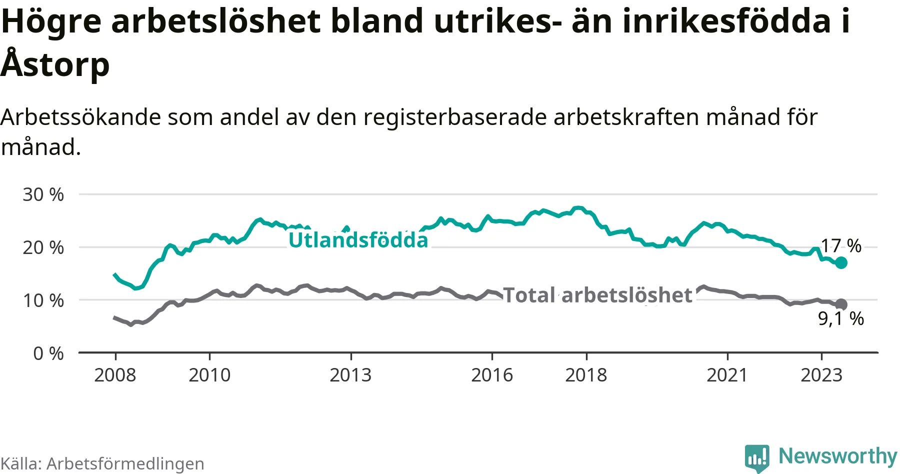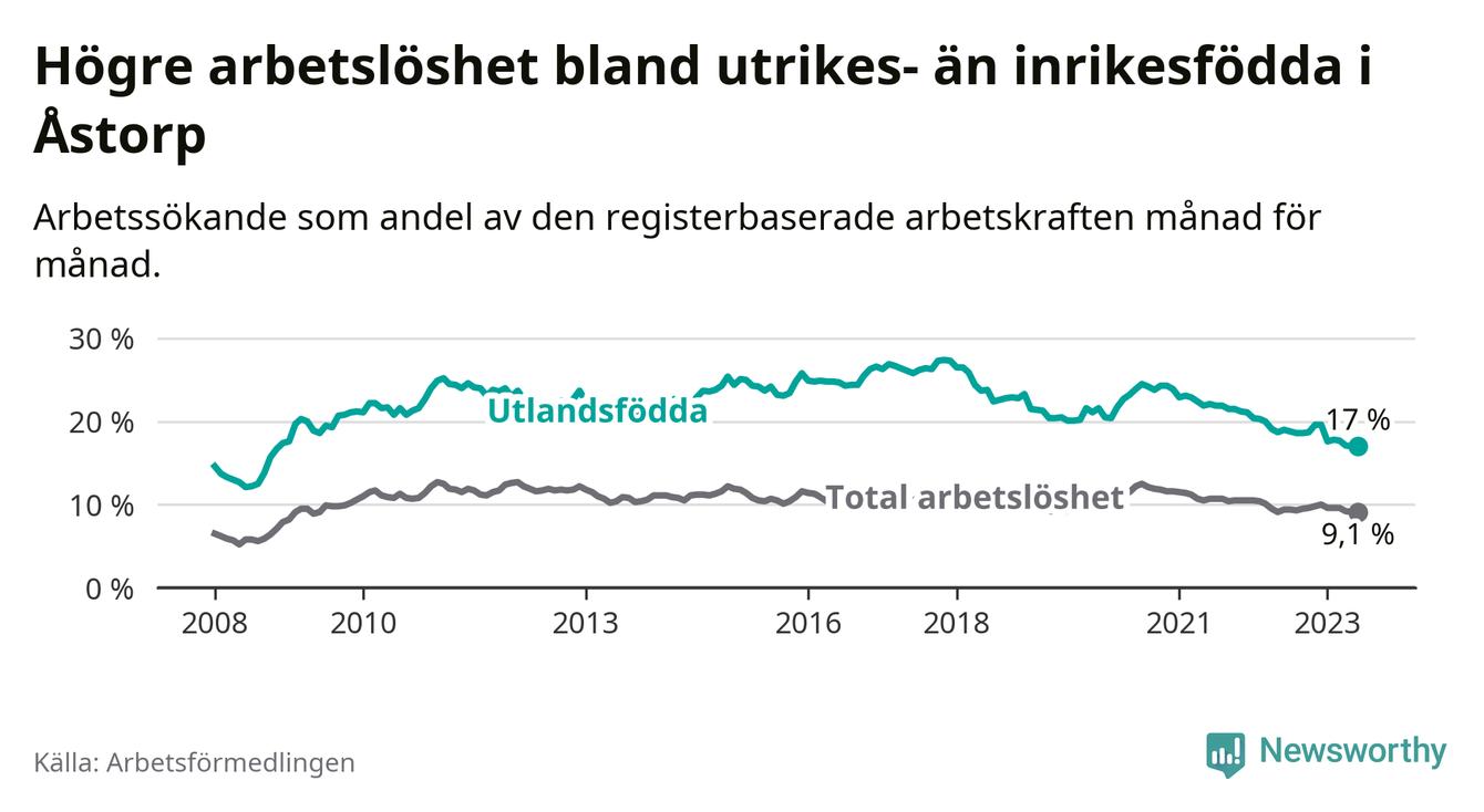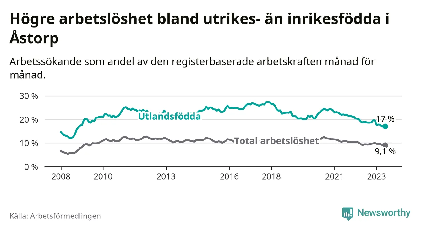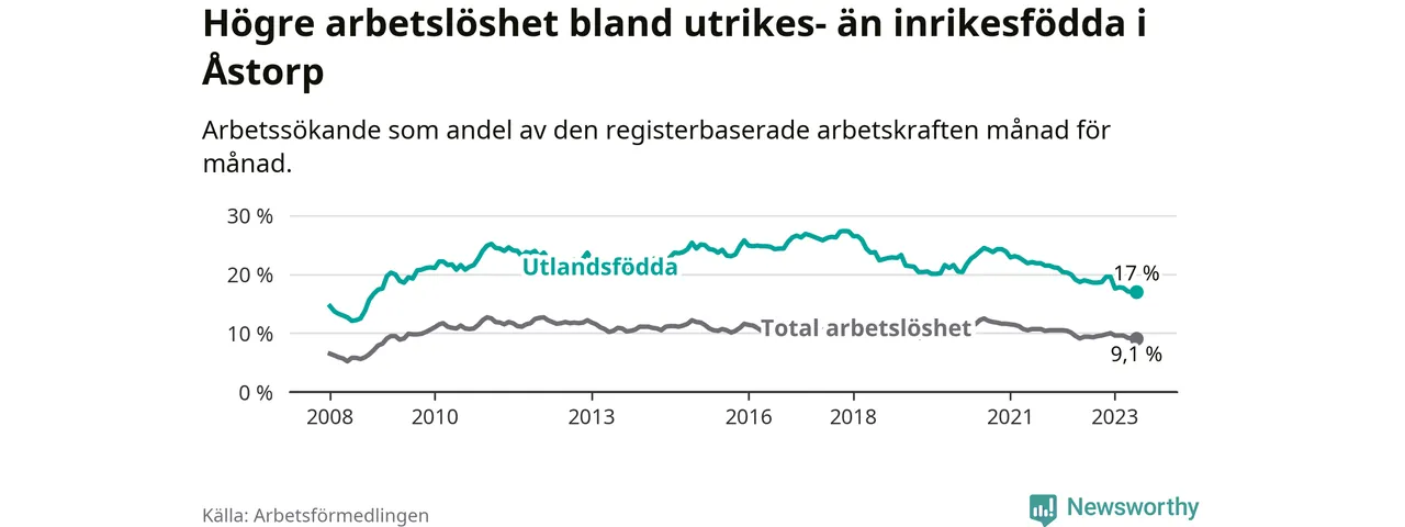 Skillnaden i arbetslöshet mellan utrikesfödda och hela befolkningen är 7,9 procentenheter i Åstorp. Det är en betydligt mindre skillnad än för ett år sedan (−1,7 procentenheter).