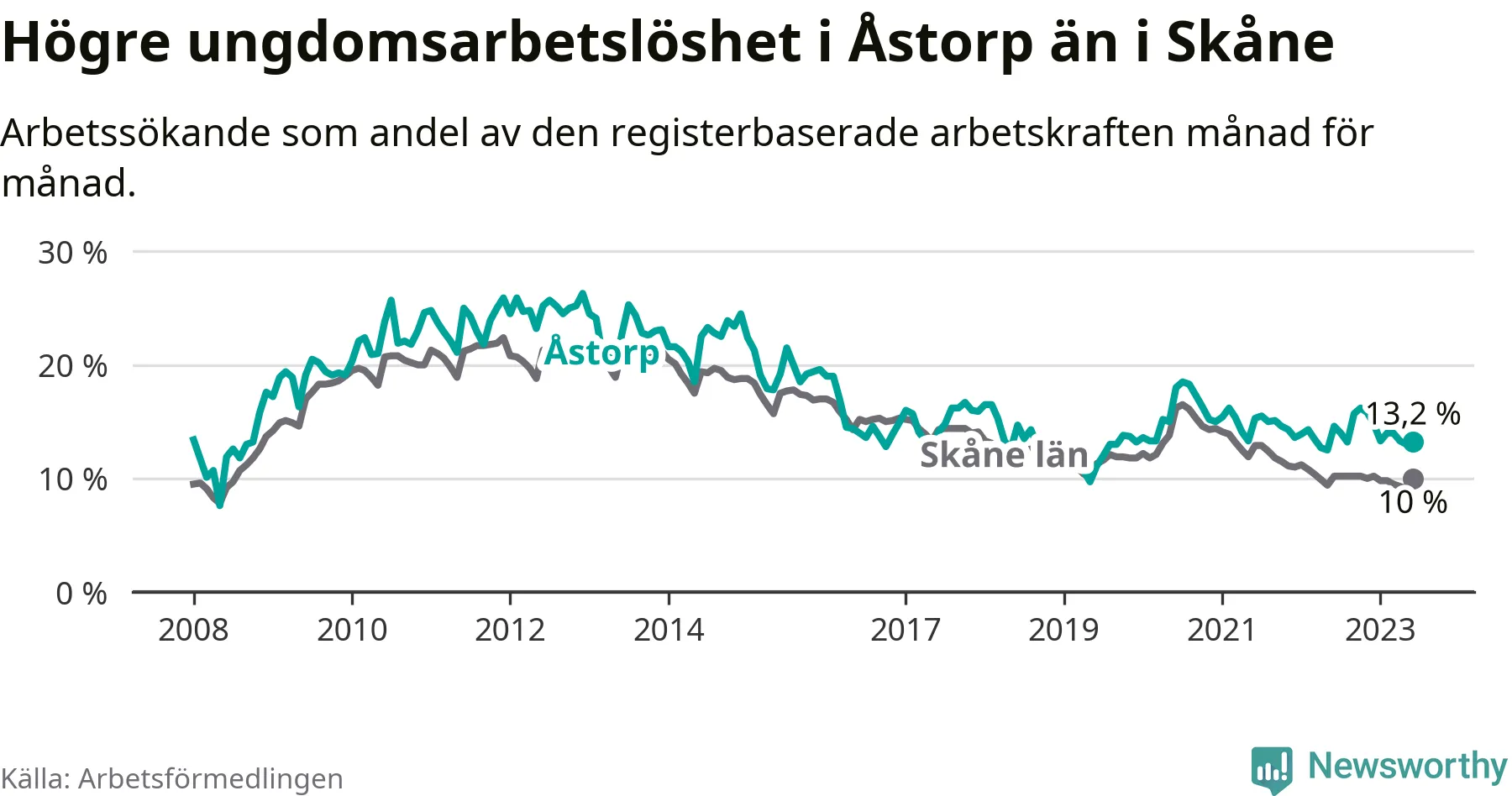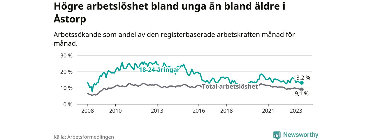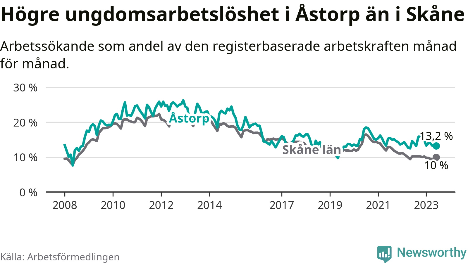 Precis som den totala arbetslösheten ligger ungdomsarbetslösheten i Åstorp högre än i Skåne som helhet. Skillnaden mellan kommunen och länet är 3,2 procentenheter.