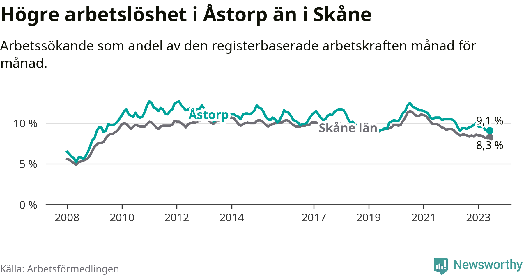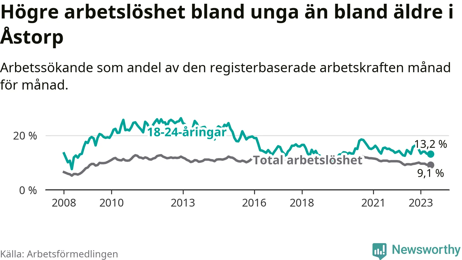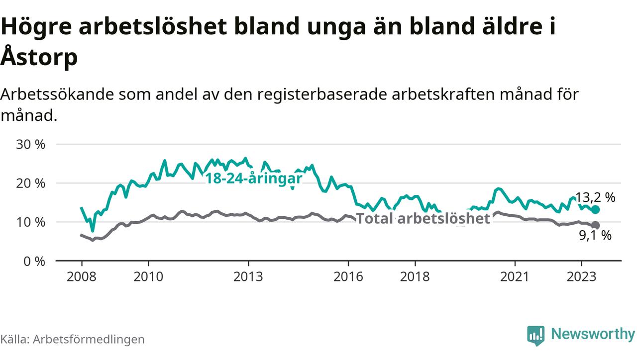 Precis som den totala arbetslösheten ligger ungdomsarbetslösheten i Åstorp högre än i Skåne som helhet. Skillnaden mellan kommunen och länet är 3,2 procentenheter.