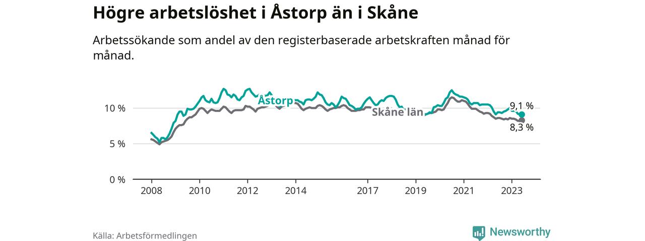 Under juni månad rapporterade Åstorps kommun en total arbetslöshet på 9,1 procent. Det är en minskning jämfört med samma tidpunkt i fjol (−0,3 procentenheter). Även i Skåne län sjunker arbetslösheten .