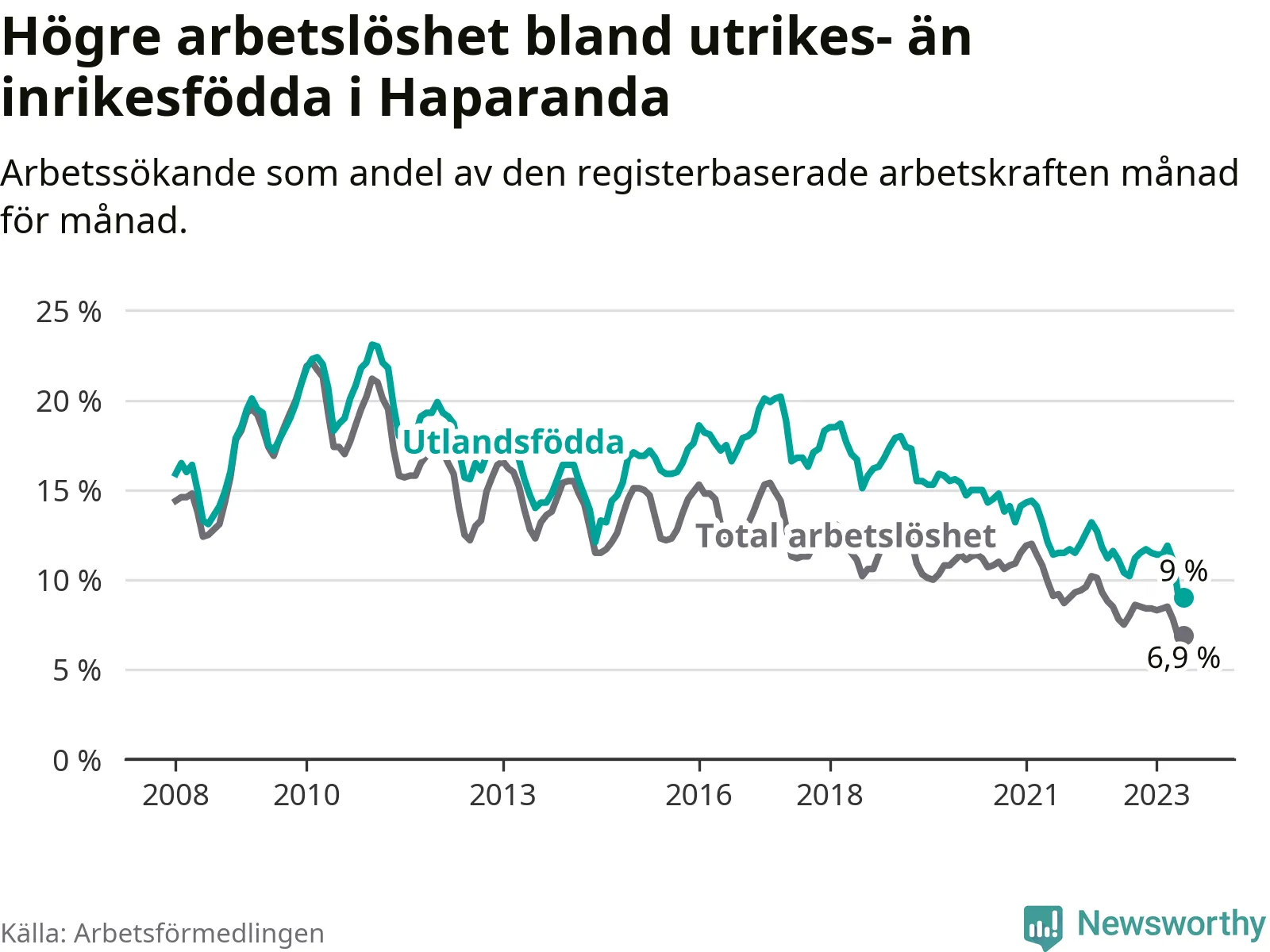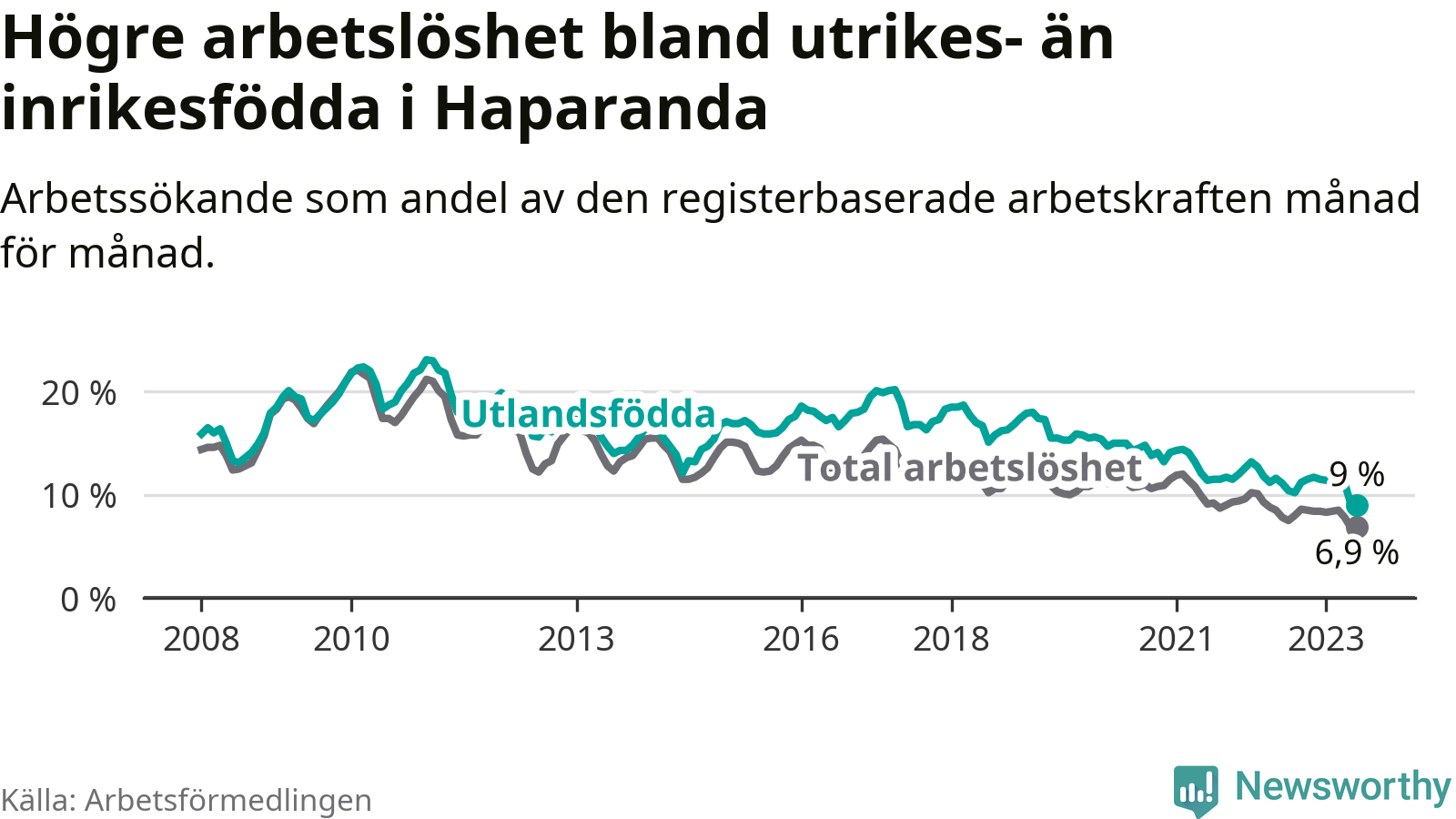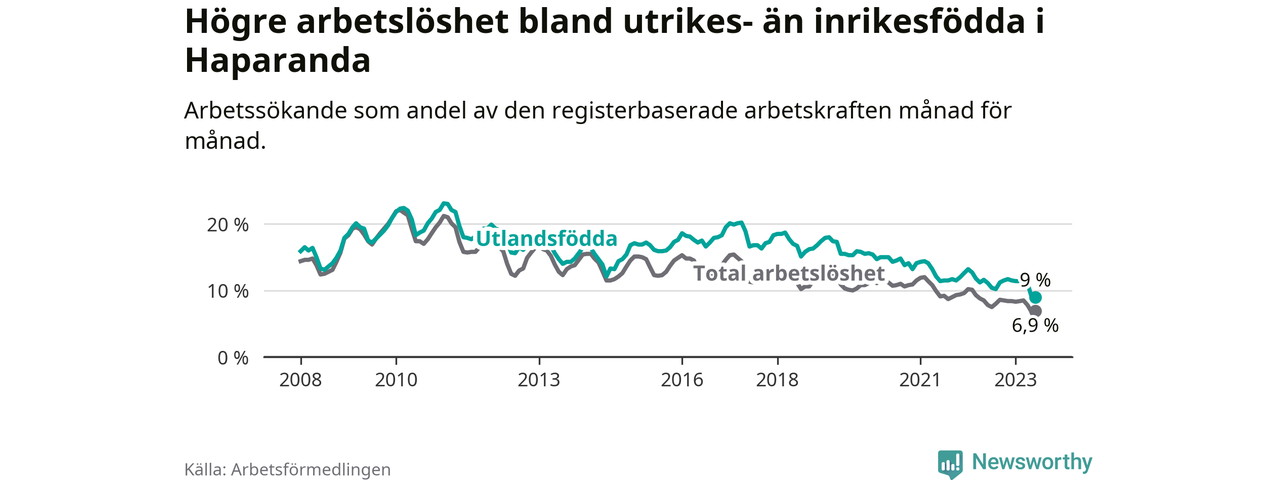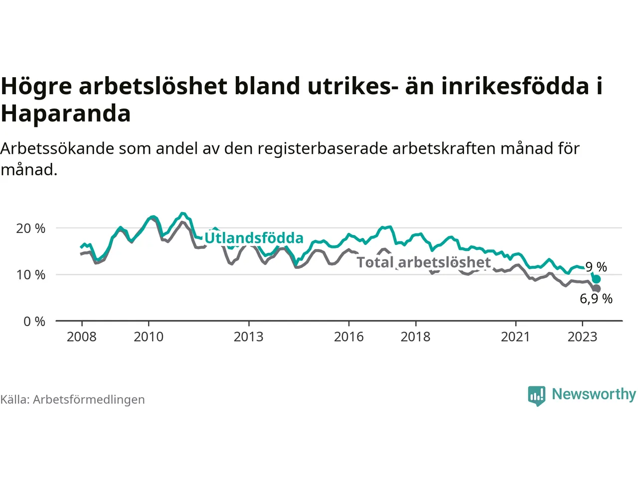 Skillnaden i arbetslöshet mellan utrikesfödda och hela befolkningen är 2,1 procentenheter i Haparanda. Det är en mindre skillnad än för ett år sedan (−1,2 procentenheter).