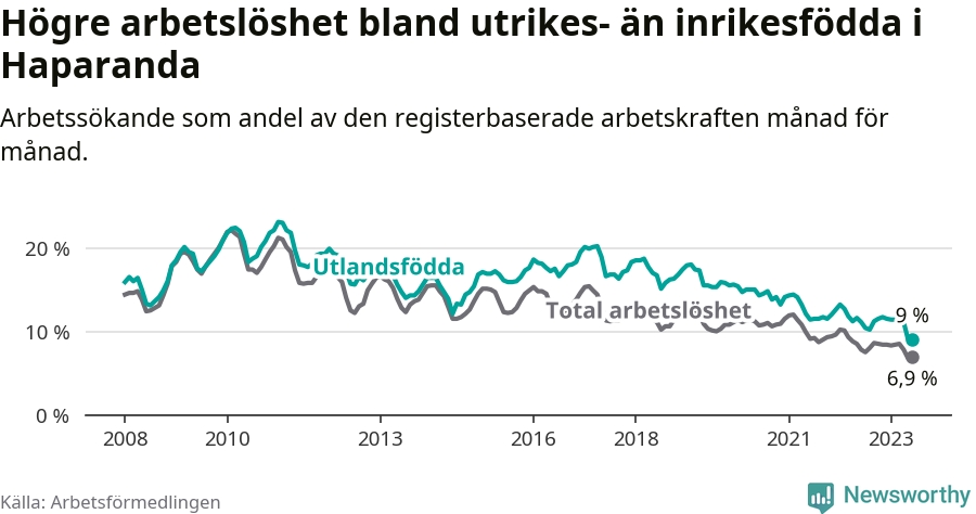 Arbetslösheten bland utlandsfödda var 9,0 procent i Haparanda under juni månad, motsvarande 110 av 1 222 personer. Det är 2,1 procentenheter färre än vid samma tidpunkt i fjol (−25 om man räknar personer). Den nuvarande arbetslöshetsnivån är den lägsta sedan januari 2008.
