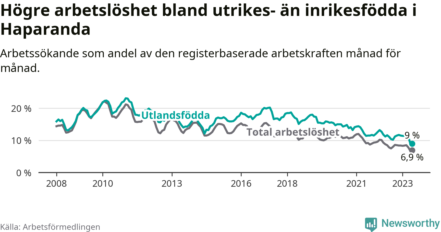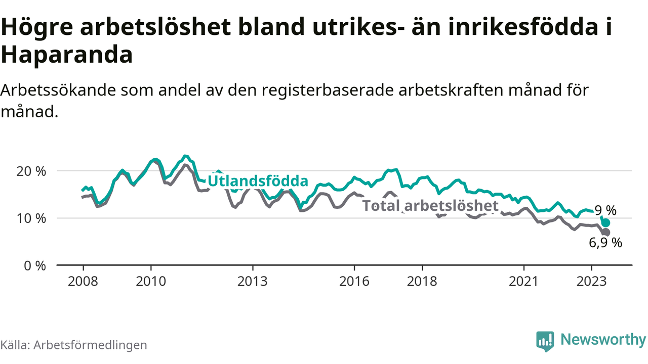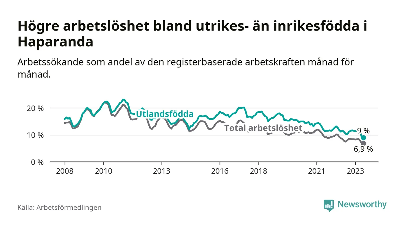 Den här skillnaden i arbetslöshet mellan inrikes- och utrikesfödda är ändå förhållandevis liten i Haparanda om man jämför med andra kommuner i Norrbotten.