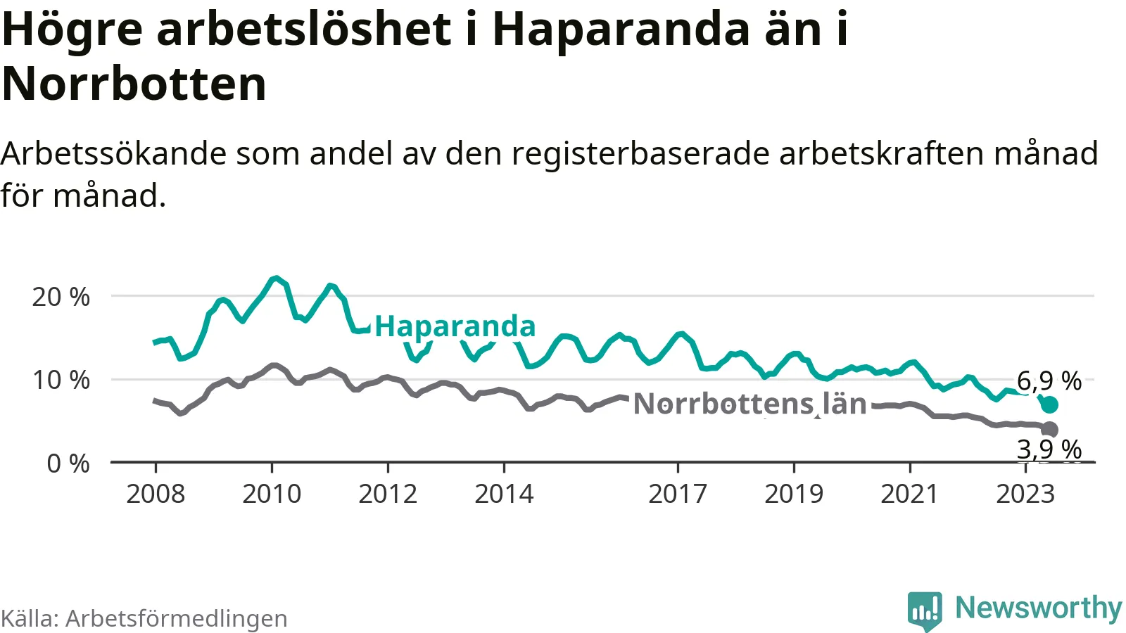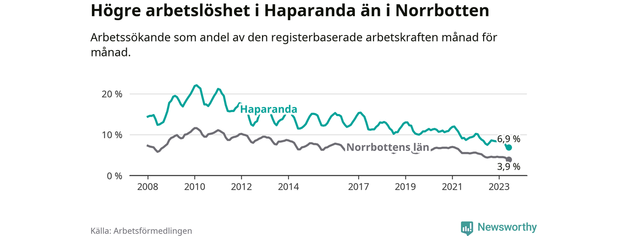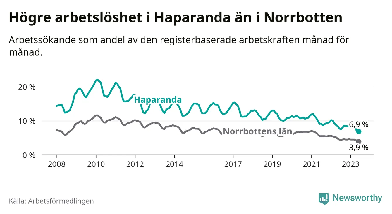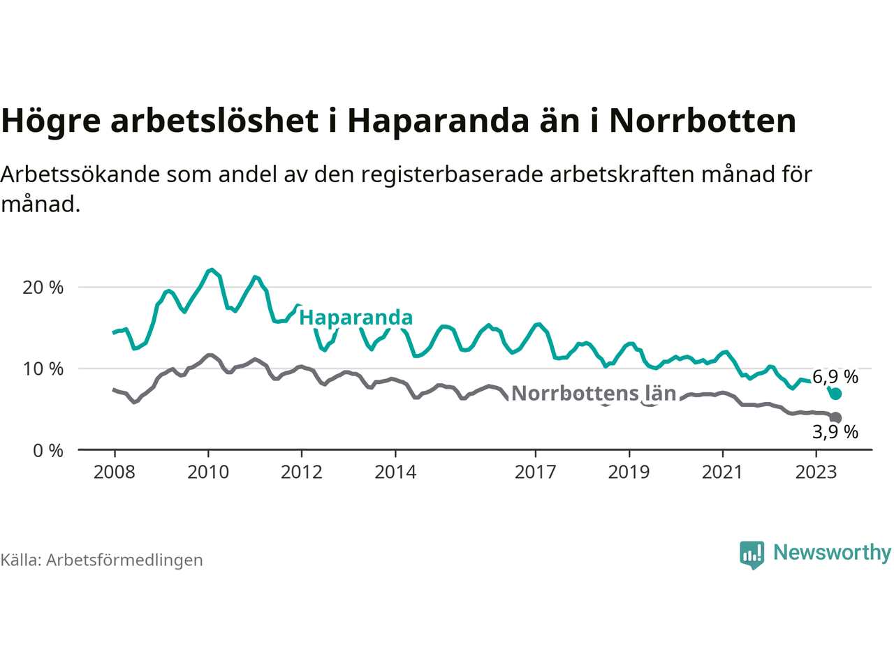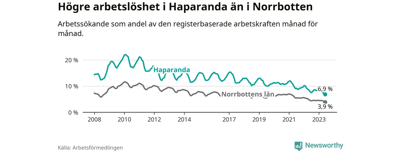 Det är 27:e månaden i följd som arbetslösheten i Haparanda är lägre än den var under samma tidpunkt året innan. Sedan mars 2021 har arbetslösheten gått ner från 11,4 till 6,9 procent.
