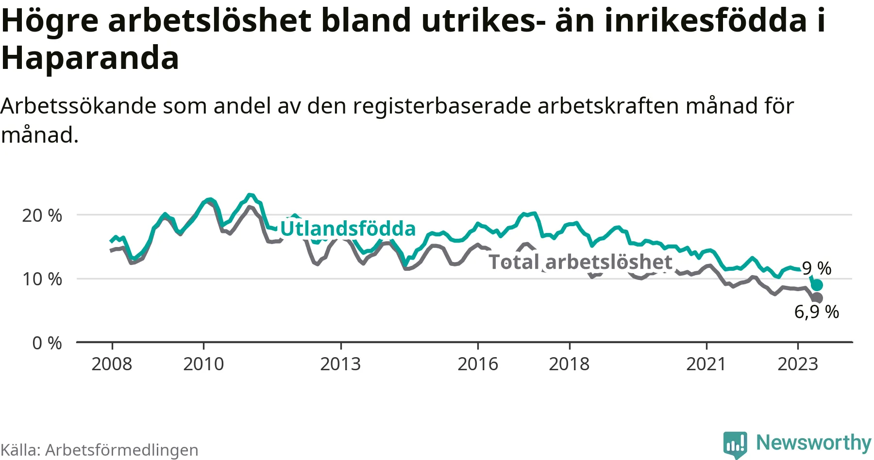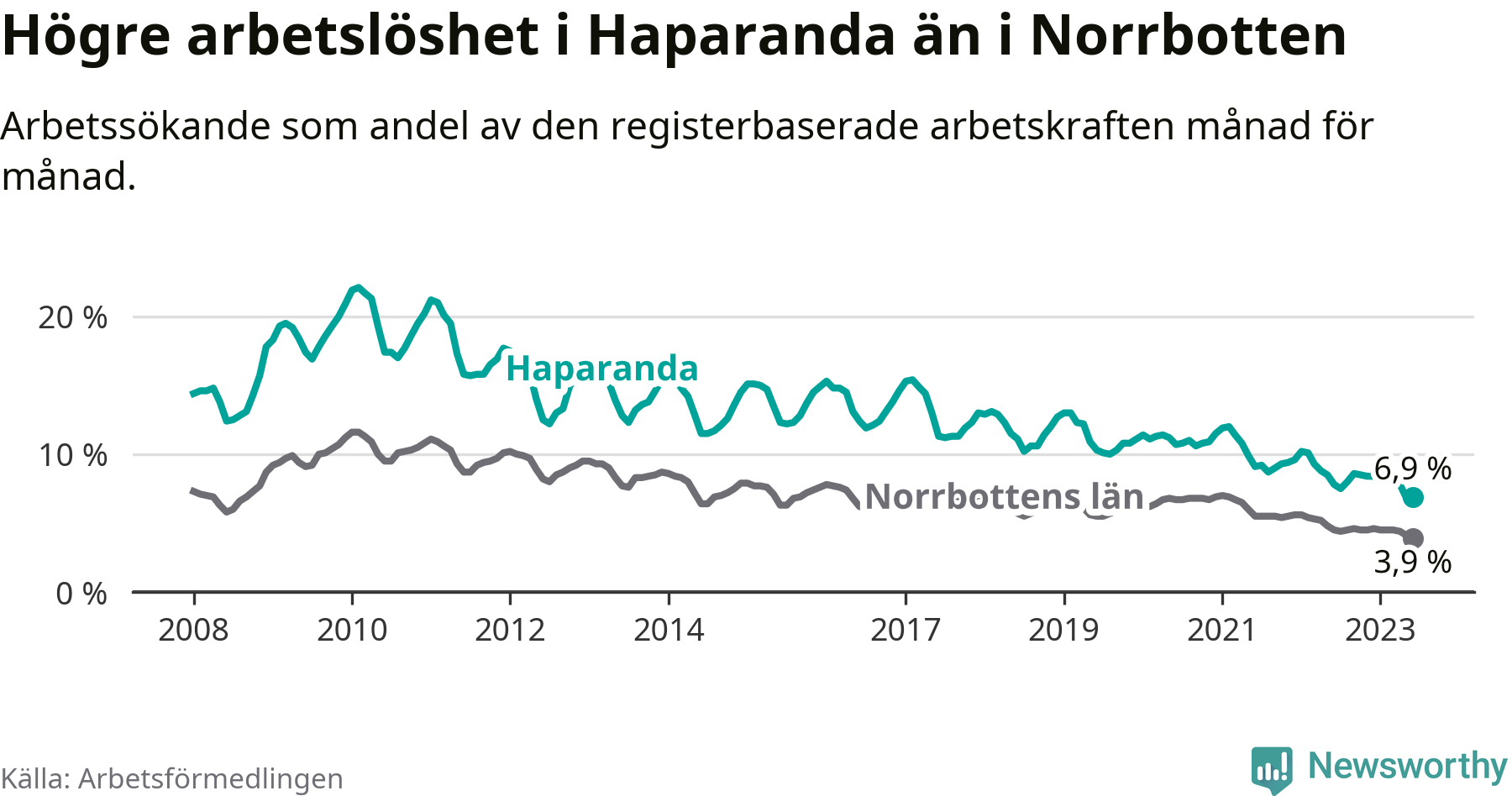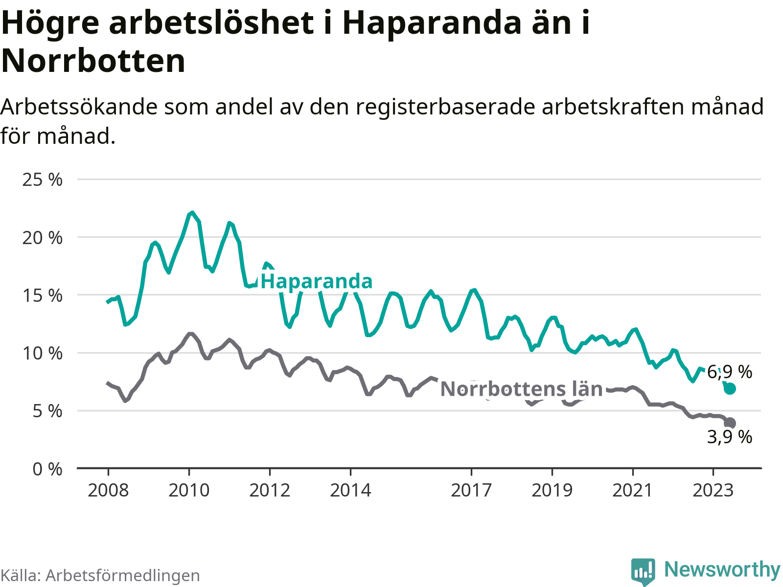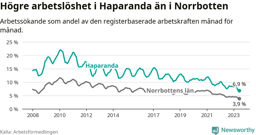 Det är 27:e månaden i följd som arbetslösheten i Haparanda är lägre än den var under samma tidpunkt året innan. Sedan mars 2021 har arbetslösheten gått ner från 11,4 till 6,9 procent.