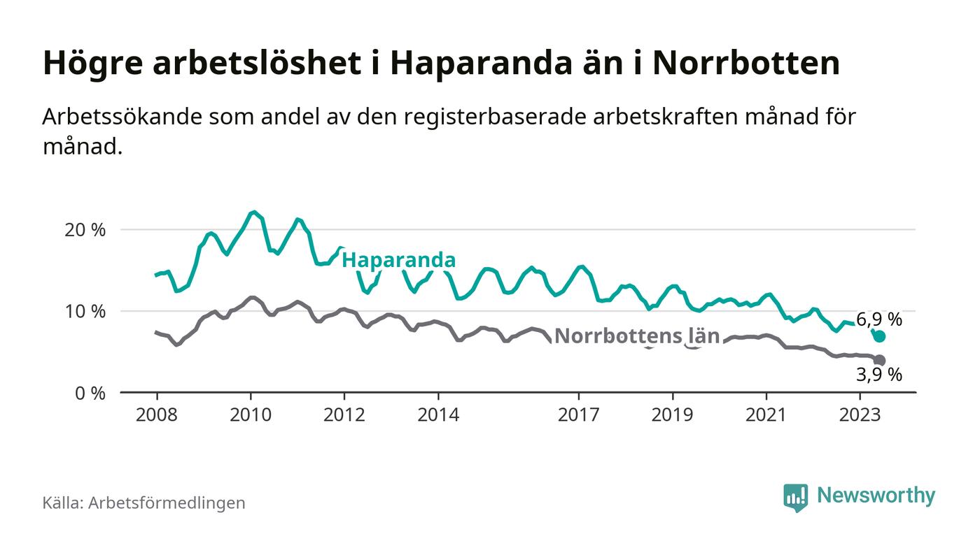 Även om arbetslösheten i Haparanda alltså minskar, så ligger den fortfarande över snittet i hela Norrbottens län (6,9 procent i kommunen, jämfört med 3,9 procent i hela länet). Haparanda har därmed även den högsta arbetslöshetsnivån i länet. Kiruna har den lägsta (2,2 procent). För att Haparanda skulle komma ner i samma arbetslöshetsnivå som Kiruna skulle 174 personer behöva sysselsättas.