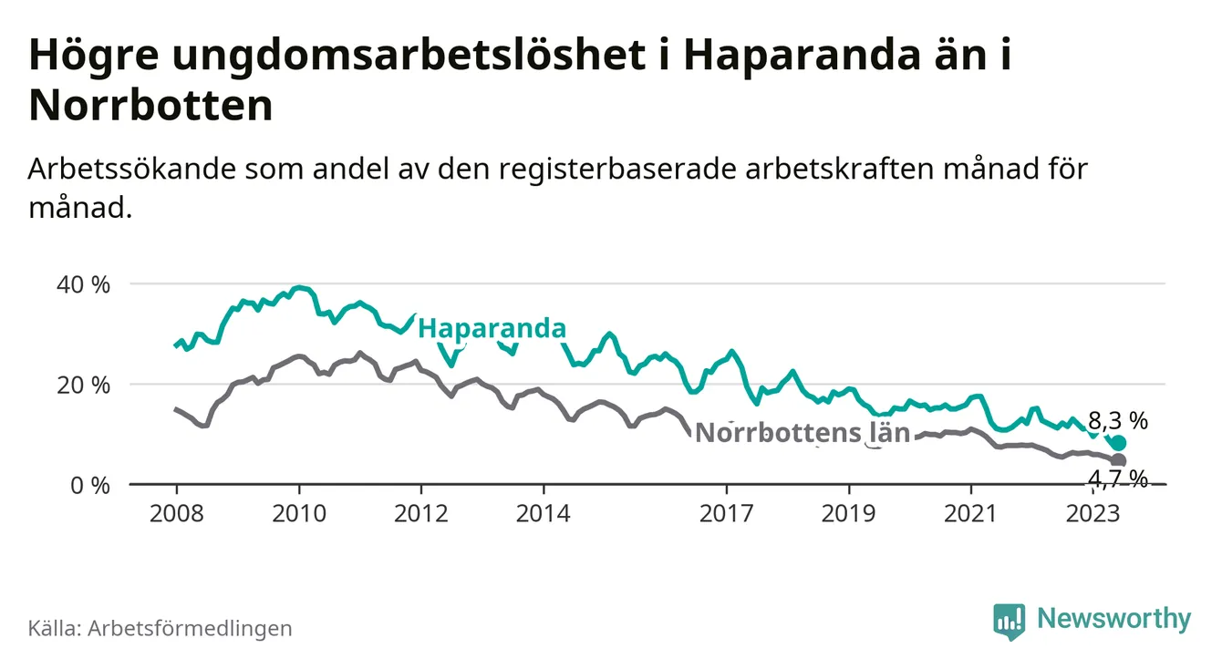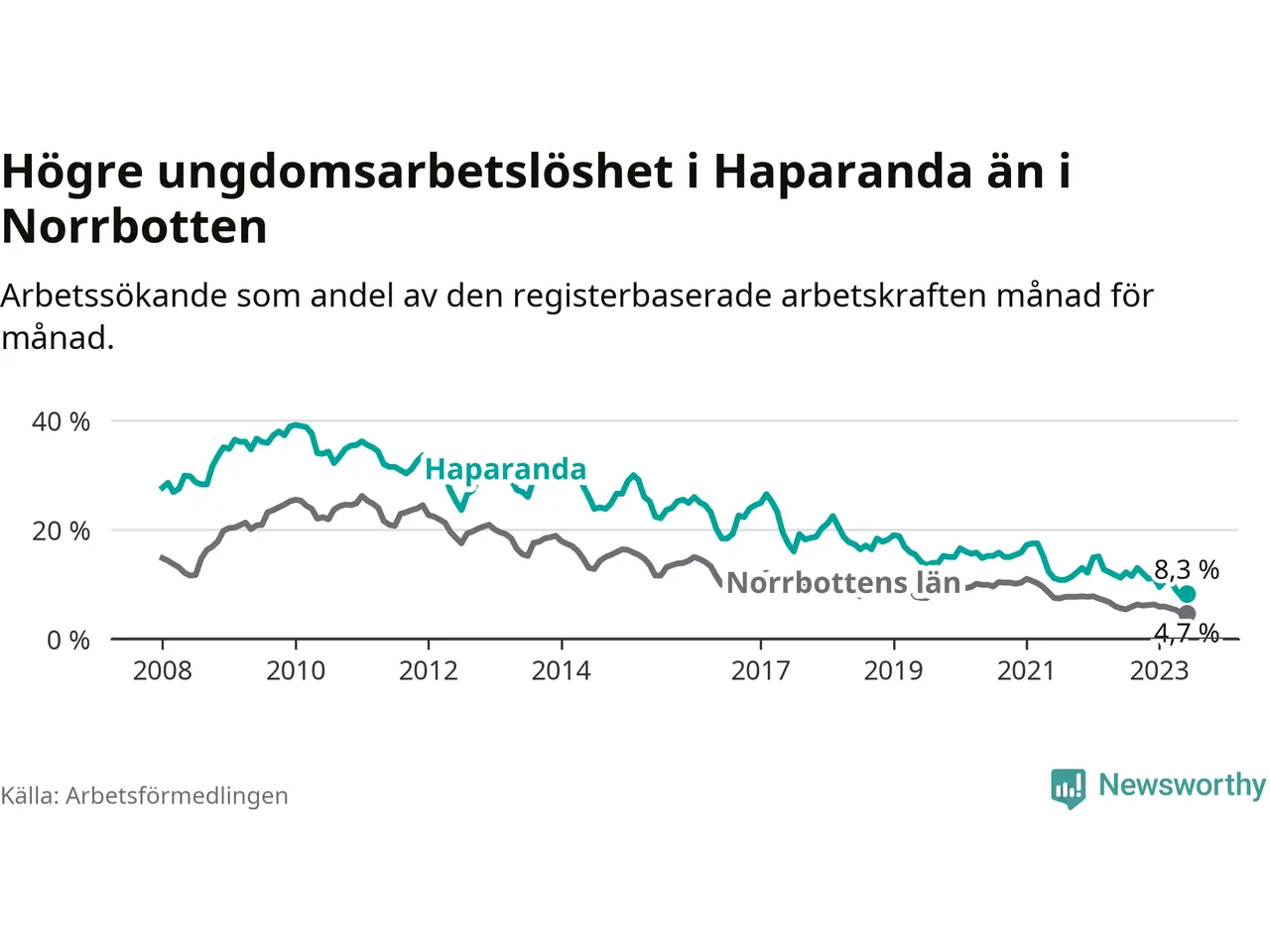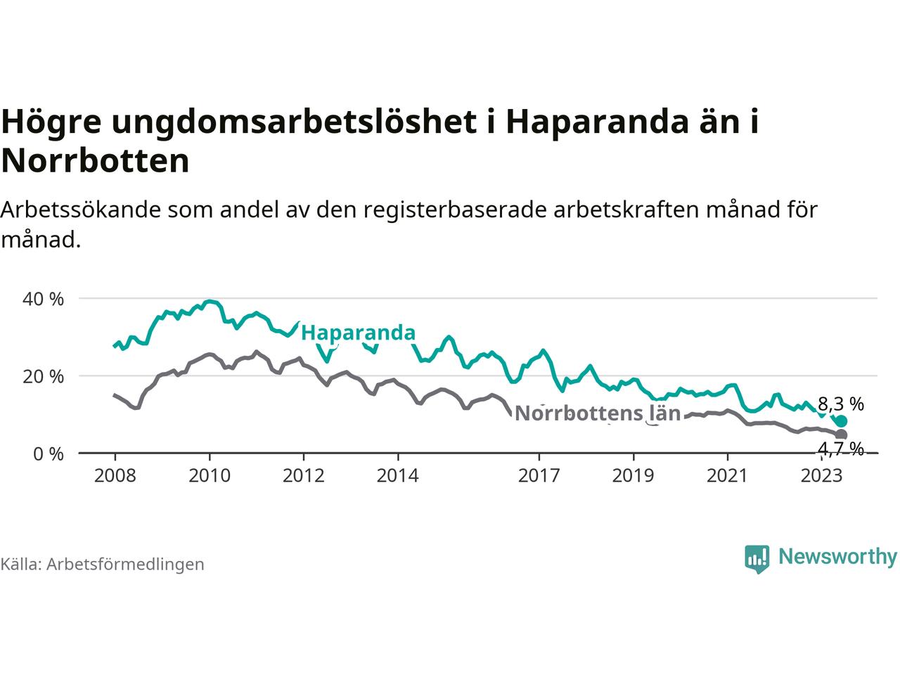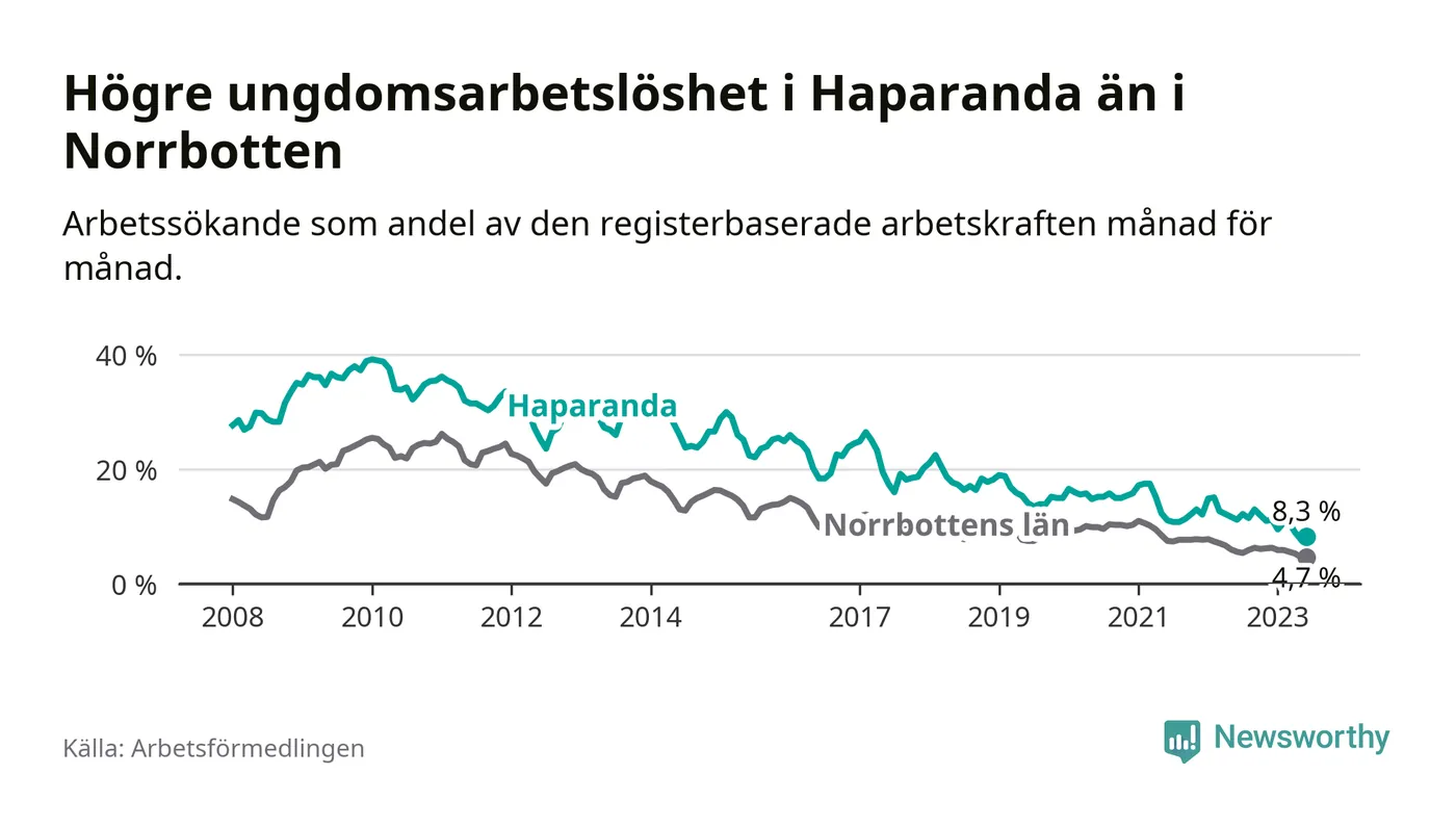 Precis som den totala arbetslösheten ligger ungdomsarbetslösheten i Haparanda högre än i Norrbotten som helhet. Skillnaden mellan kommunen och länet är 3,6 procentenheter.