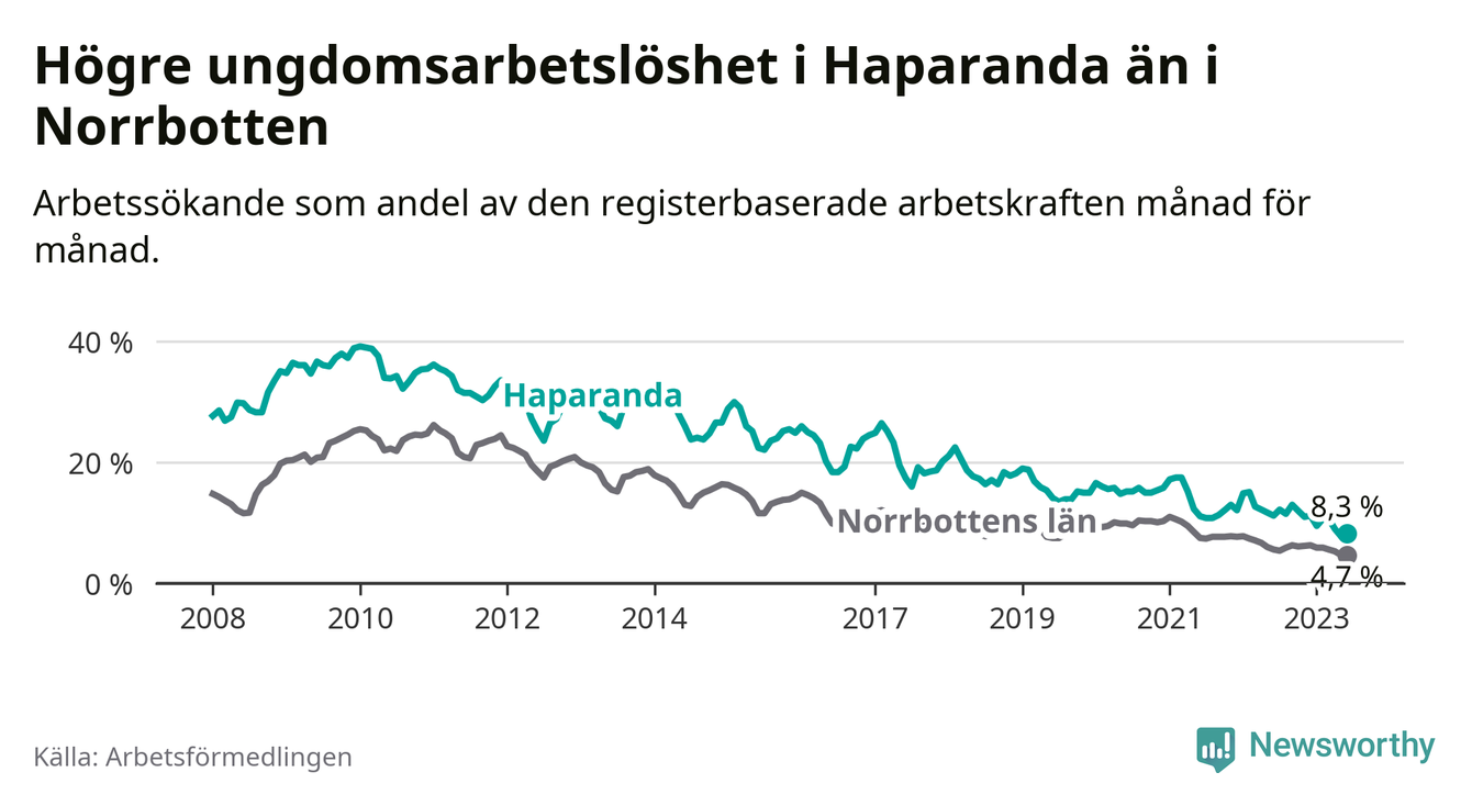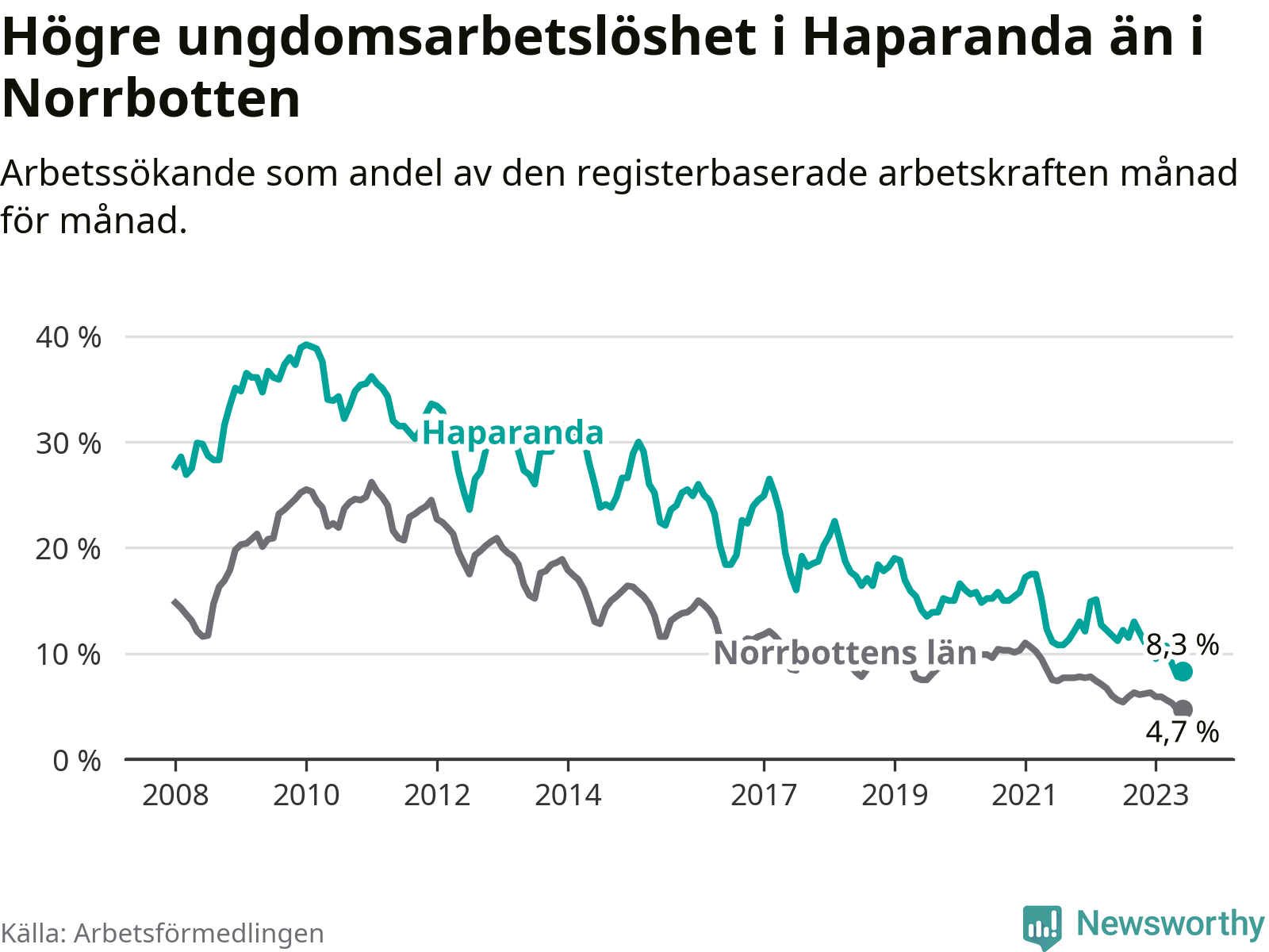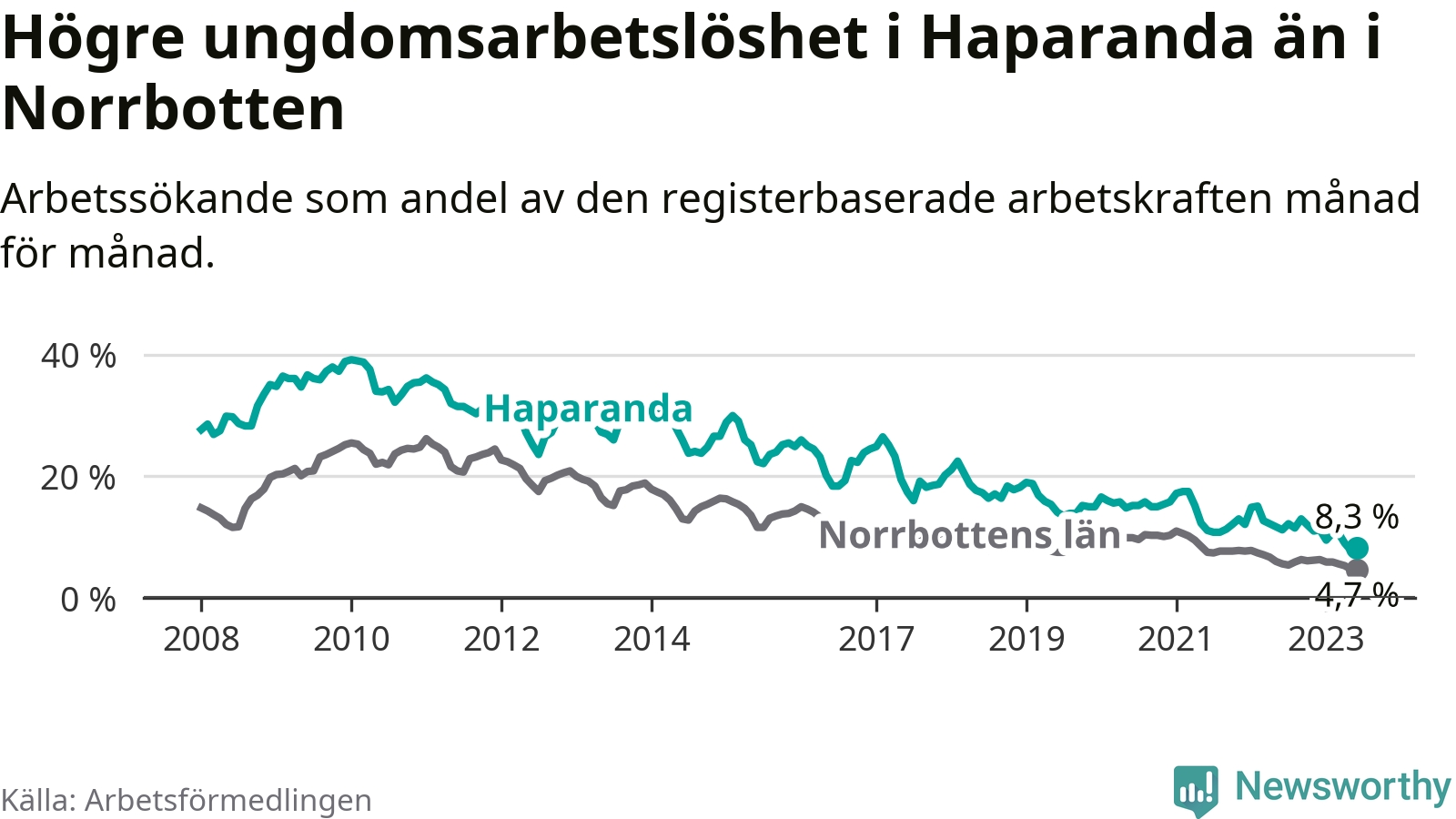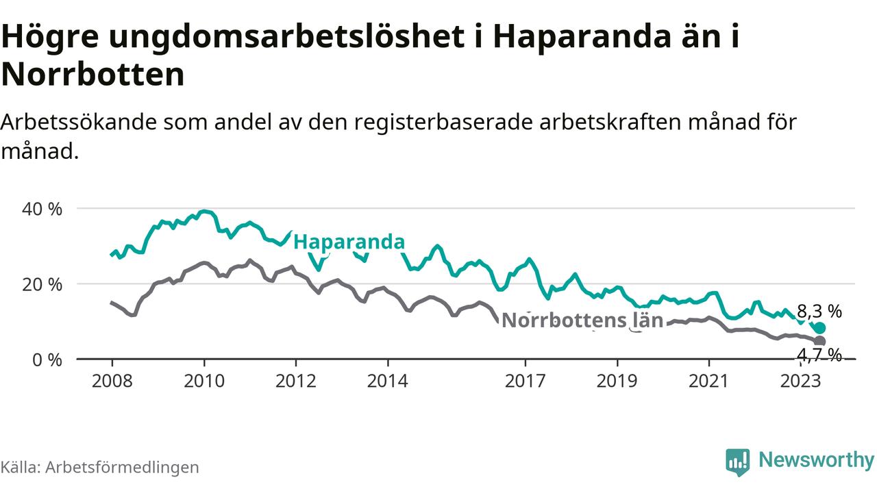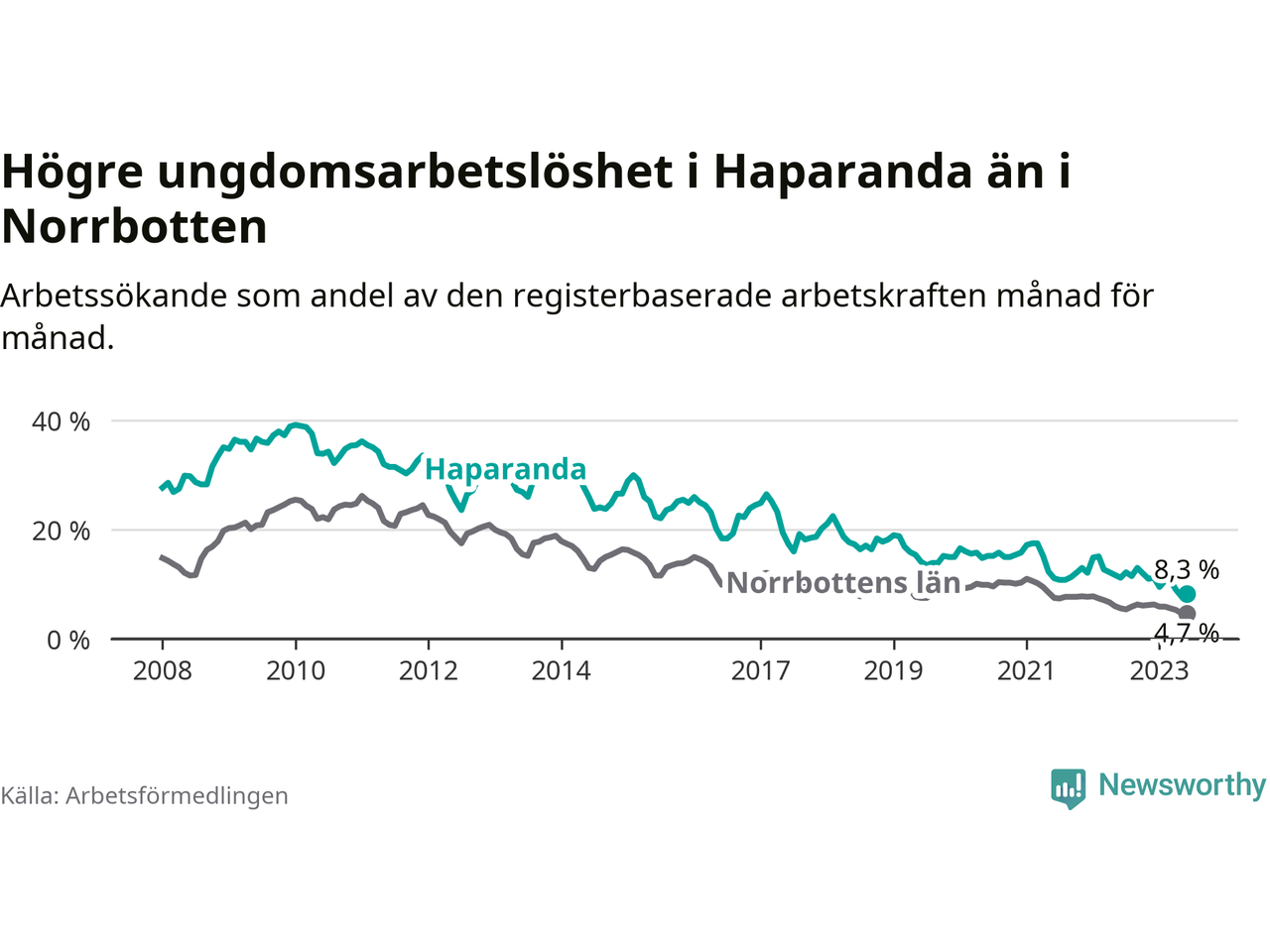Precis som den totala arbetslösheten ligger ungdomsarbetslösheten i Haparanda högre än i Norrbotten som helhet. Skillnaden mellan kommunen och länet är 3,6 procentenheter.