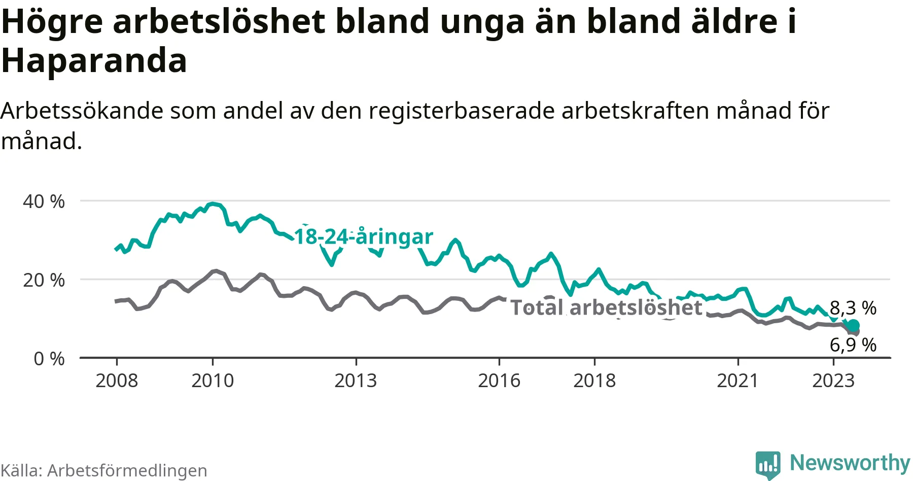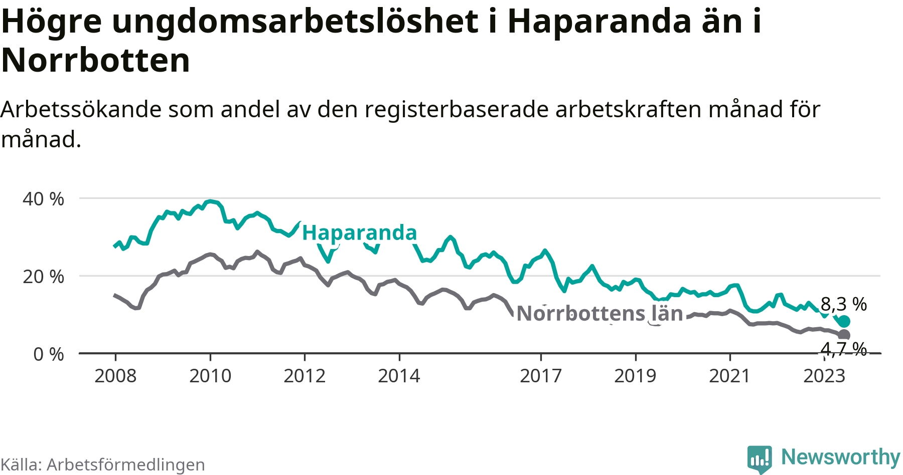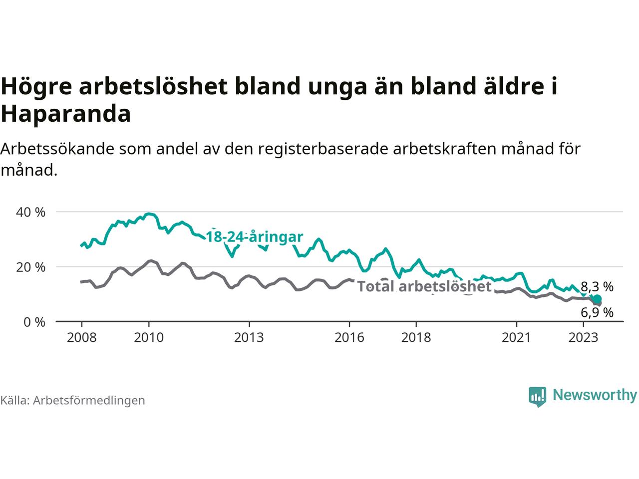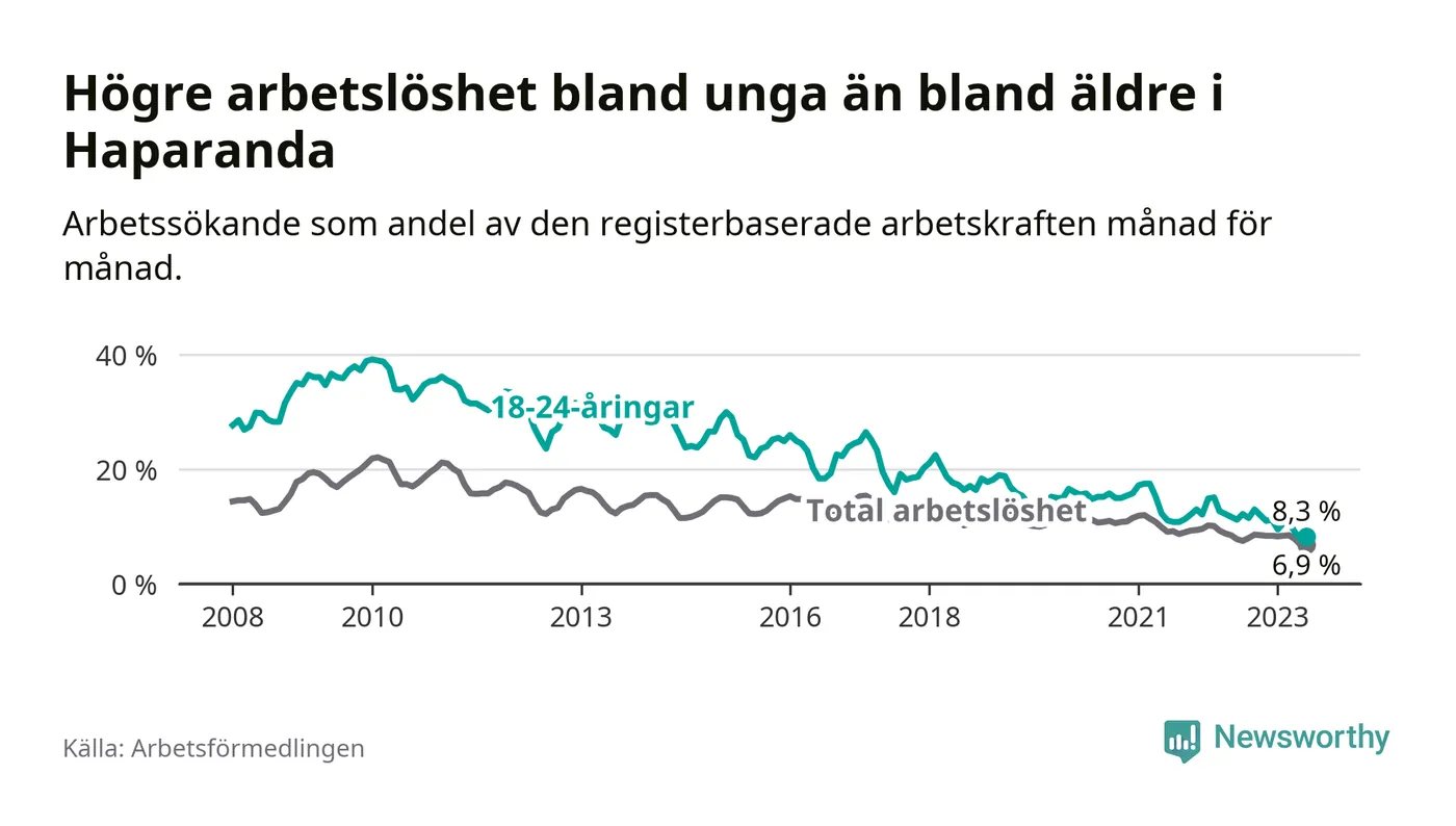 Precis som den totala arbetslösheten ligger ungdomsarbetslösheten i Haparanda högre än i Norrbotten som helhet. Skillnaden mellan kommunen och länet är 3,6 procentenheter.