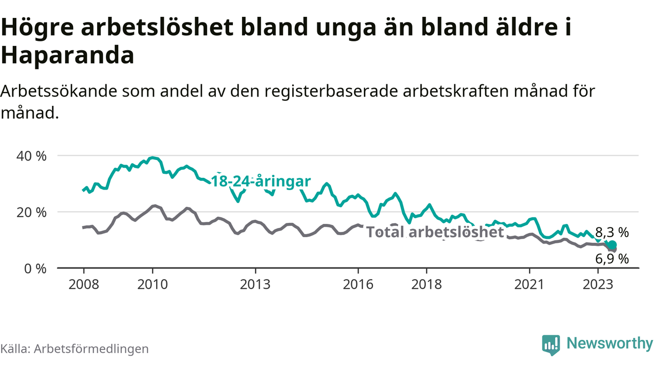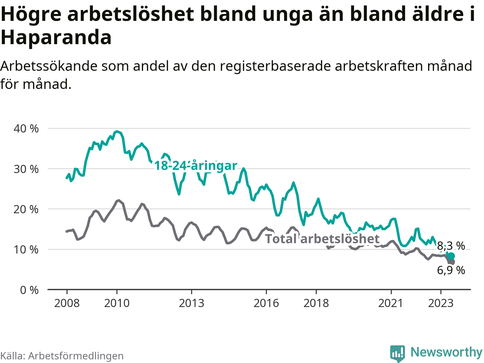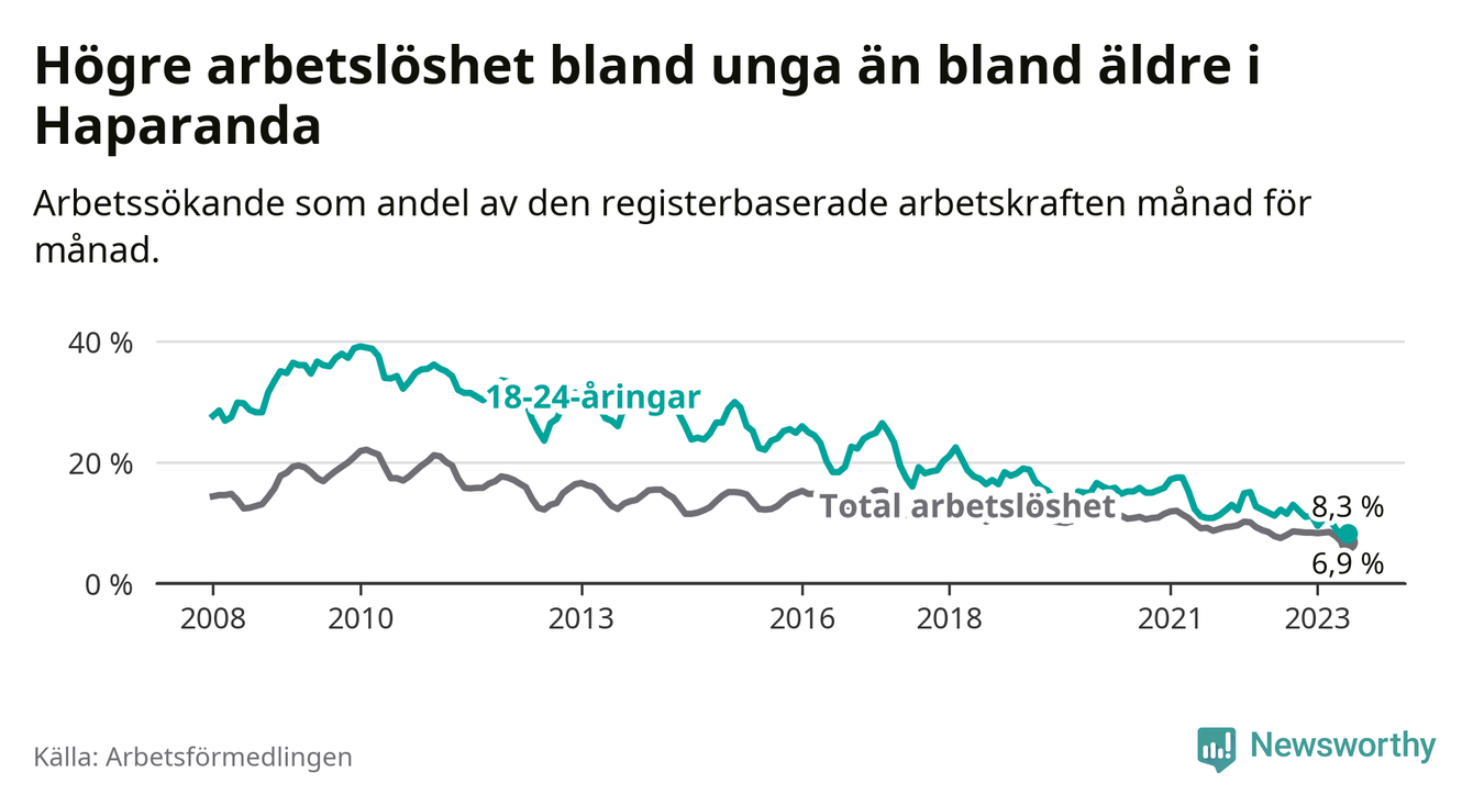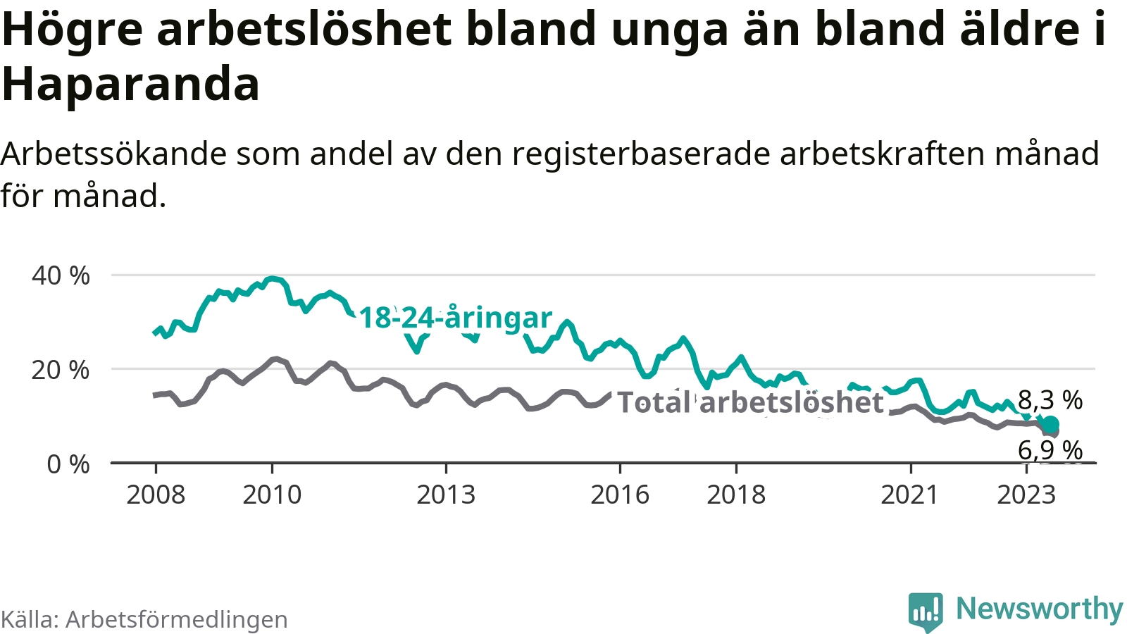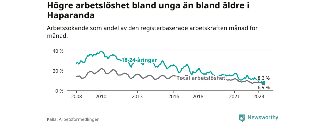 Precis som den totala arbetslösheten ligger ungdomsarbetslösheten i Haparanda högre än i Norrbotten som helhet. Skillnaden mellan kommunen och länet är 3,6 procentenheter.