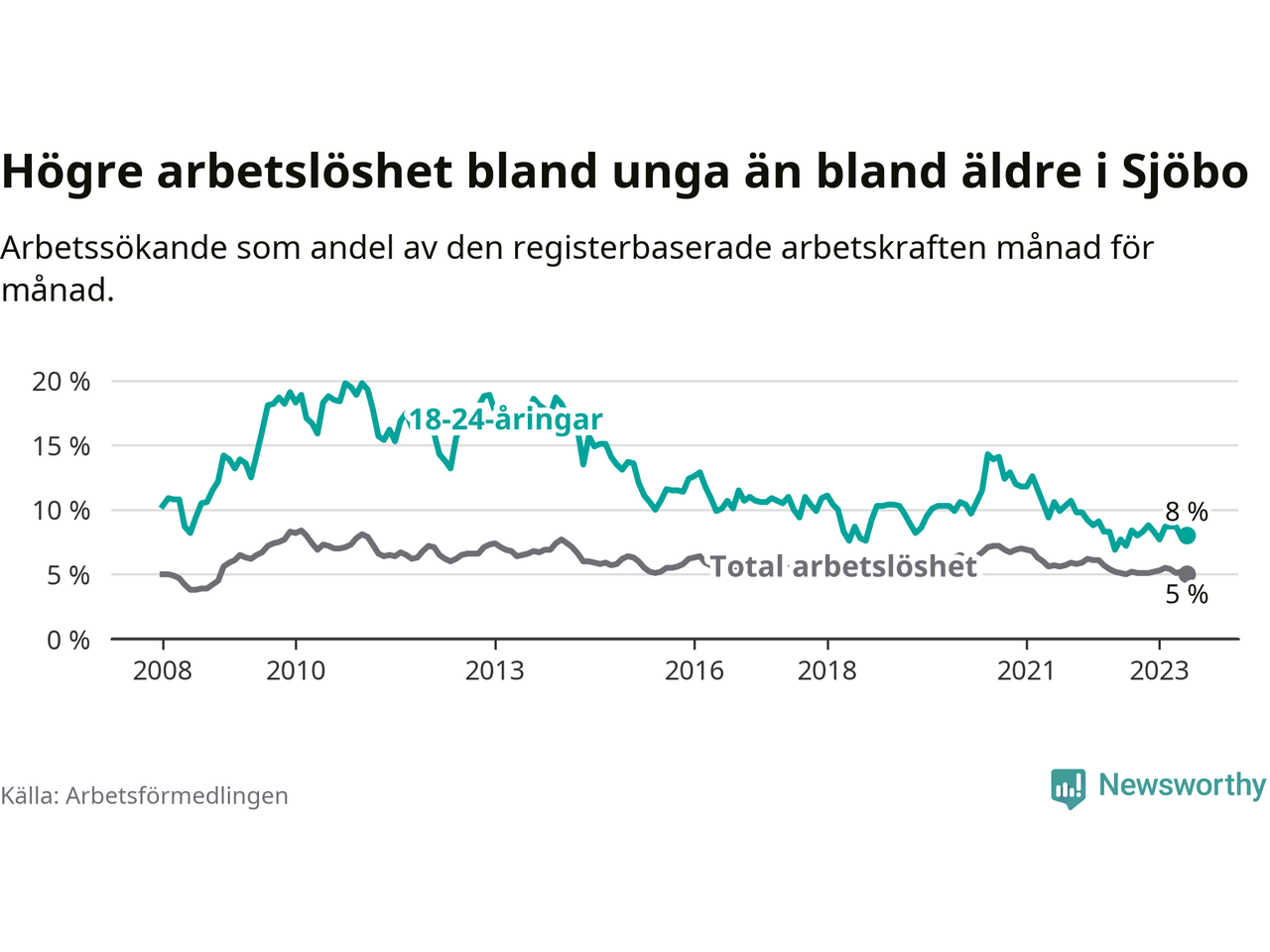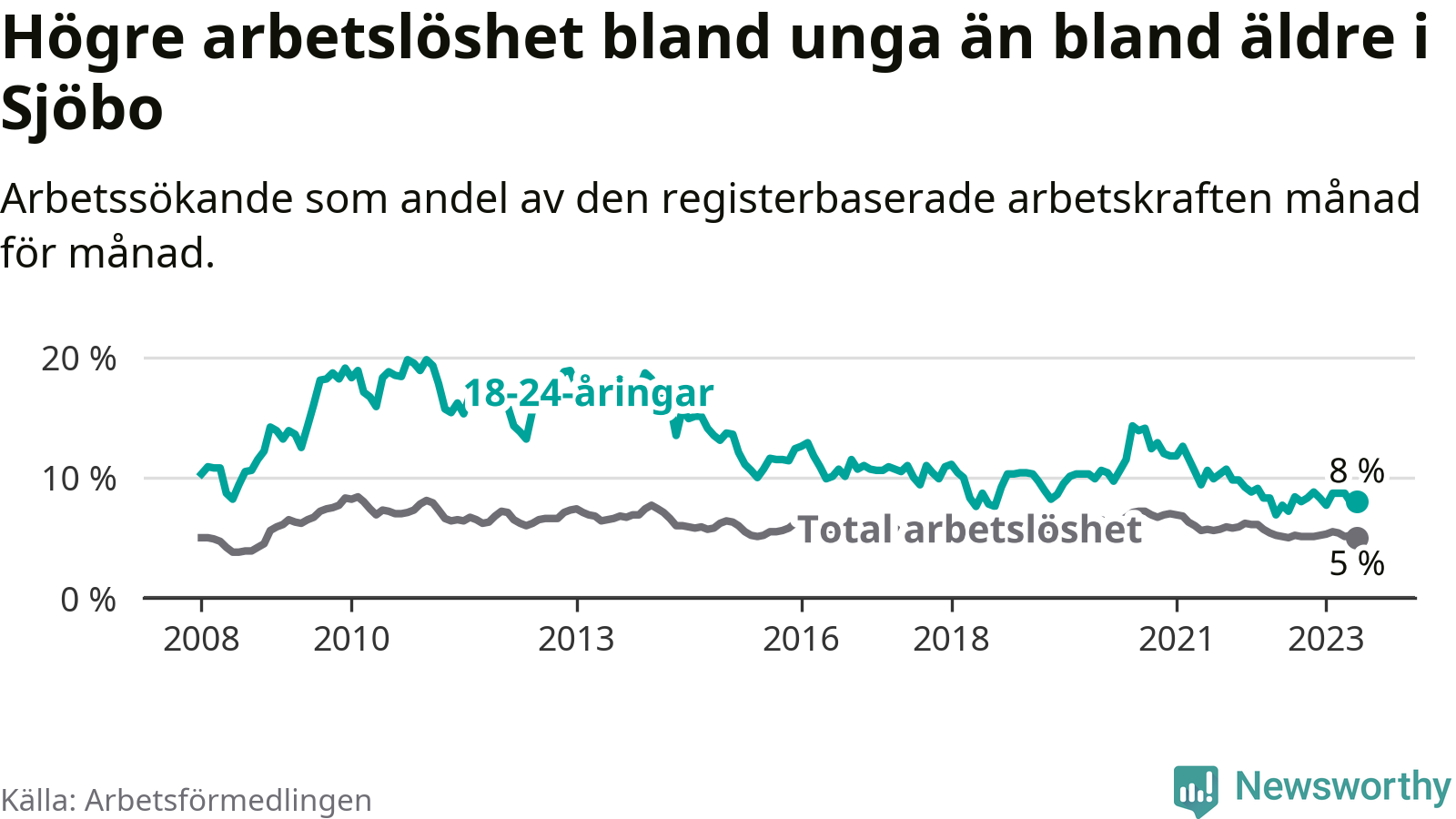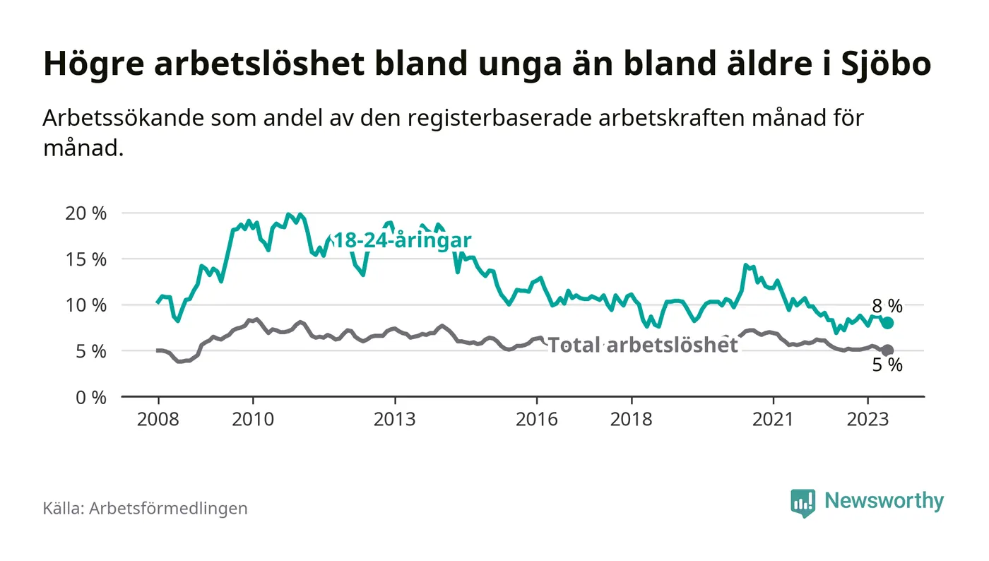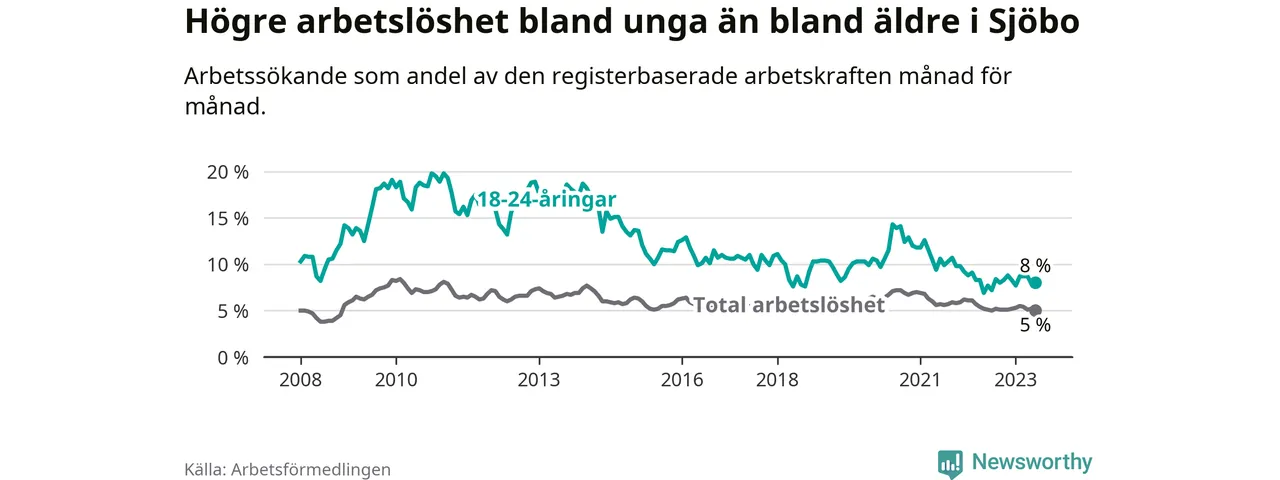 Till skillnad från den totala arbetslösheten stiger arbetslösheten bland unga (+0,3 procentenheter). I juni var 8,0 procent av 18–24-åringarna inskrivna som arbetssökande (motsvarande 66 personer). Mäter vi antalet inskrivna ser vi en ökning med åtta personer på ett års sikt.