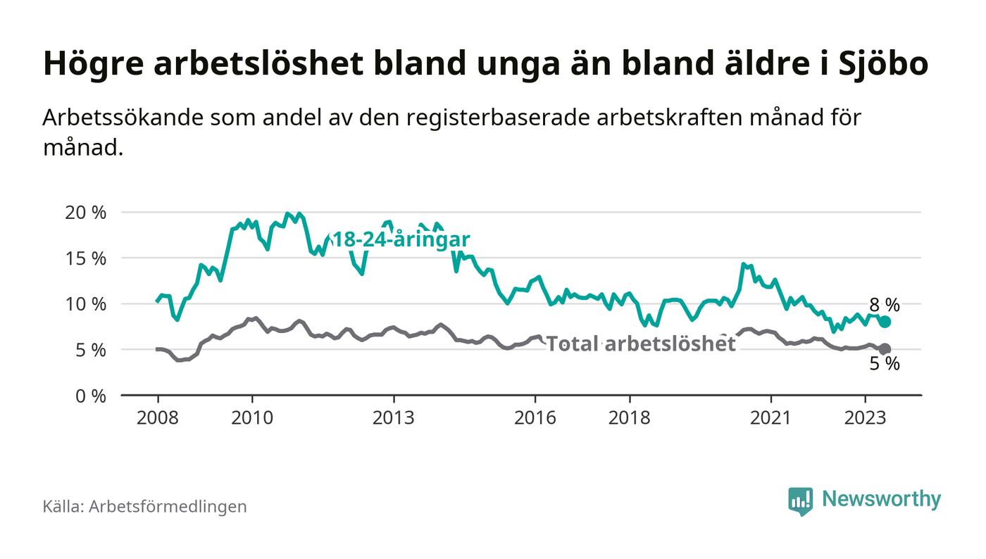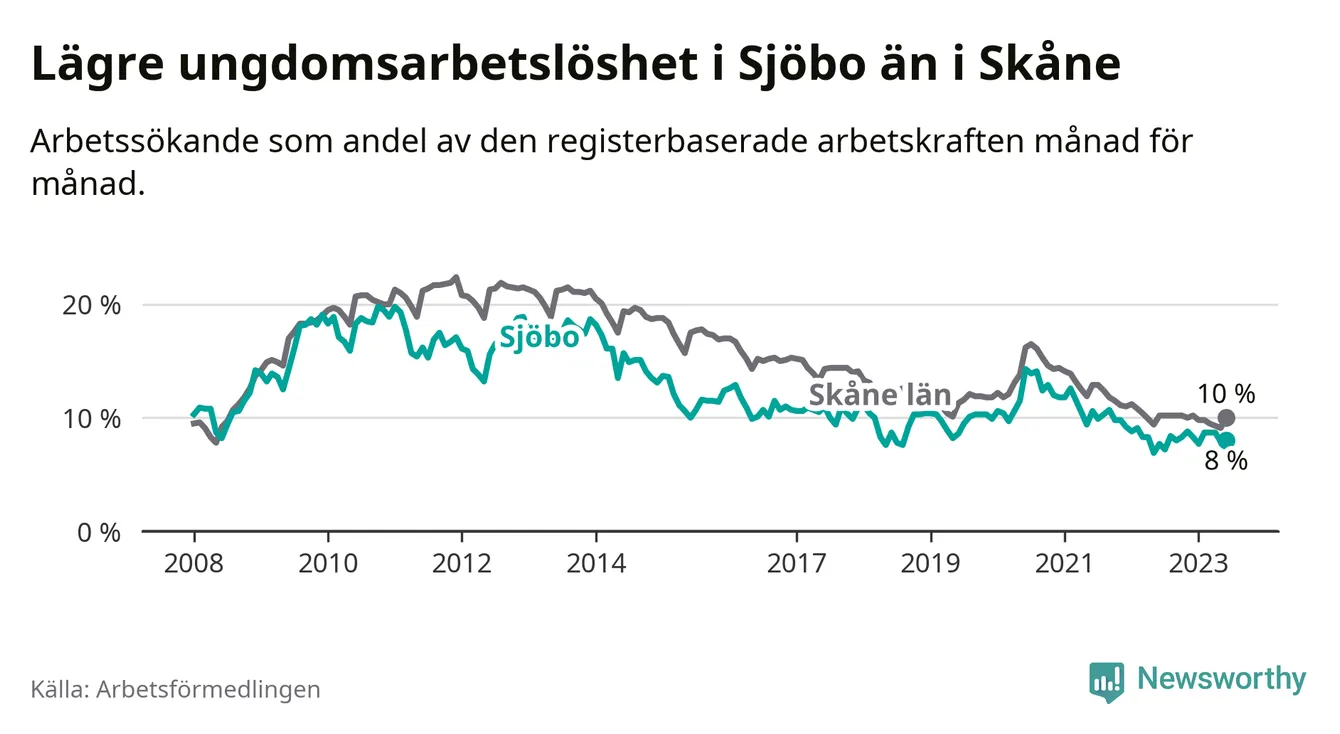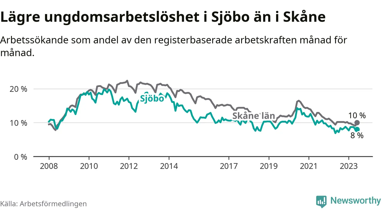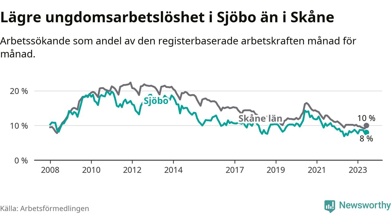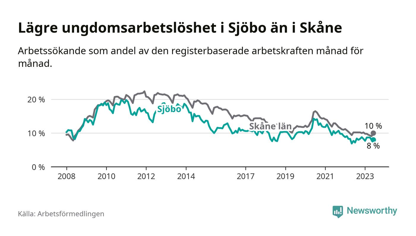 Precis som den totala arbetslösheten ligger ungdomsarbetslösheten i Sjöbo lägre än i Skåne som helhet. Skillnaden mellan kommunen och länet är 2,0 procentenheter.