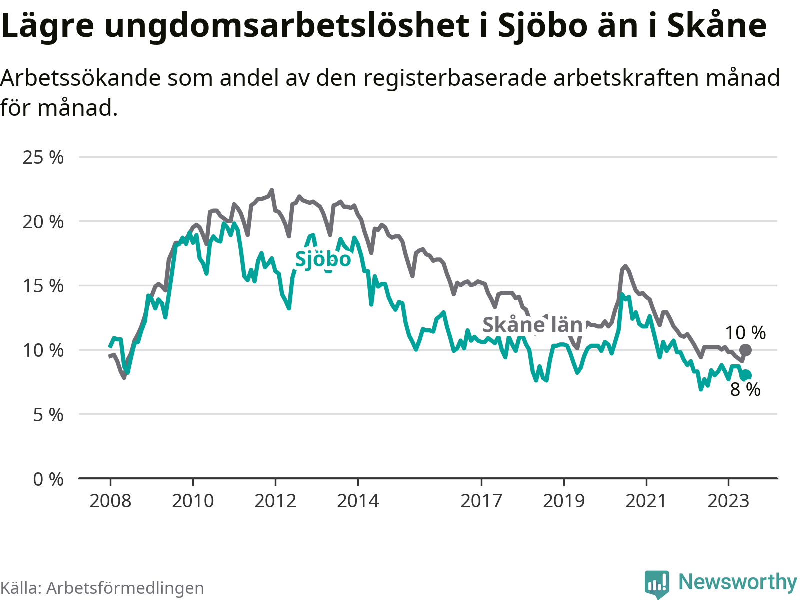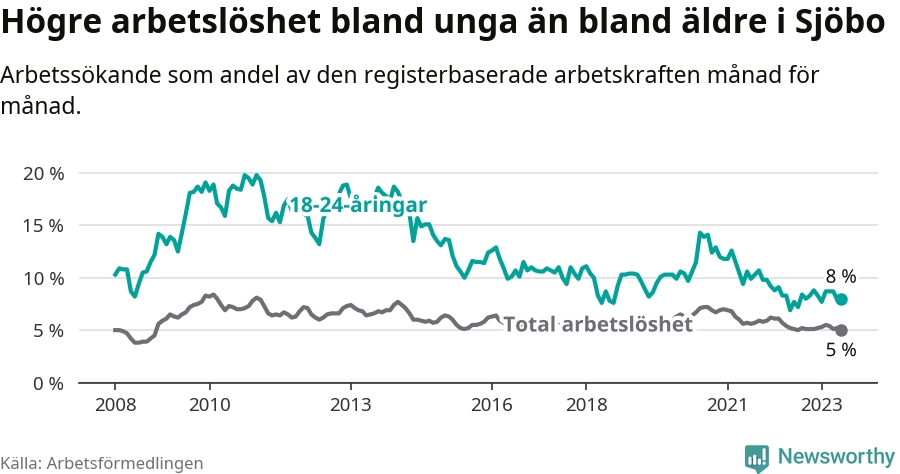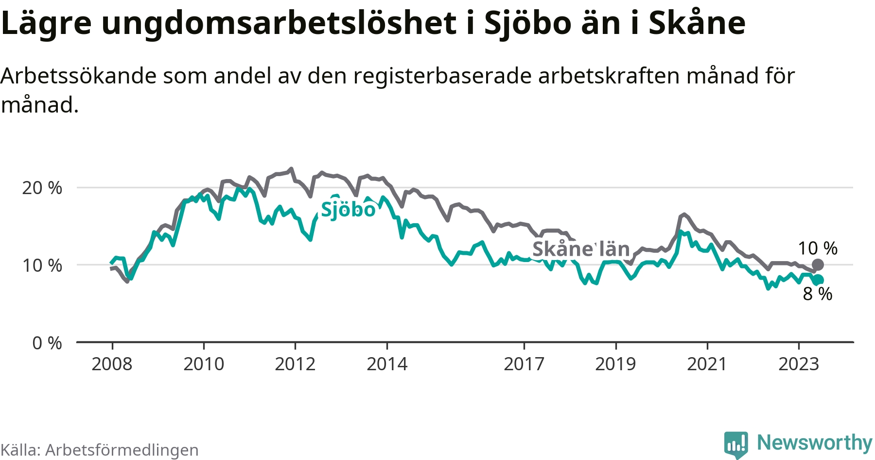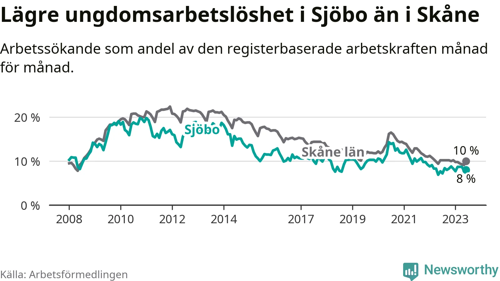 Precis som den totala arbetslösheten ligger ungdomsarbetslösheten i Sjöbo lägre än i Skåne som helhet. Skillnaden mellan kommunen och länet är 2,0 procentenheter.