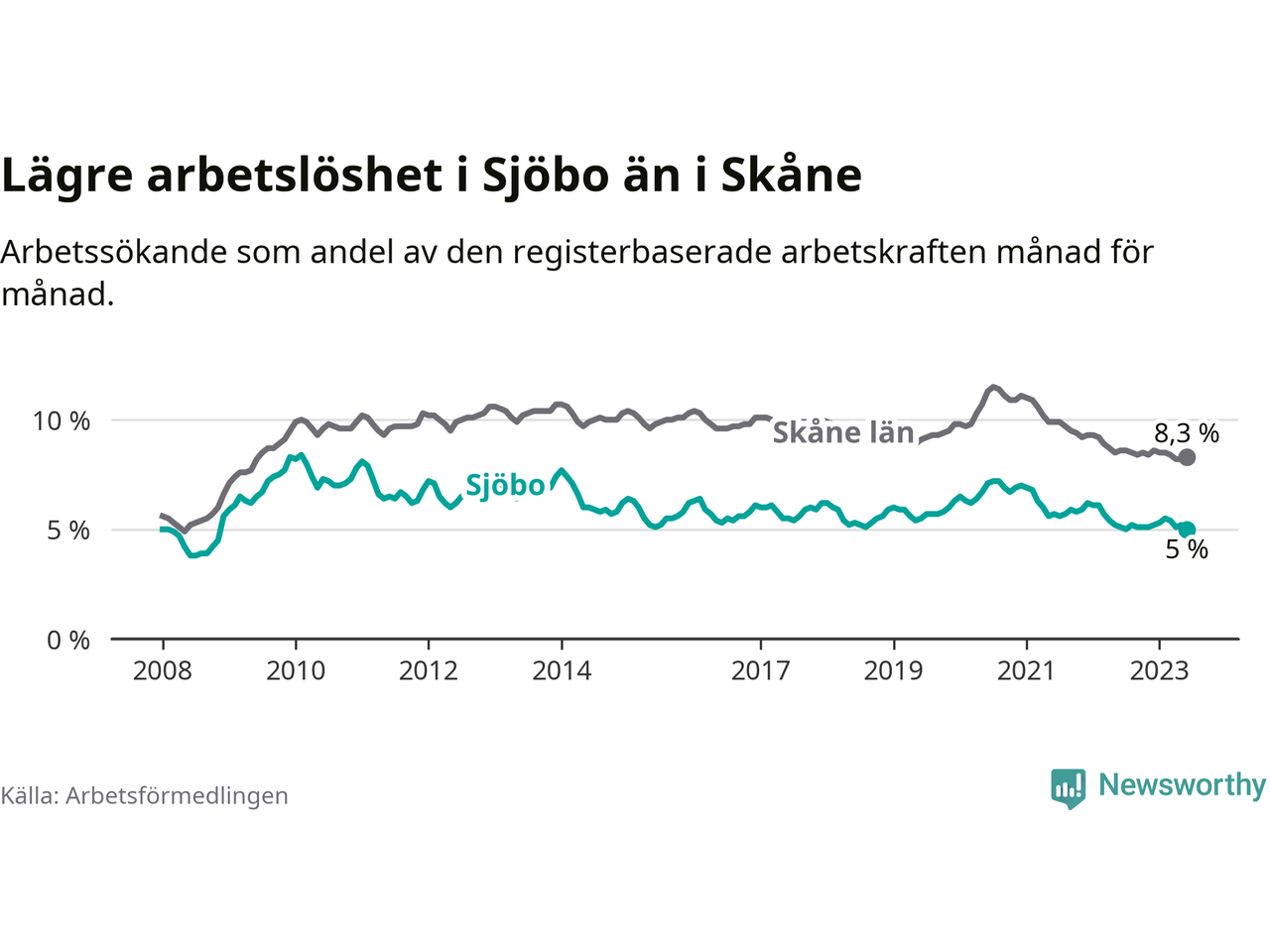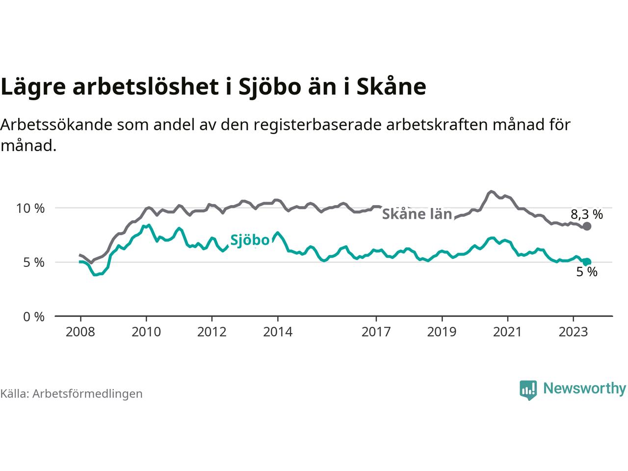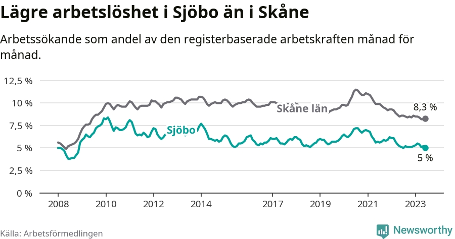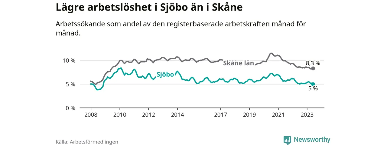 Under juni månad rapporterade Sjöbo kommun en total arbetslöshet på 5,0 procent. Det är en minskning jämfört med samma tidpunkt i fjol (−0,1 procentenheter). Även i Skåne län sjunker arbetslösheten .