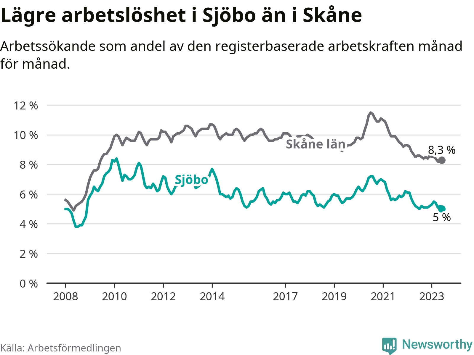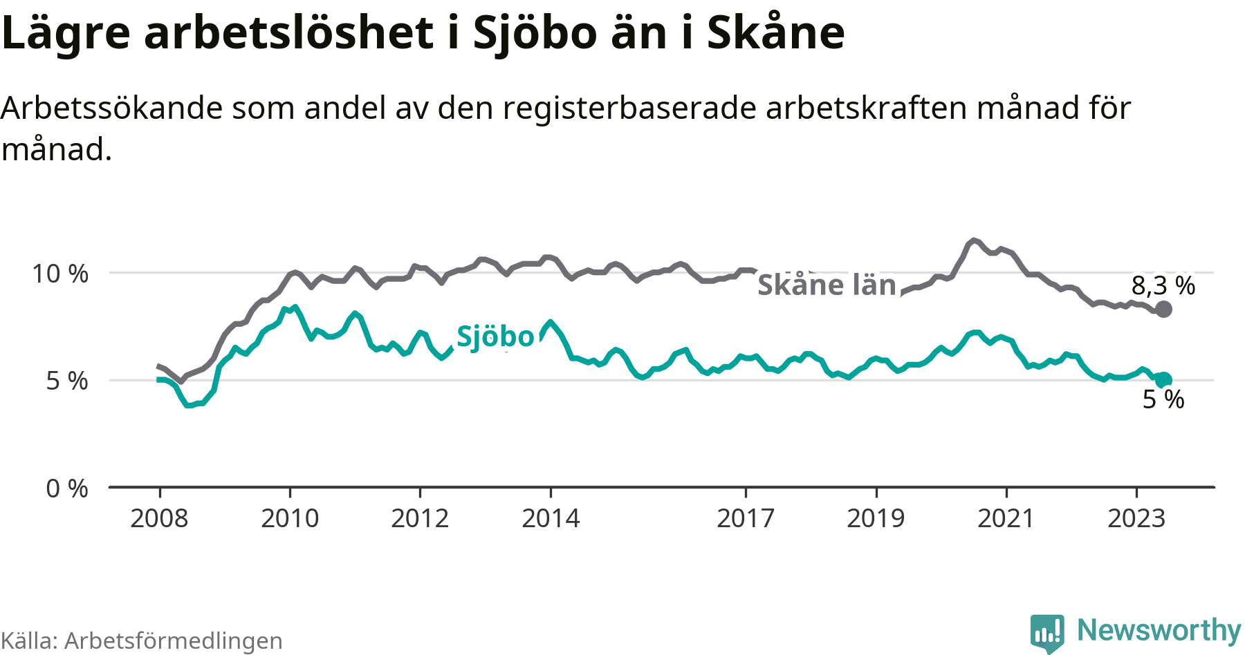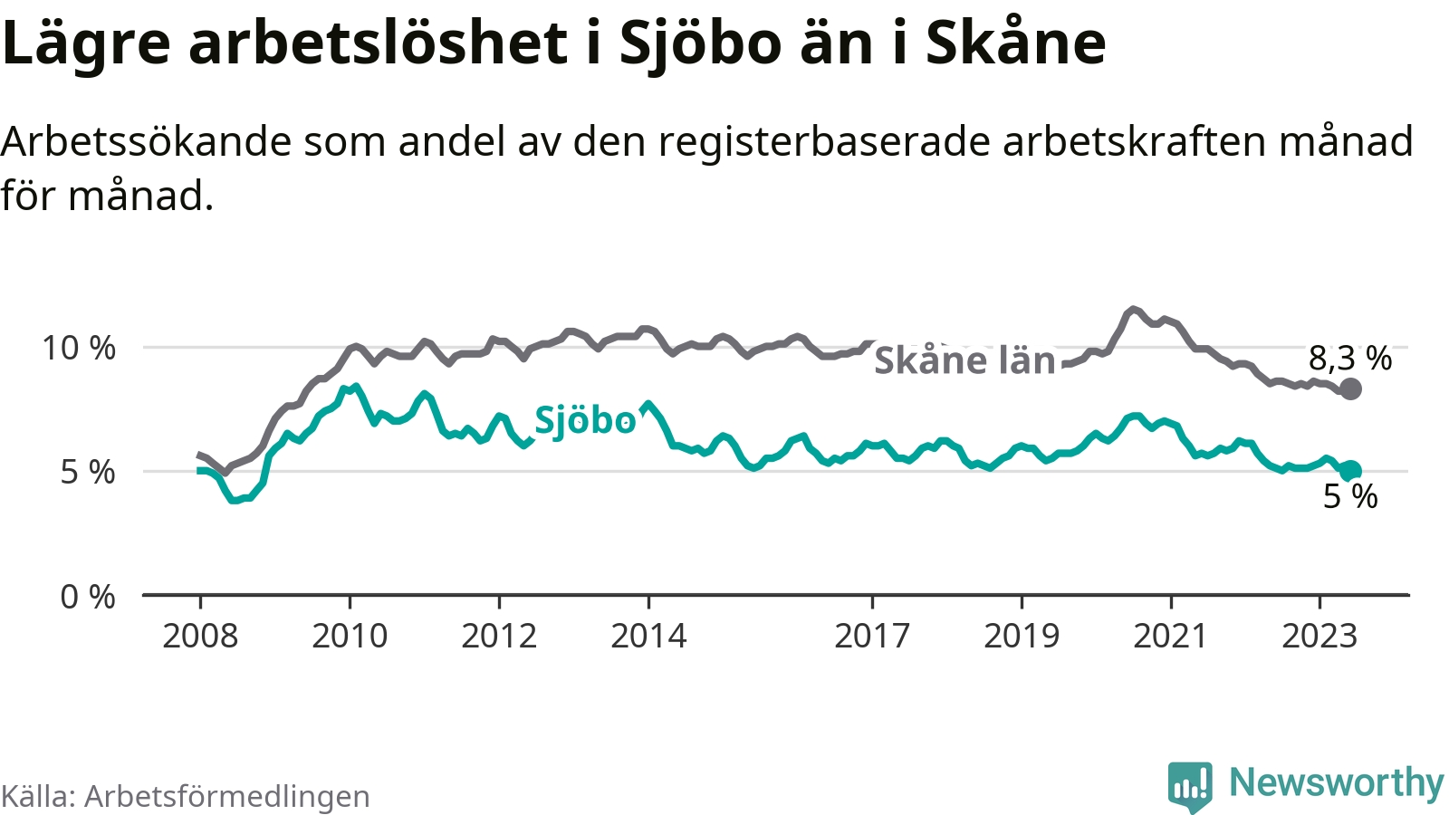 Under juni månad rapporterade Sjöbo kommun en total arbetslöshet på 5,0 procent. Det är en minskning jämfört med samma tidpunkt i fjol (−0,1 procentenheter). Även i Skåne län sjunker arbetslösheten .