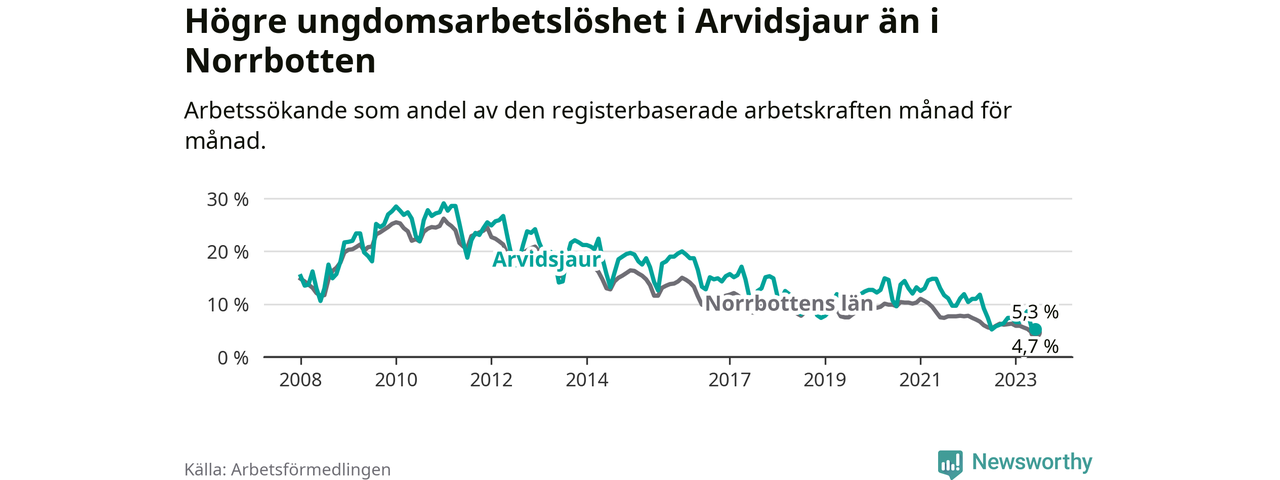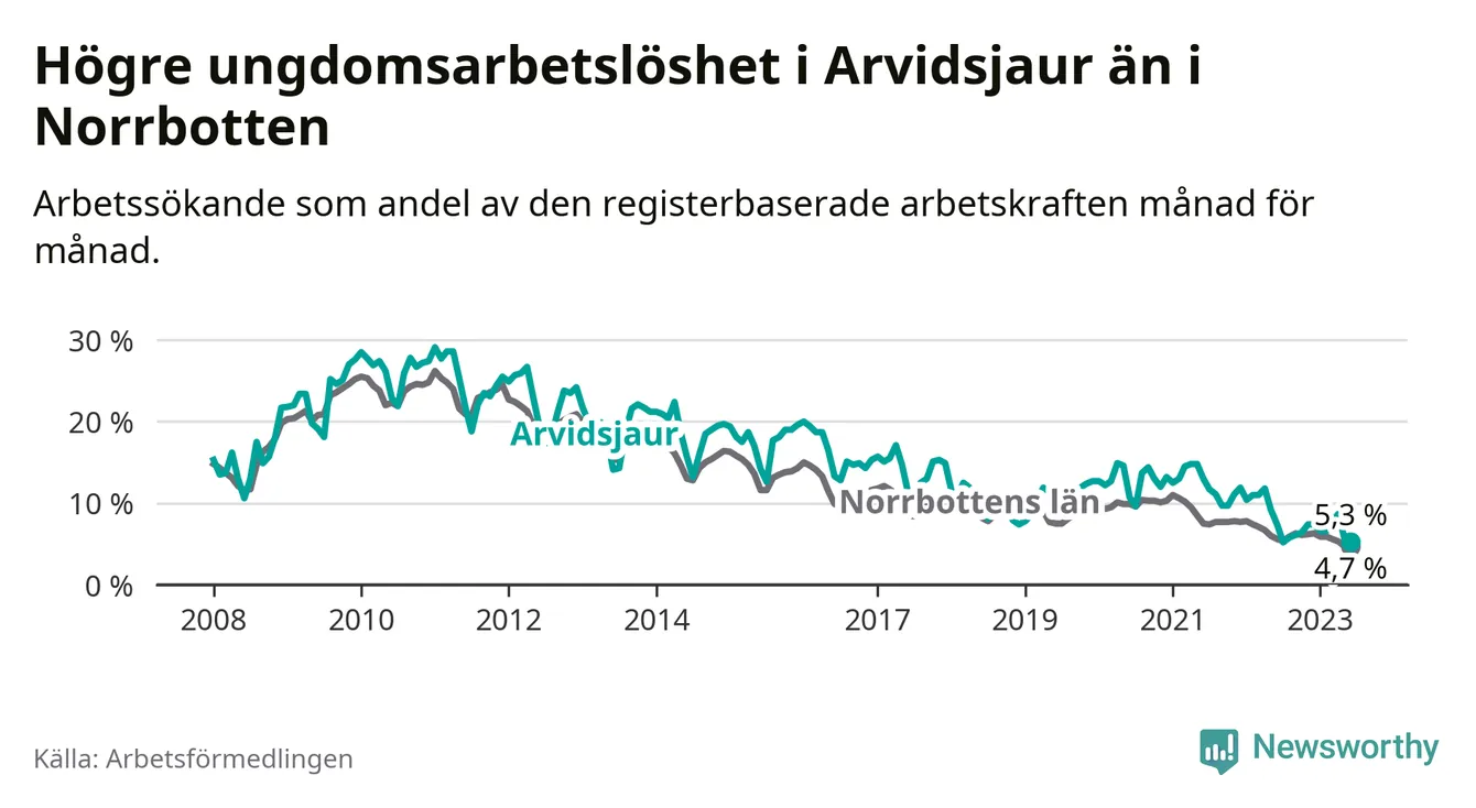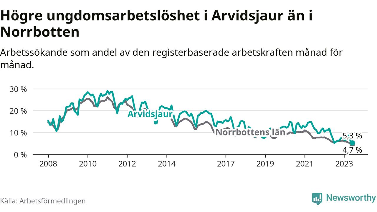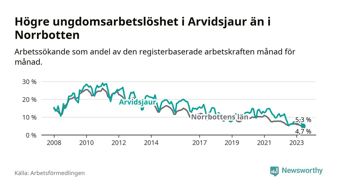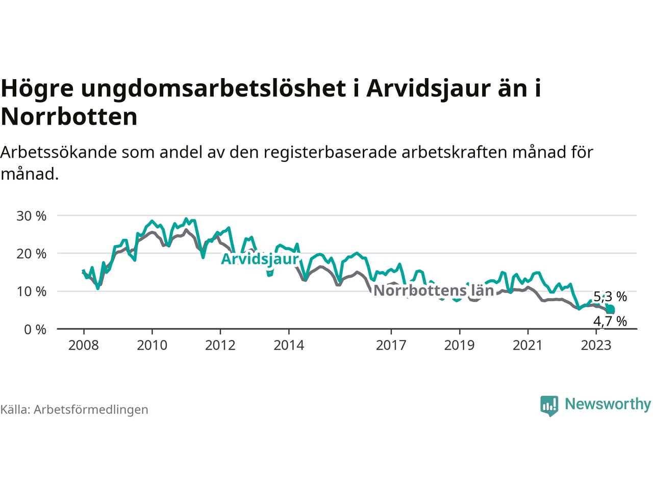 Medan Arvidsjaur har lägre total arbetslöshet än Norrbotten, ligger ungdomsarbetslösheten 0,6 procentenheter högre i Arvidsjaur.