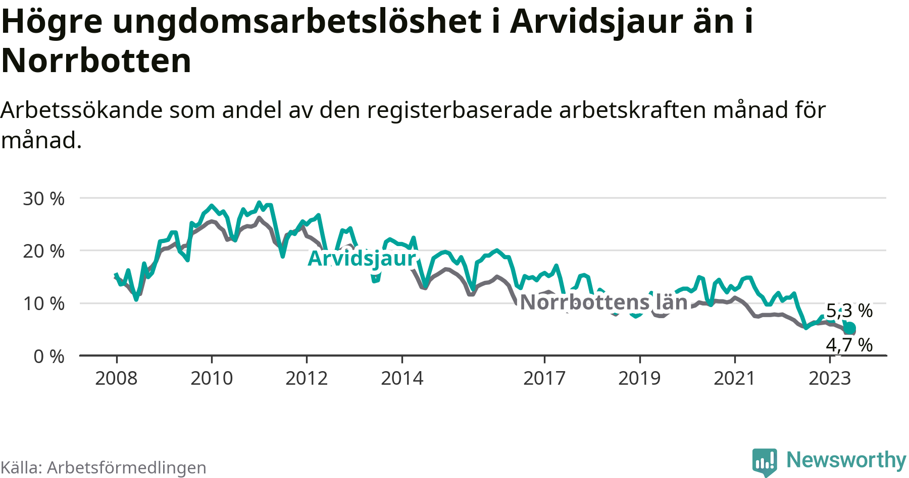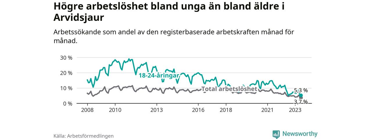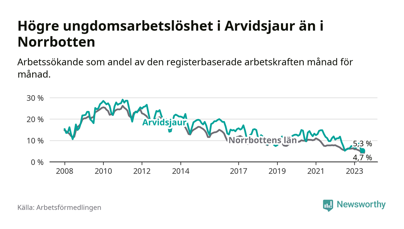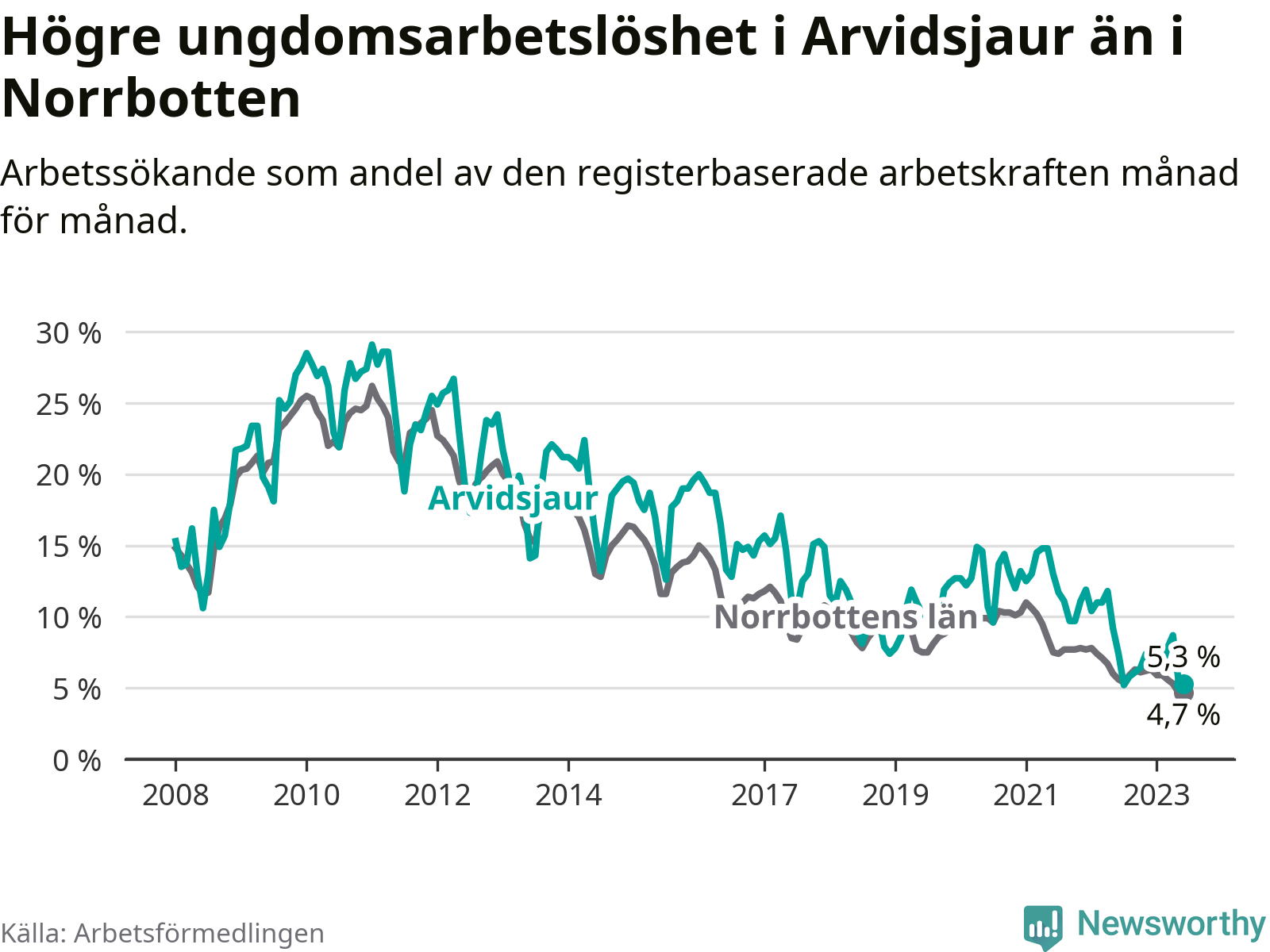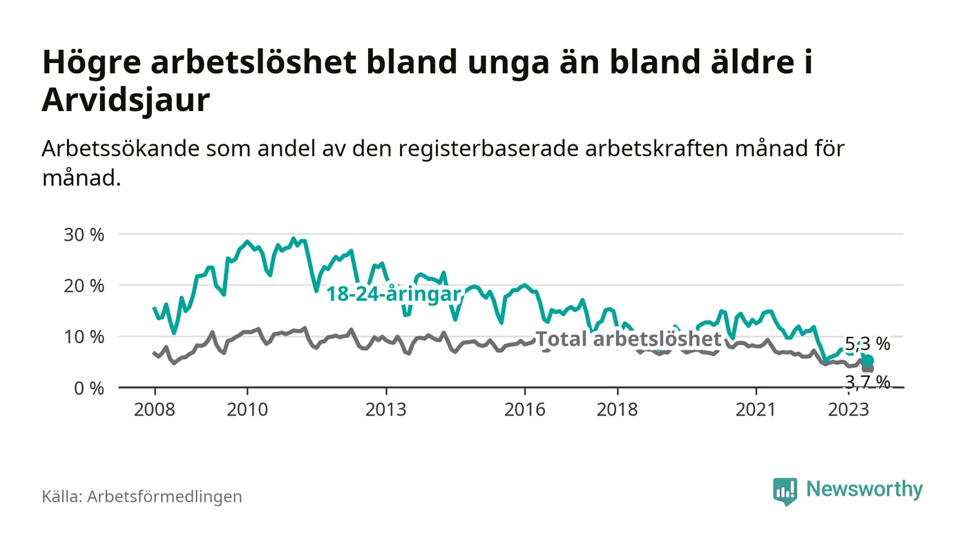 Medan Arvidsjaur har lägre total arbetslöshet än Norrbotten, ligger ungdomsarbetslösheten 0,6 procentenheter högre i Arvidsjaur.