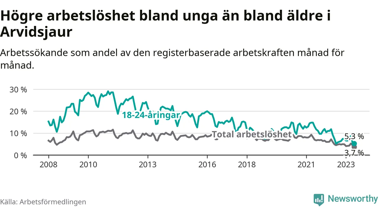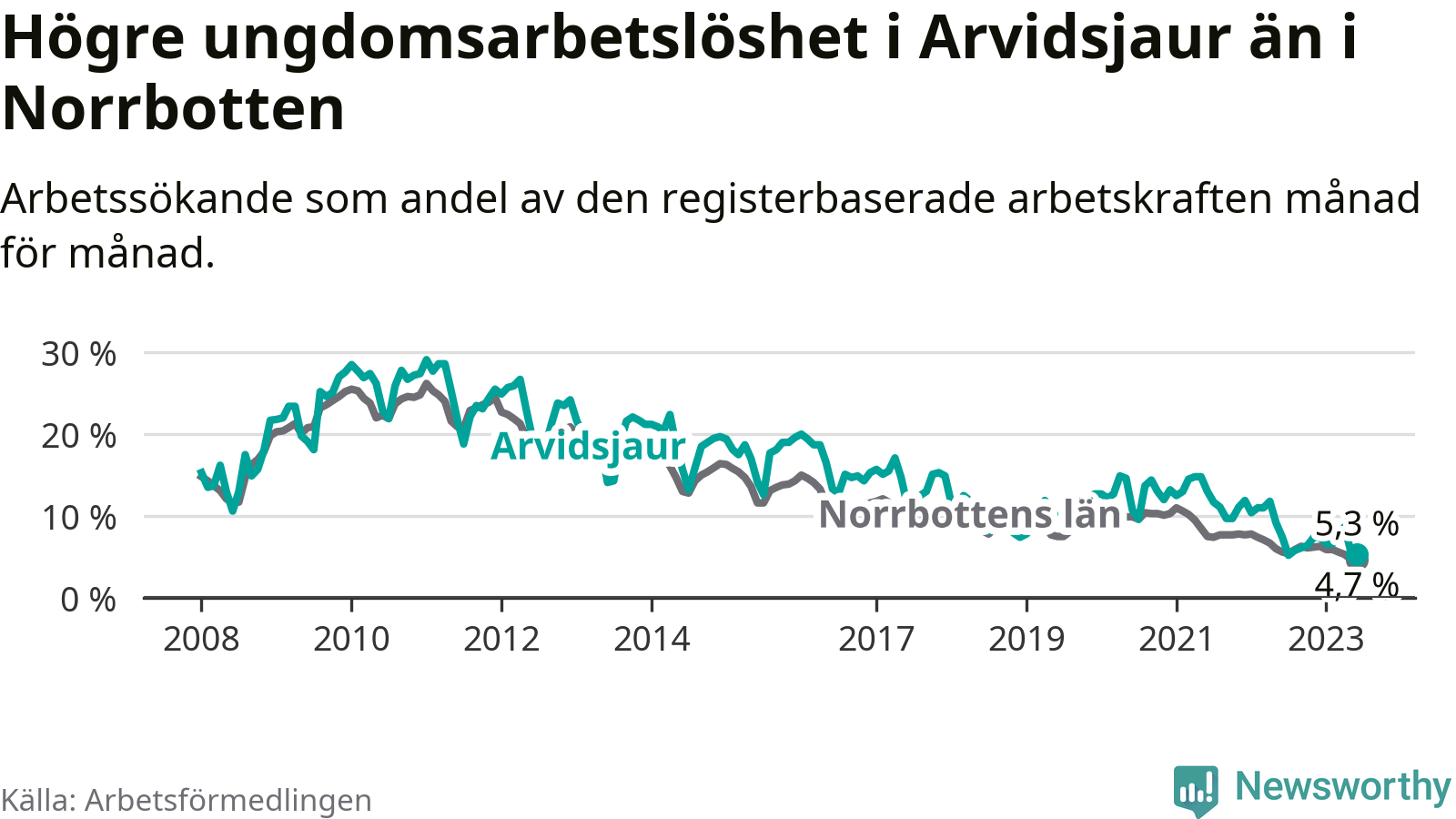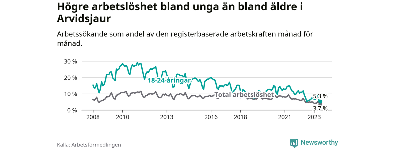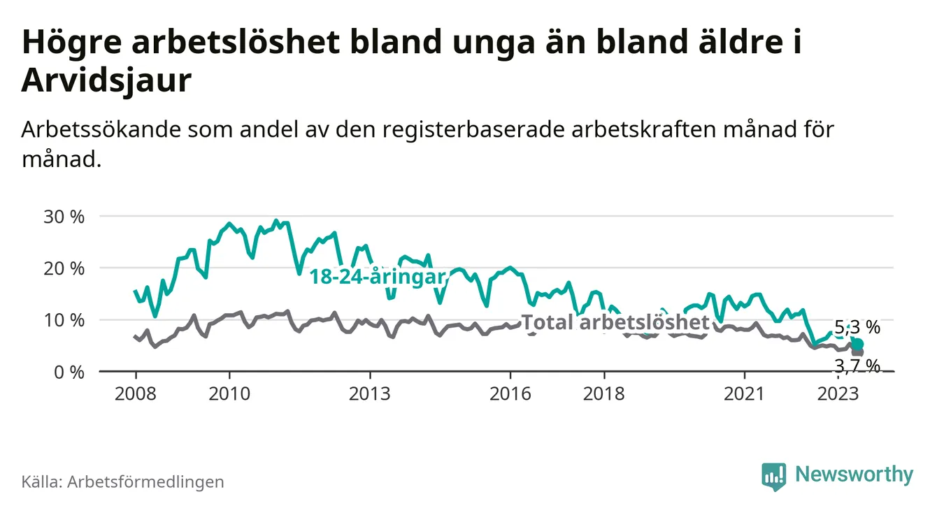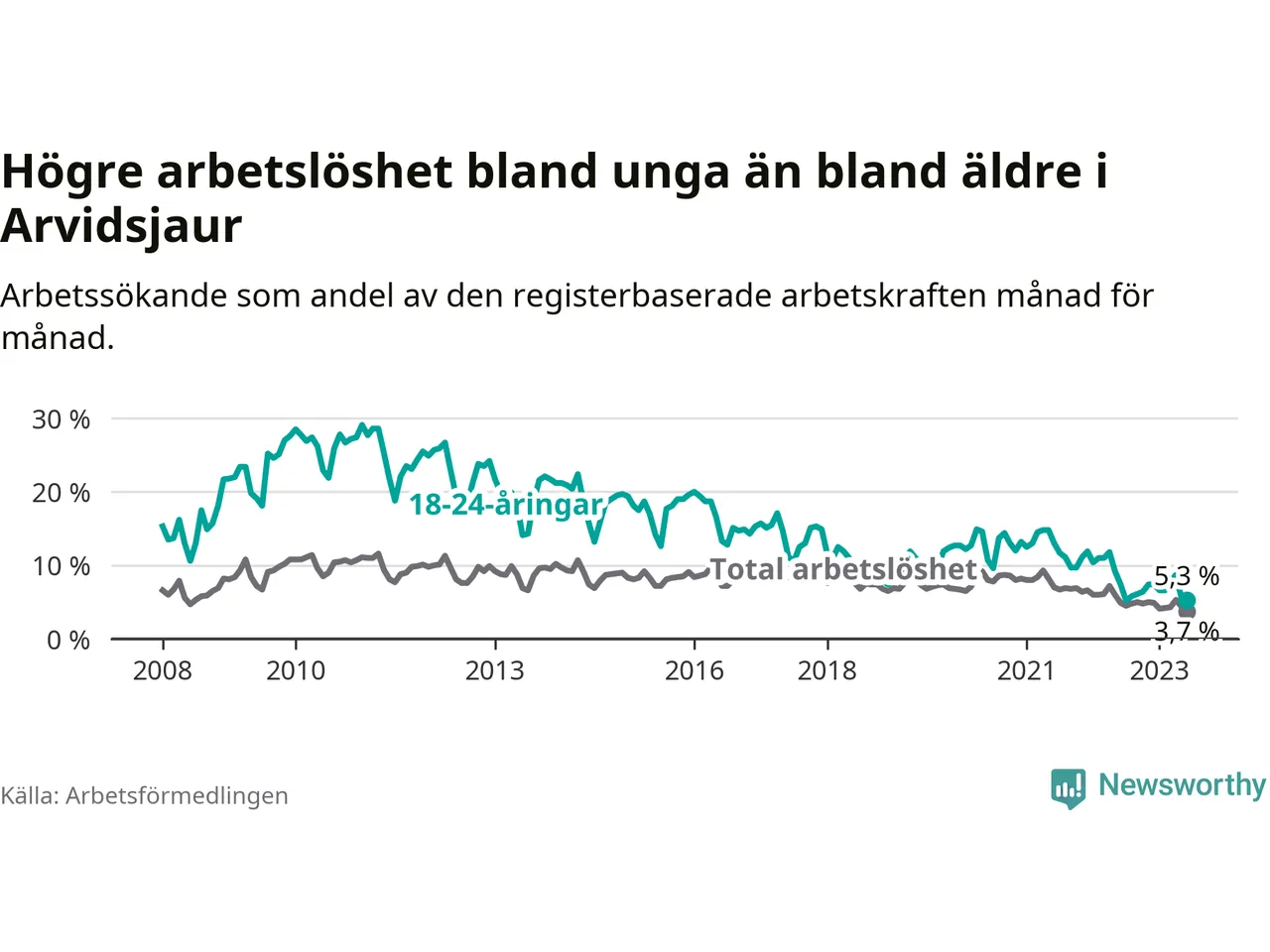 Medan Arvidsjaur har lägre total arbetslöshet än Norrbotten, ligger ungdomsarbetslösheten 0,6 procentenheter högre i Arvidsjaur.