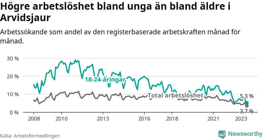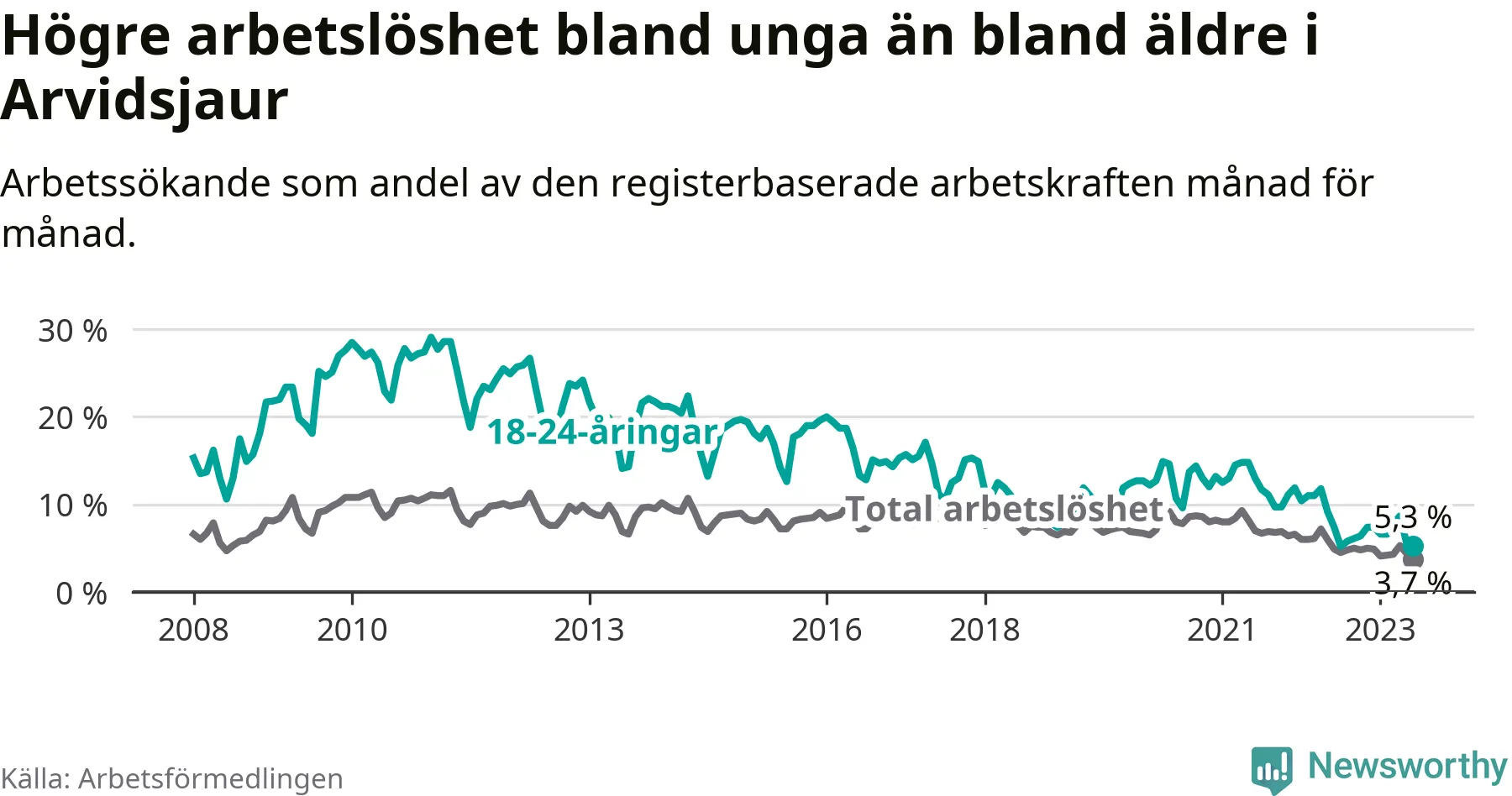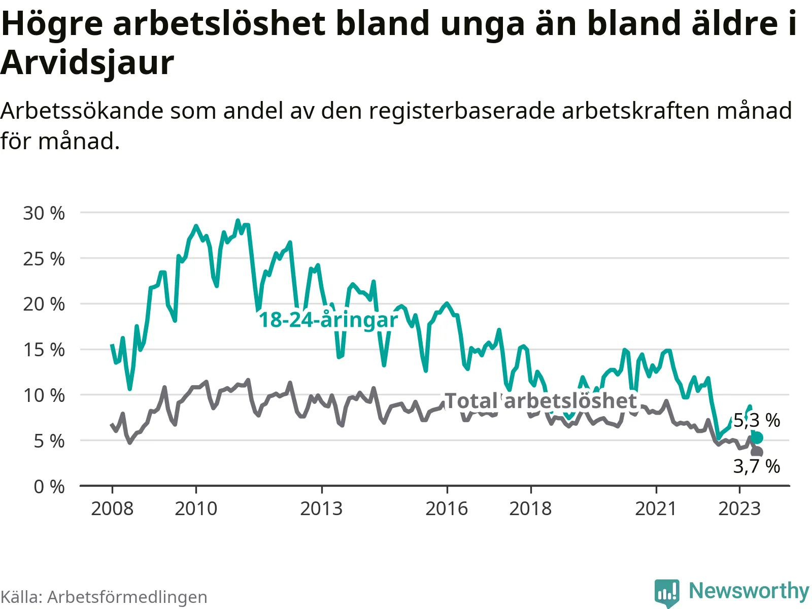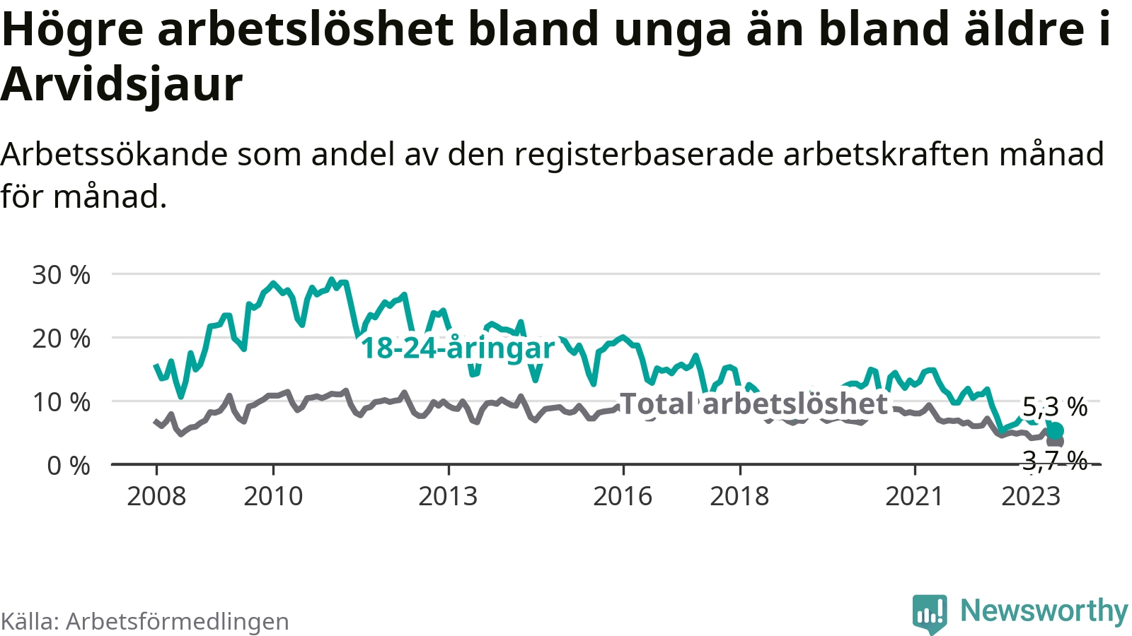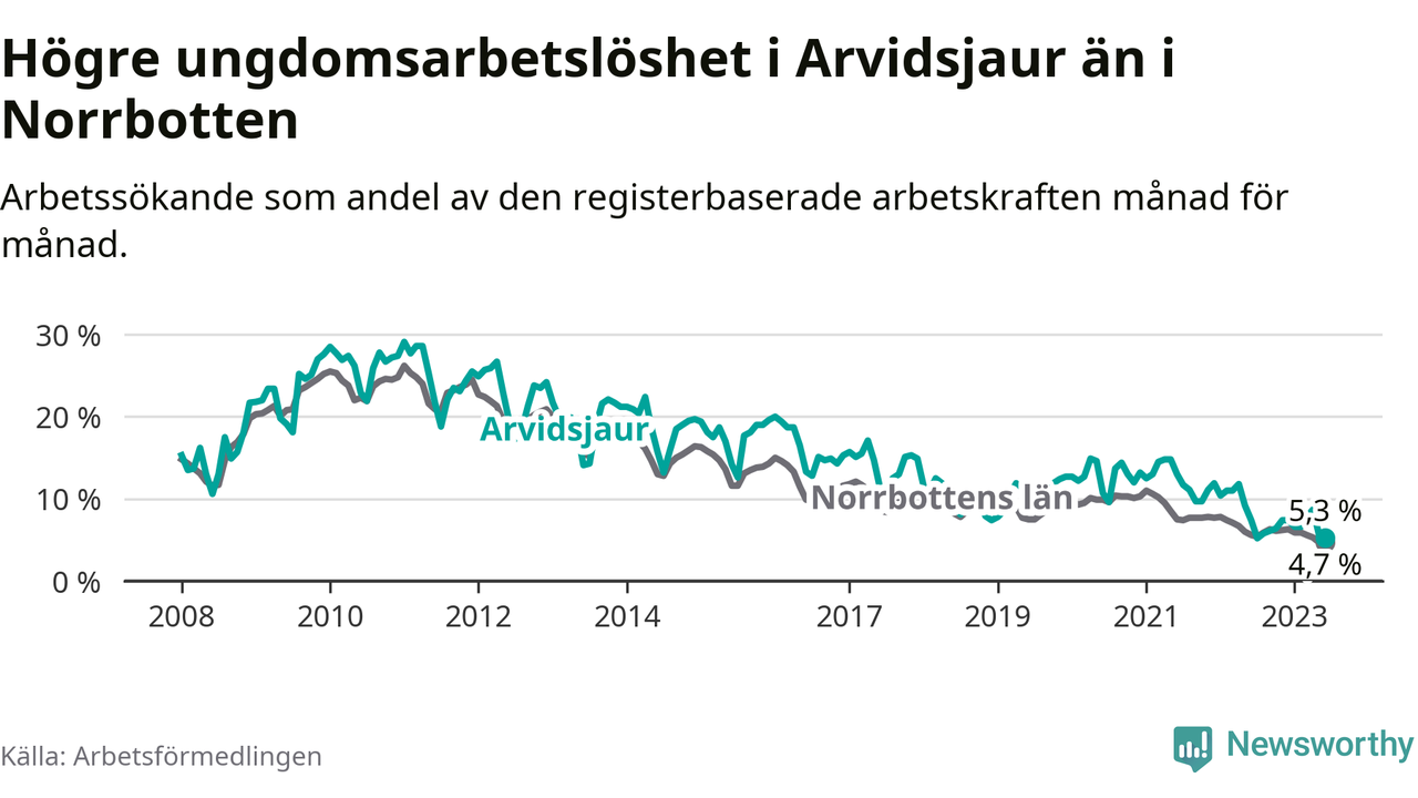 Medan Arvidsjaur har lägre total arbetslöshet än Norrbotten, ligger ungdomsarbetslösheten 0,6 procentenheter högre i Arvidsjaur.